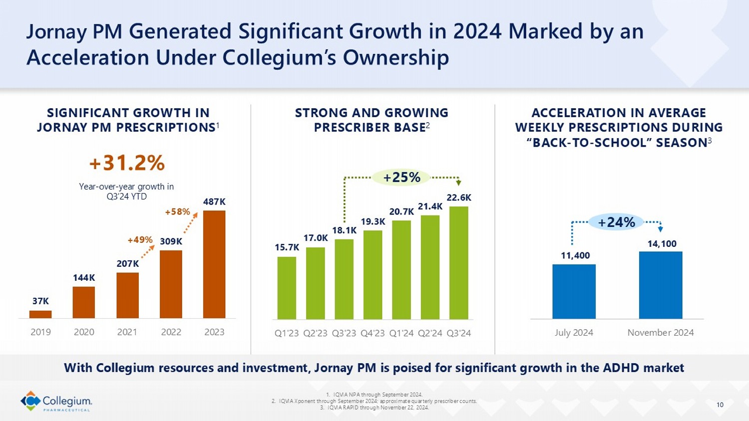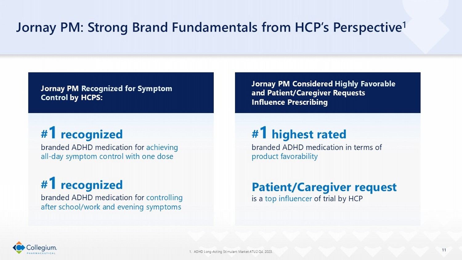 11,400 14,100 July 2024 November 2024 10 Jornay PM Generated Significant Growth in 2024 Marked by an Acceleration Under Collegium’s Ownership STRONG AND GROWING PRESCRIBER BASE 2 ACCELERATION IN AVERAGE WEEKLY PRESCRIPTIONS DURING “BACK - TO - SCHOOL” SEASON 3 15.7K 17.0K 18.1K 19.3K 20.7K 21.4K 22.6K Q1'23 Q2'23 Q3'23 Q4'23 Q1'24 Q2'24 Q3'24 +25% +24% 1. IQVIA NPA through September 2024. 2. IQVIA Xponent through September 2024; approximate quarterly prescriber counts. 3. IQVIA RAPID through November 22, 2024. +31.2% Year - over - year growth in Q3’24 YTD SIGNIFICANT GROWTH IN JORNAY PM PRESCRIPTIONS 1 With Collegium resources and investment, Jornay PM is poised for significant growth in the ADHD market 37K 144K 207K 309K 487K 2019 2020 2021 2022 2023 +49% +58%