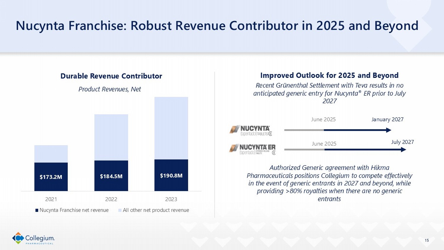 14 Well Positioned to Maximize and Enhance Durability of Pain Portfolio $103.7M $138.8M $177.4M 2021 2022 2023 $128.9M $139.9M 3Q23 YTD 3Q24 YTD +9% $148.2M 1 $153.0M 2 $182.1M 2021 2022 2023 $132.8M $156.1M 3Q23 YTD 3Q24 YTD +18% +3% +19% +34% +28% 1. This financial data was provided by BioDelivery Sciences International, Inc. in its Annual Report on Form 10 - K filed with the SEC on March 9, 2022 2. Collegium acquired Belbuca ® as part of the BDSI acquisition on March 22, 2022. Represents proforma Belbuca net revenue. 3. ATU (Awareness, Trial, & Usage) Market Research Study, fielded Q4 2022. # 1 highest rated branded ER opioid in terms of product differentiation and favorability 74 % of surveyed target HCPs plan to increase prescribing STRONG BRAND FUNDAMENTALS 3 # 1 highest rated ER oxycodone in terms of product differentiation and favorability 48 % of surveyed target HCPs plan to increase prescribing, while 60% plan to decrease prescribing of OxyContin SUCCESSFUL COMMERCIAL EXECUTION RESULTING IN SIGNIFICANT NET REVENUE GROWTH