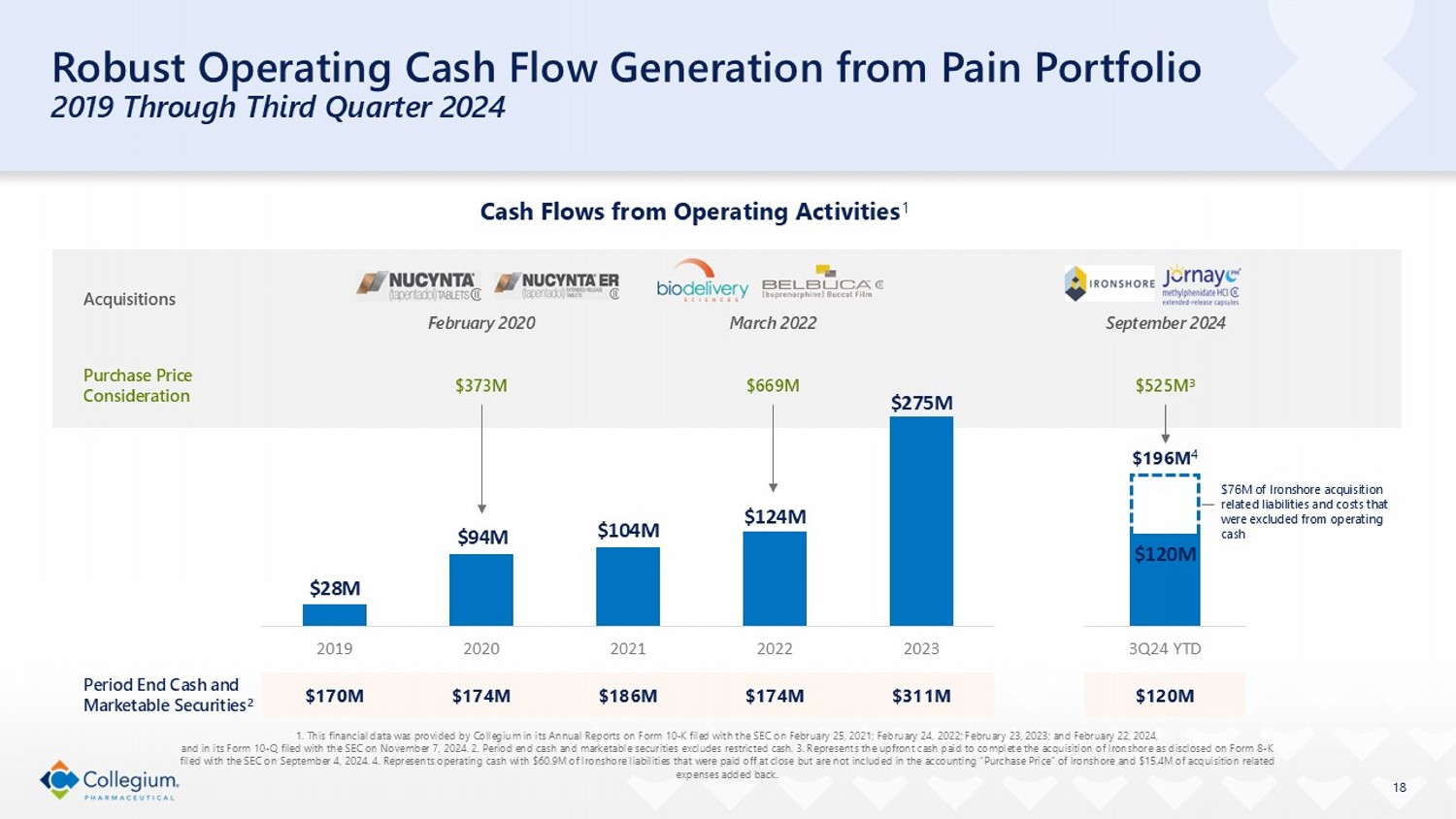 17 Track Record of Strong Top - and Bottom - Line Growth GROW LEVERAGE EXPAND 1. This financial data was provided by Collegium in its Annual Report on Form 10 - K filed with the SEC on February 23, 2023. 2. This financial data was provided by Collegium in its Annual Report on Form 10 - K filed with the SEC on February 22, 2024. 3. This financial data was provided by Collegium in its press release filed with the SEC on November 7, 2024, and represents the mid - point of 2024 financial guidance ranges. 4. This financial data was provided by Collegium in its press release filed with the SEC on January 8, 2025, and represents the mid - point of 2025 financial guidance ranges. 5. Represents a non - GAAP financial measure. Refer to “Non - GAAP Financial Measures” on slide 2. $277M 1 $464M 2 $567M 2 $628M 3 $743M 4 2021 2022 2023 2024E 2025E Product Revenues, Net $101M 1 $122M 2 $124M 2 $153M 3 $225M 4 2021 2022 2023 2024E 2025E Adjusted Operating Expenses 5 $118M 1 $266M 2 $367M 2 $400M 3 $443M 4 2021 2022 2023 2024E 2025E Adjusted EBITDA 5
