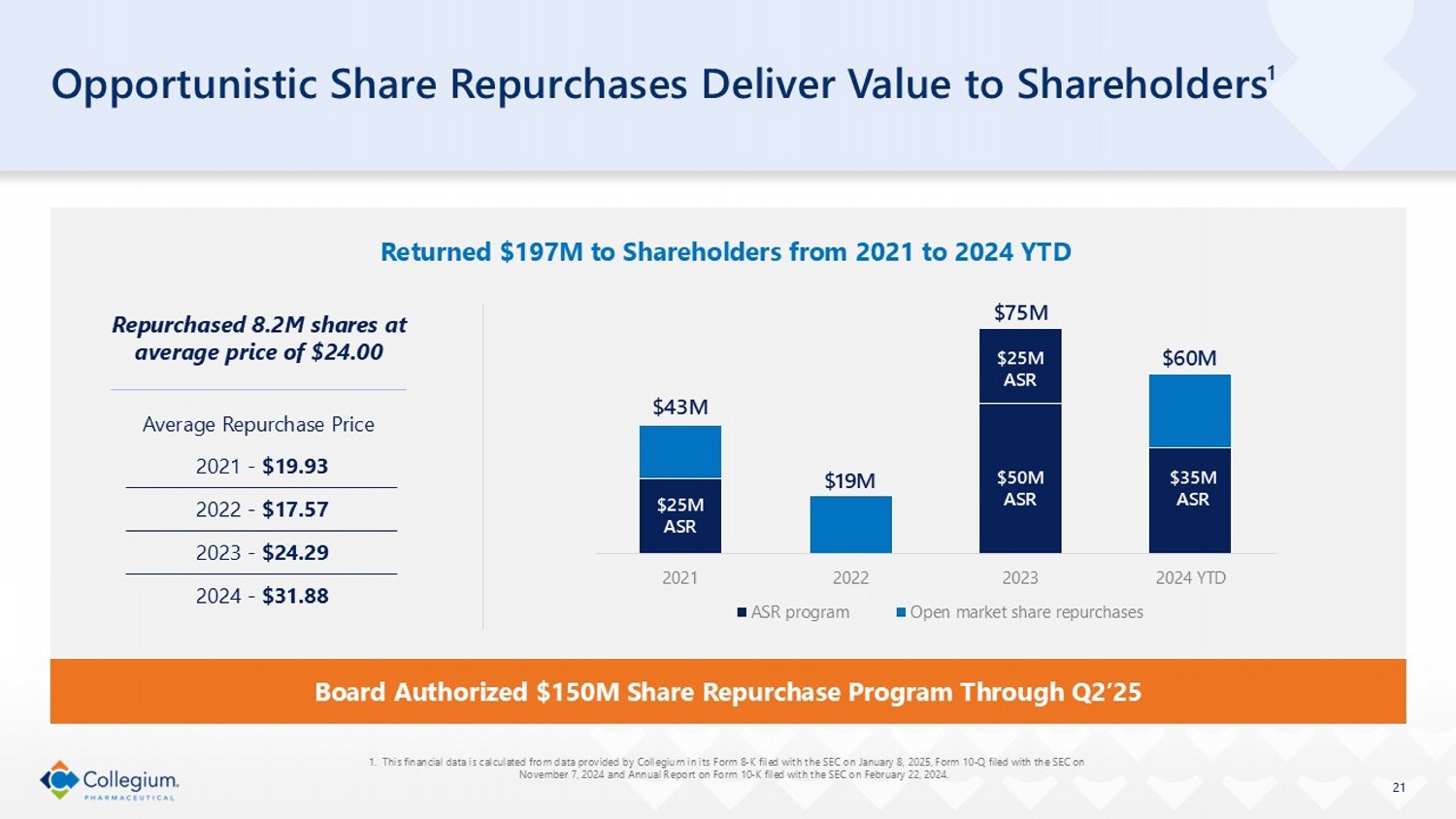 $104M $139M $177M $173M $325M $390M 2021 2022 2023 2024E 2025E 20 Track Record of Successful Business Development Drives Top - and Bottom - Line Growth 1. Represents the sum of the purchase price consideration paid for the Nucynta Acquisition in 2020, the BDSI Acquisition in 2 022 , and the upfront cash paid to complete the Ironshore acquisition in 2024 as disclosed on Annual Report on Form 10 - K filed with the SEC on February 25, 2021, Annual Report on Form 10 - K filed with the SEC on February 23, 2023, and Form 8 - K filed with t he SEC on September 4, 2024, respectively. 2. This financial data was provided by Collegium on Form 10 - K filed with the SEC on February 23, 2023. 3. This financial data was provided by Collegium on Form 10 - K filed with the SEC on February 22, 2024. 4. Represents the midpoint of 2024 and 2025 guidance ranges provided by Collegium on Form 8 - K filed with the SEC on November 7, 2024, and January 8, 2025, respectively. 5. Represents Xtampza ® ER product revenues. 6. Represents Nucynta ® , Nucynta ER, Belbuca, Symproic ® , and Other product revenues. 7. Represents a non - GAAP financial measure. Refer to “Non - GAAP Financial Measures” on slide 2. $1.6B Invested in Acquisitions 1 Nucynta Franchise (February 2020) Impact of Accretive Acquisitions $277M 2 $464M 3 $567M 3 $118M 2 $266M 3 $367M 3 $400M 4 $443M 4 2021 2022 2023 2024E 2025E Revenue – organic 5 Revenue – acquisition 6 $628M 4 $743M 4 Product Revenues, Net Adjusted EBITDA 7 BDSI (March 2022) Ironshore Therapeutics (September 2024)