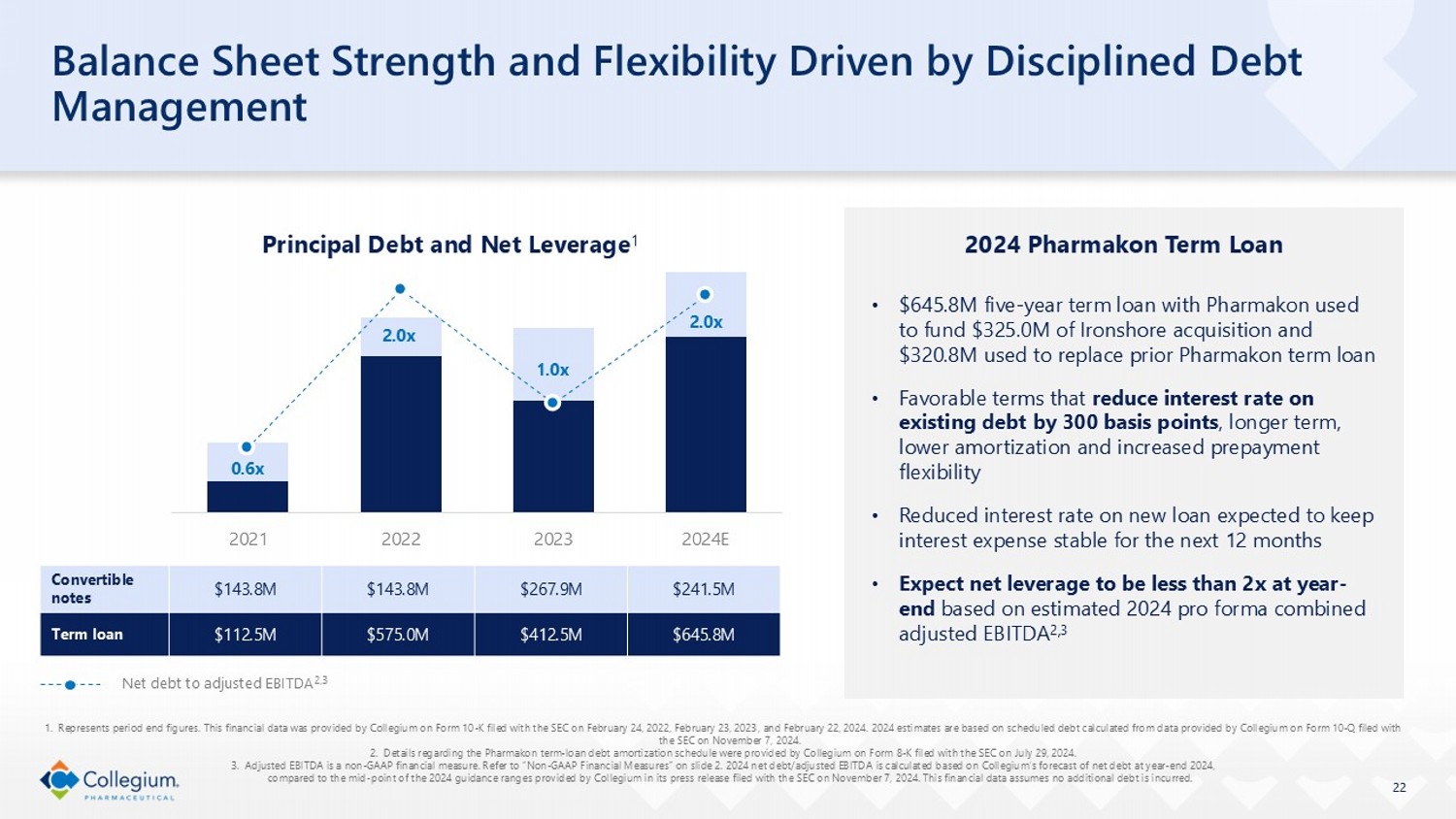 2021 2022 2023 2024 YTD ASR program Open market share repurchases 21 Opportunistic Share Repurchases Deliver Value to Shareholders 1 1. This financial data is calculated from data provided by Collegium in its Form 8 - K filed with the SEC on January 8, 2025, Form 10 - Q filed with the SEC on November 7, 2024 and Annual Report on Form 10 - K filed with the SEC on February 22, 2024. $43M $19M $75M $25M ASR $50M ASR $25M ASR Repurchased 8.2M shares at average price of $24.00 Board Authorized $150M Share Repurchase Program Through Q2’25 Average Repurchase Price Returned $197M to Shareholders from 2021 to 2024 YTD 2021 - $19.93 2022 - $17.57 2023 - $24.29 2024 - $31.88 $35M ASR $60M