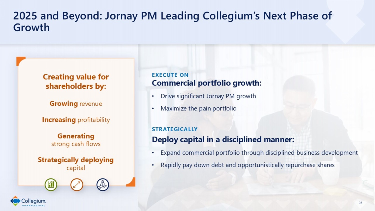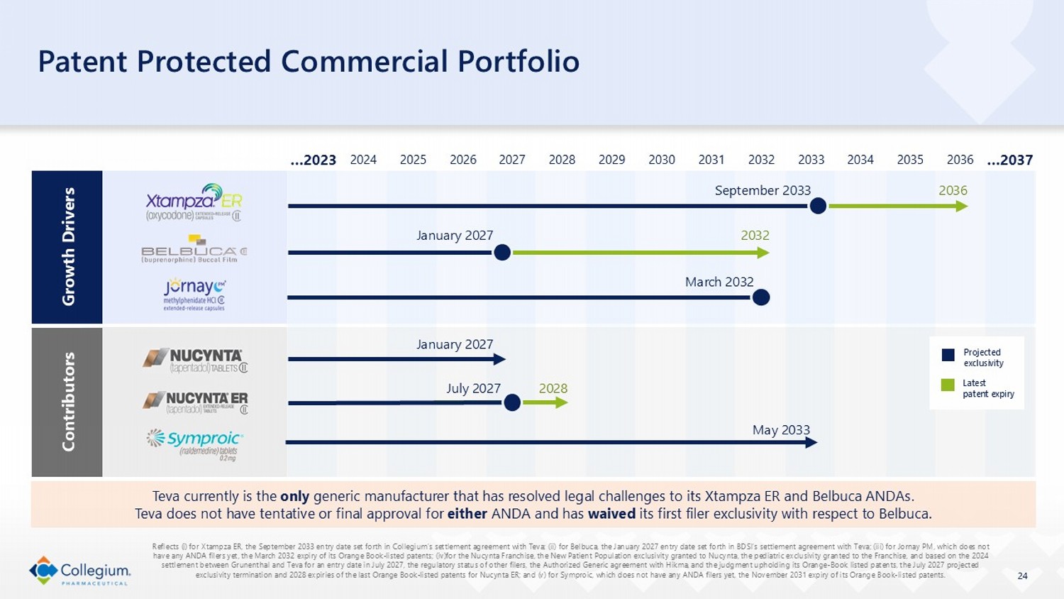 24 Patent Protected Commercial Portfolio Reflects ( i ) for Xtampza ER, the September 2033 entry date set forth in Collegium’s settlement agreement with Teva; (ii) for Belbuca , the January 2027 entry date set forth in BDSI’s settlement agreement with Teva; (iii) for Jornay PM, which does not have any ANDA filers yet, the March 2032 expiry of its Orange Book - listed patents; (iv)for the Nucynta Franchise, the New Patien t Population exclusivity granted to Nucynta, the pediatric exclusivity granted to the Franchise, and based on the 2024 settlement between Grunenthal and Teva for an entry date in July 2027, the regulatory status of other filers, the Authorized Generic agreement with Hikma, an d the judgment upholding its Orange - Book listed patents, the July 2027 projected exclusivity termination and 2028 expiries of the last Orange Book - listed patents for Nucynta ER; and (v) for Symproic , which does not have any ANDA filers yet, the November 2031 expiry of its Orange Book - listed patents. Teva currently is the only generic manufacturer that has resolved legal challenges to its Xtampza ER and Belbuca ANDAs. Teva does not have tentative or final approval for either ANDA and has waived its first filer exclusivity with respect to Belbuca . September 2033 Growth Drivers Contributors …2023 2024 2025 2026 2027 2028 2029 2030 2031 2032 2033 2034 2035 2036 …2037 January 2027 January 2027 July 2027 May 2033 Projected exclusivity Latest patent expiry 2036 2032 2028 March 2032