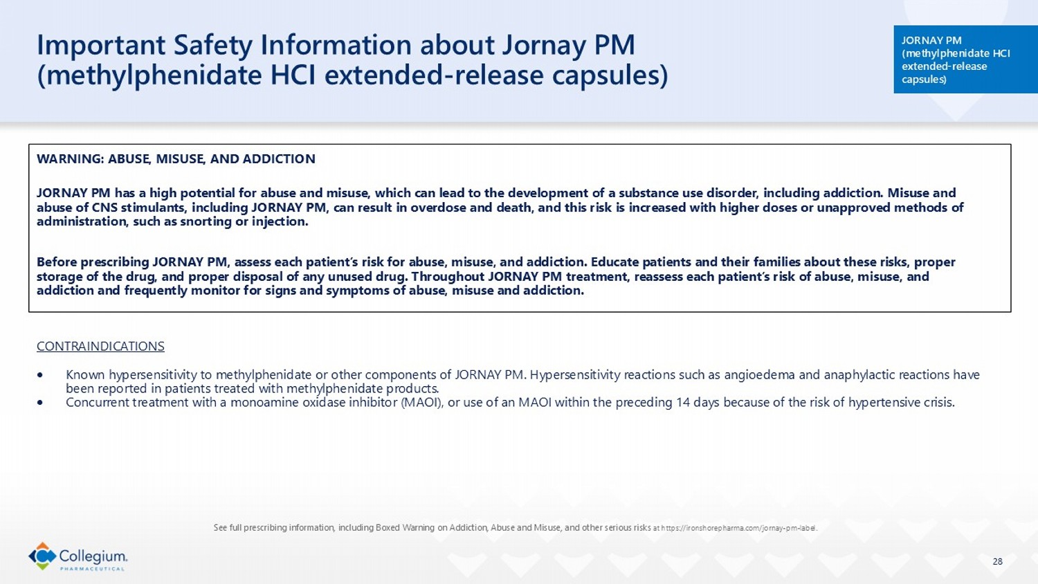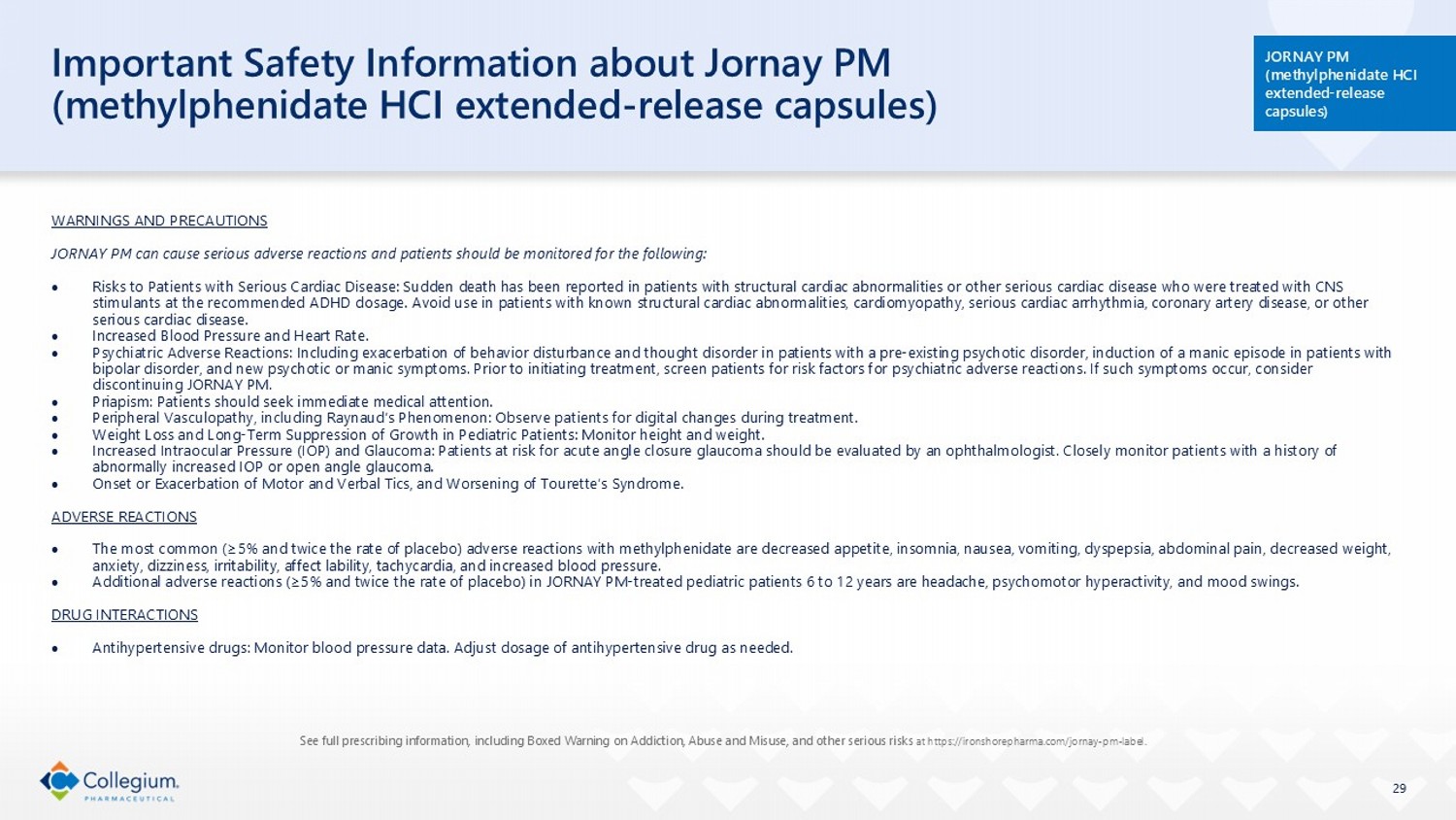28 Important Safety Information about Jornay PM (methylphenidate HCI extended - release capsules) WARNING: ABUSE, MISUSE, AND ADDICTION JORNAY PM has a high potential for abuse and misuse, which can lead to the development of a substance use disorder, including ad diction. Misuse and abuse of CNS stimulants, including JORNAY PM, can result in overdose and death, and this risk is increased with higher doses or unapproved methods of administration, such as snorting or injection. Before prescribing JORNAY PM, assess each patient’s risk for abuse, misuse, and addiction. Educate patients and their familie s a bout these risks, proper storage of the drug, and proper disposal of any unused drug. Throughout JORNAY PM treatment, reassess each patient’s risk of abu se, misuse, and addiction and frequently monitor for signs and symptoms of abuse, misuse and addiction. CONTRAINDICATIONS Known hypersensitivity to methylphenidate or other components of JORNAY PM. Hypersensitivity reactions such as angioedema and an aphylactic reactions have been reported in patients treated with methylphenidate products. Concurrent treatment with a monoamine oxidase inhibitor (MAOI), or use of an MAOI within the preceding 14 days because of the ri sk of hypertensive crisis. See full prescribing information, including Boxed Warning on Addiction, Abuse and Misuse, and other serious risks at https:// ironshorepharma.com/jornay - pm - label. JORNAY PM (methylphenidate HCI extended - release capsules)