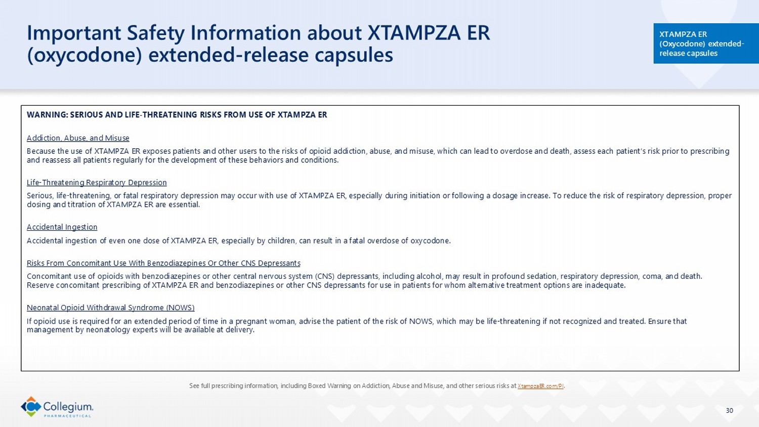 30 Important Safety Information about XTAMPZA ER (oxycodone) extended - release capsules WARNING: SERIOUS AND LIFE - THREATENING RISKS FROM USE OF XTAMPZA ER Addiction, Abuse, and Misuse Because the use of XTAMPZA ER exposes patients and other users to the risks of opioid addiction, abuse, and misuse, which can le ad to overdose and death, assess each patient’s risk prior to prescribing and reassess all patients regularly for the development of these behaviors and conditions. Life - Threatening Respiratory Depression Serious, life - threatening, or fatal respiratory depression may occur with use of XTAMPZA ER, especially during initiation or fol lowing a dosage increase. To reduce the risk of respiratory depression, proper dosing and titration of XTAMPZA ER are essential. Accidental Ingestion Accidental ingestion of even one dose of XTAMPZA ER, especially by children, can result in a fatal overdose of oxycodone. Risks From Concomitant Use With Benzodiazepines Or Other CNS Depressants Concomitant use of opioids with benzodiazepines or other central nervous system (CNS) depressants, including alcohol, may res ult in profound sedation, respiratory depression, coma, and death. Reserve concomitant prescribing of XTAMPZA ER and benzodiazepines or other CNS depressants for use in patients for whom alter nat ive treatment options are inadequate. Neonatal Opioid Withdrawal Syndrome (NOWS) If opioid use is required for an extended period of time in a pregnant woman, advise the patient of the risk of NOWS, which m ay be life - threatening if not recognized and treated. Ensure that management by neonatology experts will be available at delivery. See full prescribing information, including Boxed Warning on Addiction, Abuse and Misuse, and other serious risks at XtampzaER.com/PI . XTAMPZA ER (Oxycodone) extended - release capsules