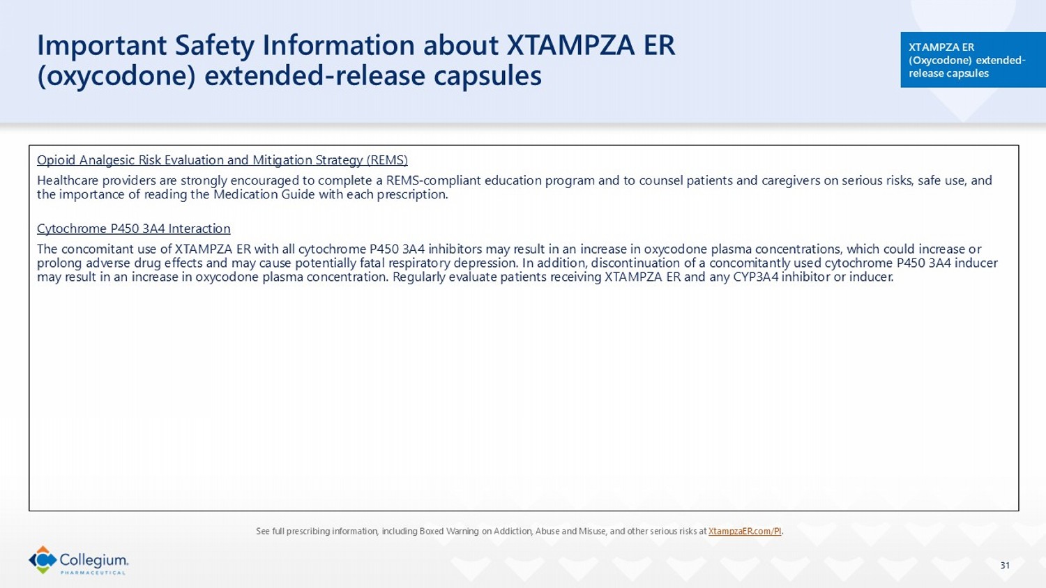 31 Important Safety Information about XTAMPZA ER (oxycodone) extended - release capsules Opioid Analgesic Risk Evaluation and Mitigation Strategy (REMS) Healthcare providers are strongly encouraged to complete a REMS - compliant education program and to counsel patients and caregive rs on serious risks, safe use, and the importance of reading the Medication Guide with each prescription. Cytochrome P450 3A4 Interaction The concomitant use of XTAMPZA ER with all cytochrome P450 3A4 inhibitors may result in an increase in oxycodone plasma conce ntr ations, which could increase or prolong adverse drug effects and may cause potentially fatal respiratory depression. In addition, discontinuation of a concom ita ntly used cytochrome P450 3A4 inducer may result in an increase in oxycodone plasma concentration. Regularly evaluate patients receiving XTAMPZA ER and any CYP3A4 inh ibitor or inducer. See full prescribing information, including Boxed Warning on Addiction, Abuse and Misuse, and other serious risks at XtampzaER.com/PI . XTAMPZA ER (Oxycodone) extended - release capsules