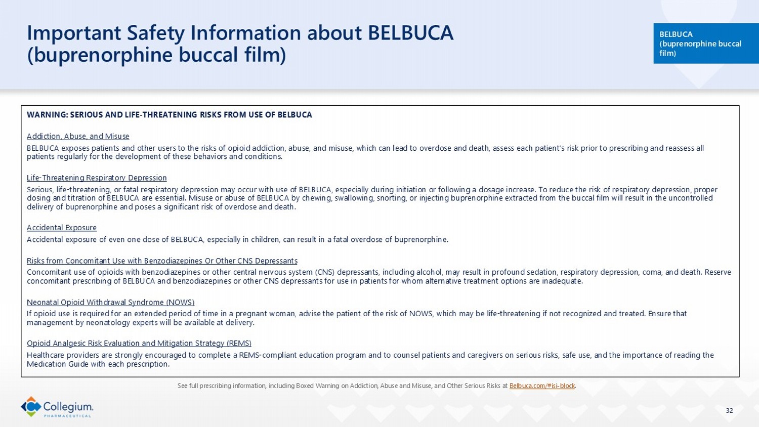 32 Important Safety Information about BELBUCA (buprenorphine buccal film) WARNING: SERIOUS AND LIFE - THREATENING RISKS FROM USE OF BELBUCA Addiction, Abuse, and Misuse BELBUCA exposes patients and other users to the risks of opioid addiction, abuse, and misuse, which can lead to overdose and dea th, assess each patient’s risk prior to prescribing and reassess all patients regularly for the development of these behaviors and conditions. Life - Threatening Respiratory Depression Serious, life - threatening, or fatal respiratory depression may occur with use of BELBUCA, especially during initiation or follow ing a dosage increase. To reduce the risk of respiratory depression, proper dosing and titration of BELBUCA are essential. Misuse or abuse of BELBUCA by chewing, swallowing, snorting, or injecting bupr eno rphine extracted from the buccal film will result in the uncontrolled delivery of buprenorphine and poses a significant risk of overdose and death. Accidental Exposure Accidental exposure of even one dose of BELBUCA, especially in children, can result in a fatal overdose of buprenorphine. Risks from Concomitant Use with Benzodiazepines Or Other CNS Depressants Concomitant use of opioids with benzodiazepines or other central nervous system (CNS) depressants, including alcohol, may res ult in profound sedation, respiratory depression, coma, and death. Reserve concomitant prescribing of BELBUCA and benzodiazepines or other CNS depressants for use in patients for whom alternative trea tme nt options are inadequate. Neonatal Opioid Withdrawal Syndrome (NOWS) If opioid use is required for an extended period of time in a pregnant woman, advise the patient of the risk of NOWS, which m ay be life - threatening if not recognized and treated. Ensure that management by neonatology experts will be available at delivery. Opioid Analgesic Risk Evaluation and Mitigation Strategy (REMS) Healthcare providers are strongly encouraged to complete a REMS - compliant education program and to counsel patients and caregive rs on serious risks, safe use, and the importance of reading the Medication Guide with each prescription. See full prescribing information, including Boxed Warning on Addiction, Abuse and Misuse, and Other Serious Risks at Belbuca.com/#isi - block . BELBUCA (buprenorphine buccal film)
