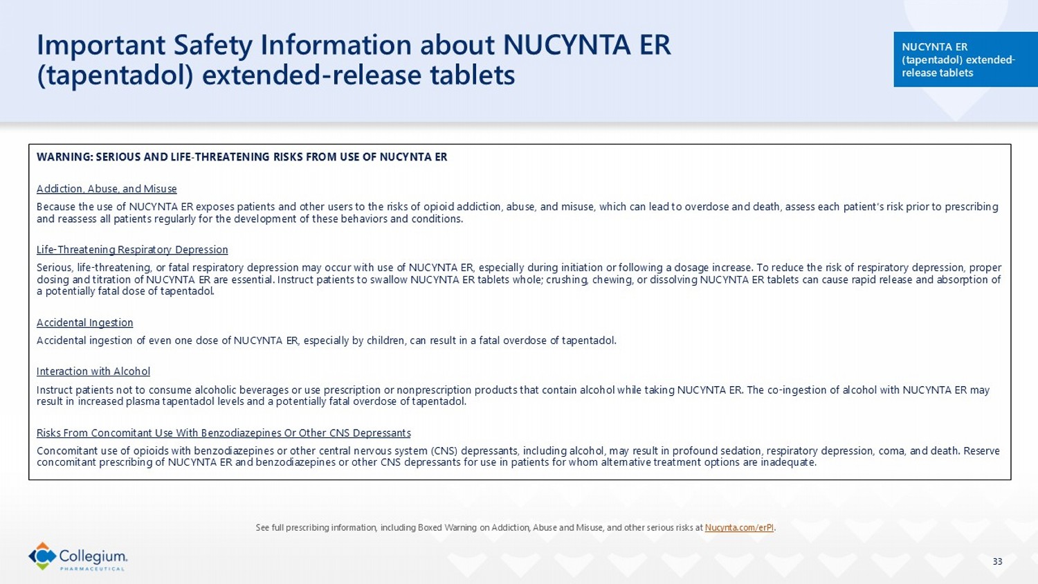 33 Important Safety Information about NUCYNTA ER (tapentadol) extended - release tablets WARNING: SERIOUS AND LIFE - THREATENING RISKS FROM USE OF NUCYNTA ER Addiction, Abuse, and Misuse Because the use of NUCYNTA ER exposes patients and other users to the risks of opioid addiction, abuse, and misuse, which can le ad to overdose and death, assess each patient’s risk prior to prescribing and reassess all patients regularly for the development of these behaviors and conditions. Life - Threatening Respiratory Depression Serious, life - threatening, or fatal respiratory depression may occur with use of NUCYNTA ER, especially during initiation or fol lowing a dosage increase. To reduce the risk of respiratory depression, proper dosing and titration of NUCYNTA ER are essential. Instruct patients to swallow NUCYNTA ER tablets whole; crushing, chewing, o r d issolving NUCYNTA ER tablets can cause rapid release and absorption of a potentially fatal dose of tapentadol . Accidental Ingestion Accidental ingestion of even one dose of NUCYNTA ER, especially by children, can result in a fatal overdose of tapentadol . Interaction with Alcohol Instruct patients not to consume alcoholic beverages or use prescription or nonprescription products that contain alcohol whi le taking NUCYNTA ER. The co - ingestion of alcohol with NUCYNTA ER may result in increased plasma tapentadol levels and a potentially fatal overdose of tapentadol . Risks From Concomitant Use With Benzodiazepines Or Other CNS Depressants Concomitant use of opioids with benzodiazepines or other central nervous system (CNS) depressants, including alcohol, may res ult in profound sedation, respiratory depression, coma, and death. Reserve concomitant prescribing of NUCYNTA ER and benzodiazepines or other CNS depressants for use in patients for whom alternative t rea tment options are inadequate. NUCYNTA ER (tapentadol) extended - release tablets See full prescribing information, including Boxed Warning on Addiction, Abuse and Misuse, and other serious risks at Nucynta.com/erPI .