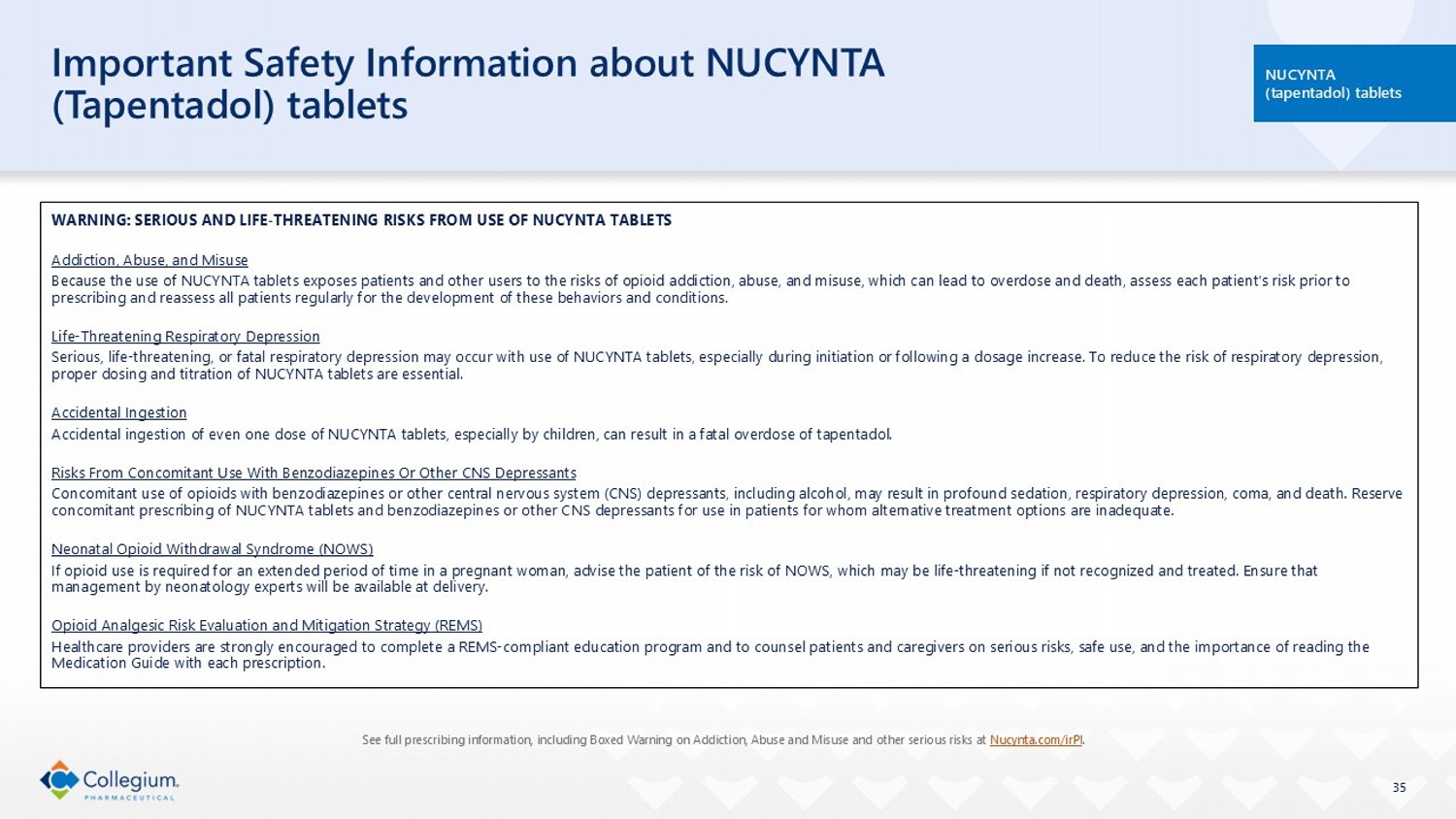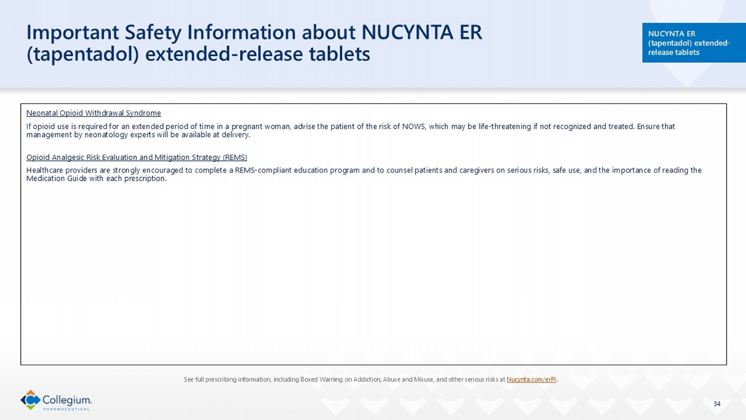 34 Important Safety Information about NUCYNTA ER (tapentadol) extended - release tablets Neonatal Opioid Withdrawal Syndrome If opioid use is required for an extended period of time in a pregnant woman, advise the patient of the risk of NOWS, which m ay be life - threatening if not recognized and treated. Ensure that management by neonatology experts will be available at delivery. Opioid Analgesic Risk Evaluation and Mitigation Strategy (REMS) Healthcare providers are strongly encouraged to complete a REMS - compliant education program and to counsel patients and caregive rs on serious risks, safe use, and the importance of reading the Medication Guide with each prescription. See full prescribing information, including Boxed Warning on Addiction, Abuse and Misuse, and other serious risks at Nucynta.com/erPI . NUCYNTA ER (tapentadol) extended - release tablets