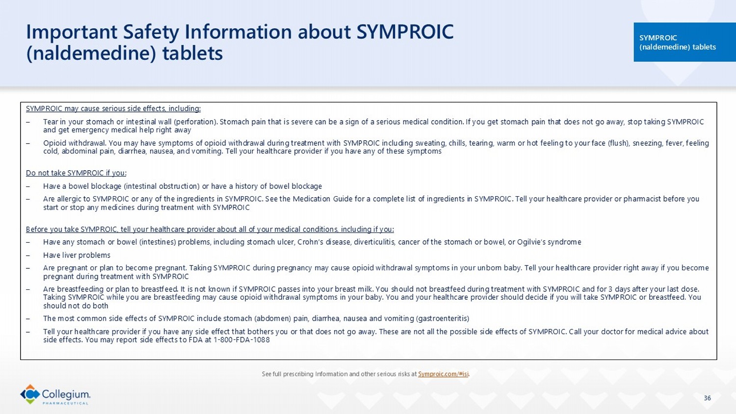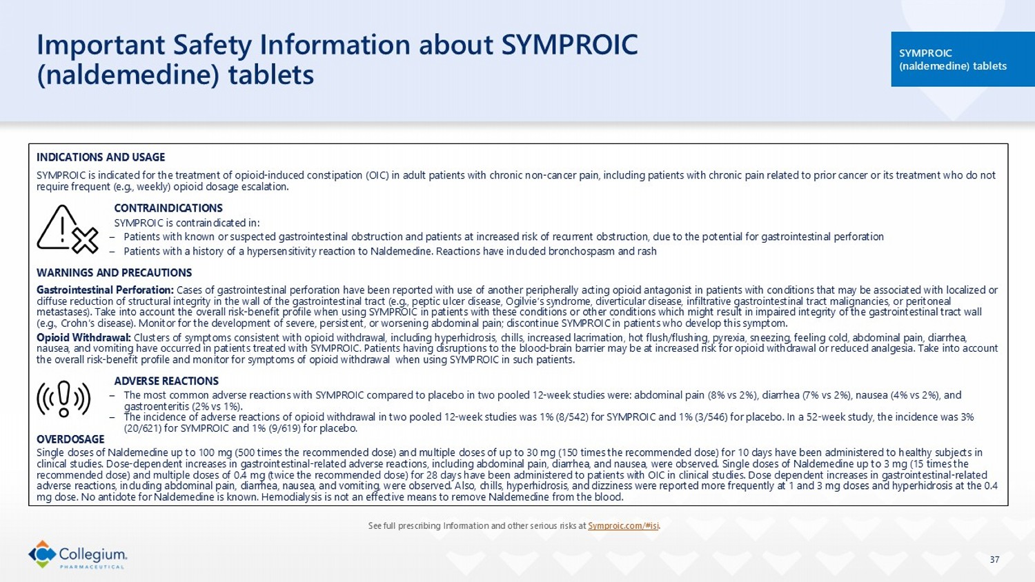 36 Important Safety Information about SYMPROIC (naldemedine) tablets SYMPROIC may cause serious side effects, including: – Tear in your stomach or intestinal wall (perforation). Stomach pain that is severe can be a sign of a serious medical conditi on. If you get stomach pain that does not go away, stop taking SYMPROIC and get emergency medical help right away – Opioid withdrawal. You may have symptoms of opioid withdrawal during treatment with SYMPROIC including sweating, chills, tear ing , warm or hot feeling to your face (flush), sneezing, fever, feeling cold, abdominal pain, diarrhea, nausea, and vomiting. Tell your healthcare provider if you have any of these symptoms Do not take SYMPROIC if you: – Have a bowel blockage (intestinal obstruction) or have a history of bowel blockage – Are allergic to SYMPROIC or any of the ingredients in SYMPROIC. See the Medication Guide for a complete list of ingredients i n S YMPROIC. Tell your healthcare provider or pharmacist before you start or stop any medicines during treatment with SYMPROIC Before you take SYMPROIC, tell your healthcare provider about all of your medical conditions, including if you: – Have any stomach or bowel (intestines) problems, including stomach ulcer, Crohn’s disease, diverticulitis, cancer of the stom ach or bowel, or Ogilvie’s syndrome – Have liver problems – Are pregnant or plan to become pregnant. Taking SYMPROIC during pregnancy may cause opioid withdrawal symptoms in your unborn ba by. Tell your healthcare provider right away if you become pregnant during treatment with SYMPROIC – Are breastfeeding or plan to breastfeed. It is not known if SYMPROIC passes into your breast milk. You should not breastfeed dur ing treatment with SYMPROIC and for 3 days after your last dose. Taking SYMPROIC while you are breastfeeding may cause opioid withdrawal symptoms in your baby. You and your healthcare provid er should decide if you will take SYMPROIC or breastfeed. You should not do both – The most common side effects of SYMPROIC include stomach (abdomen) pain, diarrhea, nausea and vomiting (gastroenteritis) – Tell your healthcare provider if you have any side effect that bothers you or that does not go away. These are not all the po ssi ble side effects of SYMPROIC. Call your doctor for medical advice about side effects. You may report side effects to FDA at 1 - 800 - FDA - 1088 See full prescribing Information and other s erious risks at Symproic.com/#isi . SYMPROIC (naldemedine) tablets