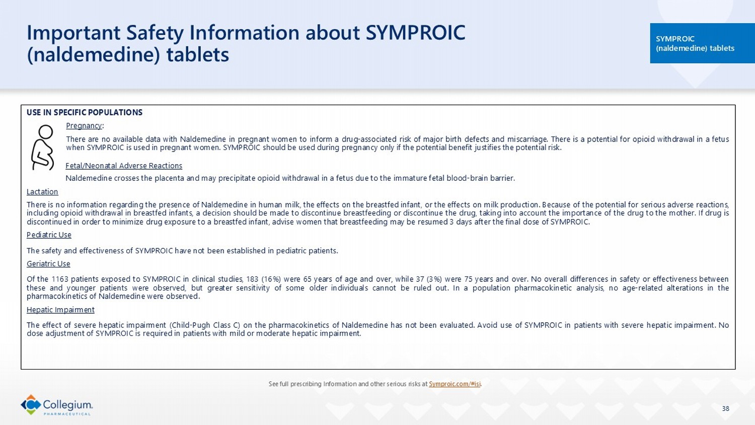 37 Important Safety Information about SYMPROIC ( naldemedine ) tablets INDICATIONS AND USAGE SYMPROIC is indicated for the treatment of opioid - induced constipation (OIC) in adult patients with chronic non - cancer pain, inc luding patients with chronic pain related to prior cancer or its treatment who do not require frequent (e.g., weekly) opioid dosage escalation. CONTRAINDICATIONS SYMPROIC is contraindicated in: – Patients with known or suspected gastrointestinal obstruction and patients at increased risk of recurrent obstruction, due to th e potential for gastrointestinal perforation – Patients with a history of a hypersensitivity reaction to Naldemedine . Reactions have included bronchospasm and rash WARNINGS AND PRECAUTIONS Gastrointestinal Perforation: Cases of gastrointestinal perforation have been reported with use of another peripherally acting opioid antagonist in patient s w ith conditions that may be associated with localized or diffuse reduction of structural integrity in the wall of the gastrointestinal tract (e.g., peptic ulcer disease, Ogilvie’s sy ndr ome, diverticular disease, infiltrative gastrointestinal tract malignancies, or peritoneal metastases). Take into account the overall risk - benefit profile when using SYMPROIC in patients with these conditions or other c onditions which might result in impaired integrity of the gastrointestinal tract wall (e.g., Crohn’s disease). Monitor for the development of severe, persistent, or worsening abdominal pain; discontinue SYMPROIC in patients who develop this symptom. Opioid Withdrawal: Clusters of symptoms consistent with opioid withdrawal, including hyperhidrosis, chills, increased lacrimation, hot flush/flu shi ng, pyrexia, sneezing, feeling cold, abdominal pain, diarrhea, nausea, and vomiting have occurred in patients treated with SYMPROIC. Patients having disruptions to the blood - brain barrier may be at increased risk for opioid withdrawal or reduced analgesia. Take into account the overall risk - benefit profile and monitor for symptoms of opioid withdrawal when using SYMPROIC in such patients. ADVERSE REACTIONS – The most common adverse reactions with SYMPROIC compared to placebo in two pooled 12 - week studies were: abdominal pain (8% vs 2% ), diarrhea (7% vs 2%), nausea (4% vs 2%), and gastroenteritis (2% vs 1%). – The incidence of adverse reactions of opioid withdrawal in two pooled 12 - week studies was 1% (8/542) for SYMPROIC and 1% (3/546) for placebo. In a 52 - week study, the incidence was 3% (20/621) for SYMPROIC and 1% (9/619) for placebo. OVERDOSAGE Single doses of Naldemedine up to 100 mg (500 times the recommended dose) and multiple doses of up to 30 mg (150 times the recommended dose) for 10 days ha ve been administered to healthy subjects in clinical studies. Dose - dependent increases in gastrointestinal - related adverse reactions, including abdominal pain, diarrhea, an d nausea, were observed. Single doses of Naldemedine up to 3 mg (15 times the recommended dose) and multiple doses of 0.4 mg (twice the recommended dose) for 28 days have been administered to patients wi th OIC in clinical studies. Dose dependent increases in gastrointestinal - related adverse reactions, including abdominal pain, diarrhea, nausea, and vomiting, were observed. Also, chills, hyperhidrosis, and diz ziness were reported more frequently at 1 and 3 mg doses and hyperhidrosis at the 0.4 mg dose. No antidote for Naldemedine is known. Hemodialysis is not an effective means to remove Naldemedine from the blood. See full prescribing Information and other s erious risks at Symproic.com/#isi . SYMPROIC ( naldemedine ) tablets
