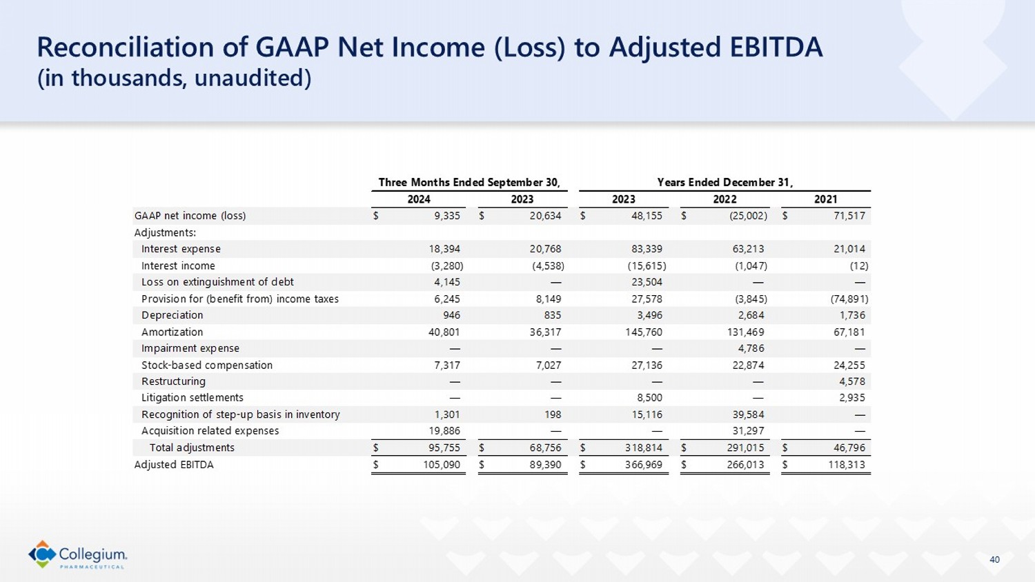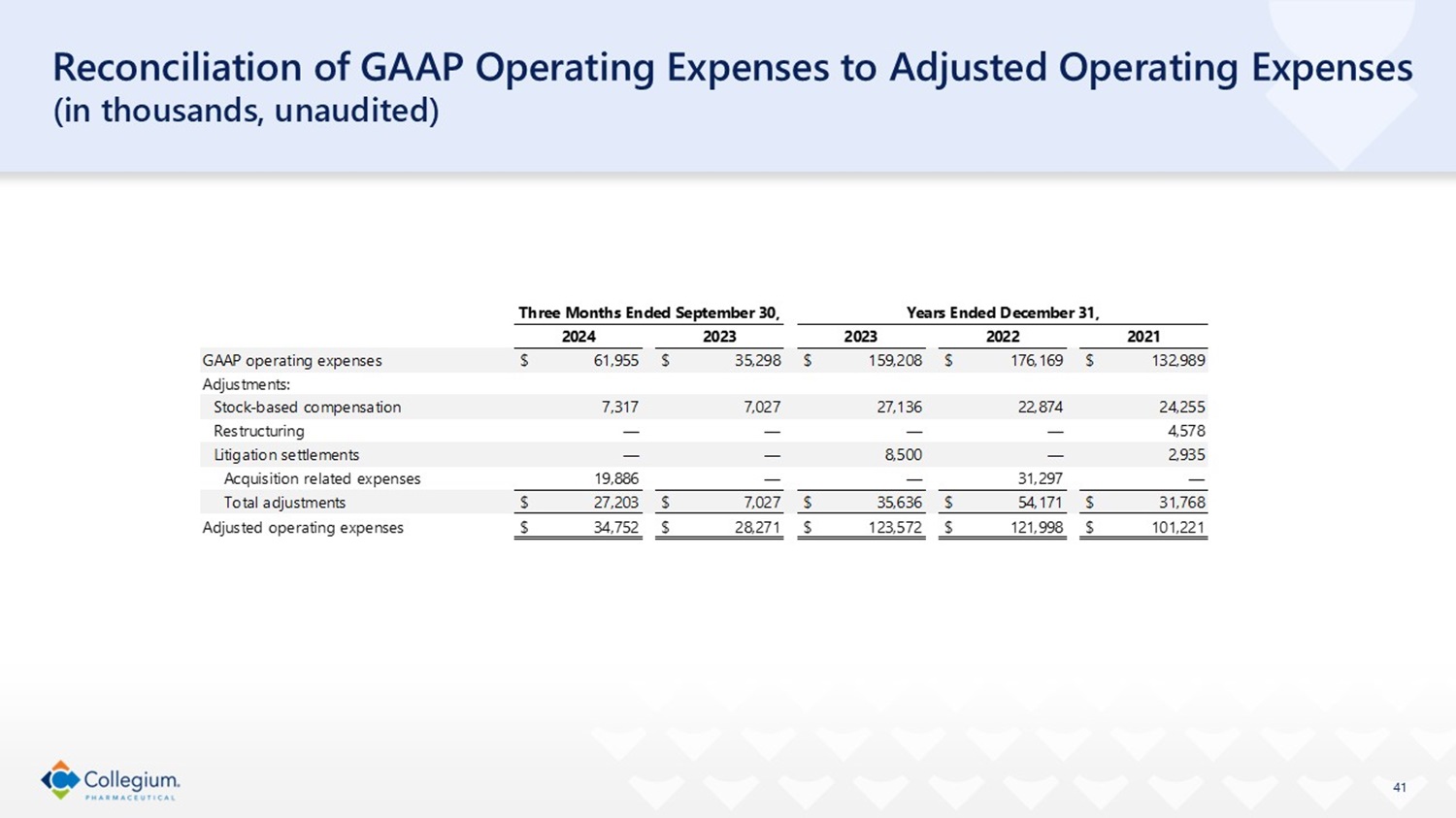 40 Reconciliation of GAAP Net Income (Loss) to Adjusted EBITDA (in thousands , unaudited) GAAP net income (loss) $ 9,335 $ 20,634 $ 48,155 $ (25,002) $ 71,517 Adjustments: Interest expense 18,394 20,768 83,339 63,213 21,014 Interest income (3,280) (4,538) (15,615) (1,047) (12) Loss on extinguishment of debt 4,145 — 23,504 — — Provision for (benefit from) income taxes 6,245 8,149 27,578 (3,845) (74,891) Depreciation 946 835 3,496 2,684 1,736 Amortization 40,801 36,317 145,760 131,469 67,181 Impairment expense — — — 4,786 — Stock-based compensation 7,317 7,027 27,136 22,874 24,255 Restructuring — — — — 4,578 Litigation settlements — — 8,500 — 2,935 Recognition of step-up basis in inventory 1,301 198 15,116 39,584 — Acquisition related expenses 19,886 — — 31,297 — Total adjustments $ 95,755 $ 68,756 $ 318,814 $ 291,015 $ 46,796 Adjusted EBITDA $ 105,090 $ 89,390 $ 366,969 $ 266,013 $ 118,313 2024 2022 20212023 Years Ended December 31, 2023 Three Months Ended September 30,