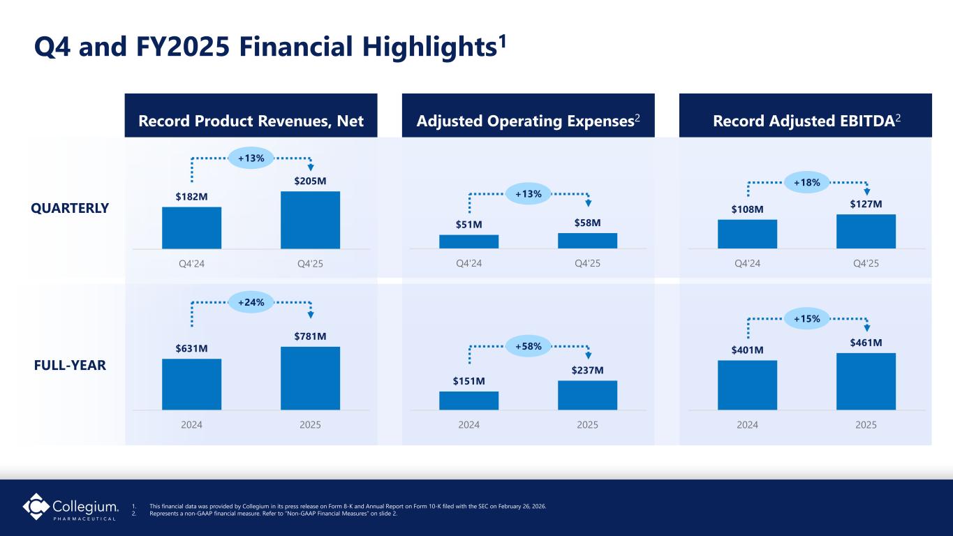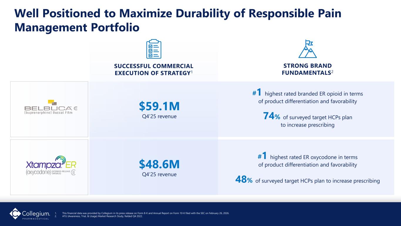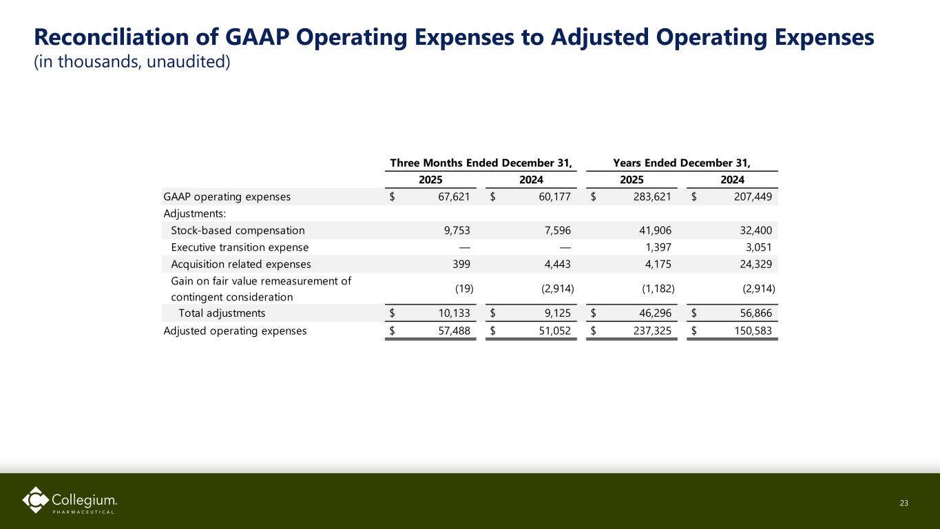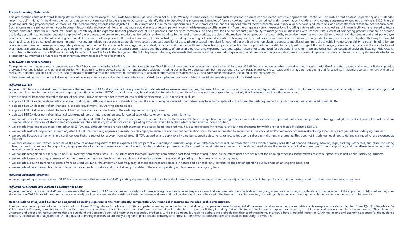 Forward-Looking Statements This presentation contains forward-looking statements within the meaning of The Private Securities Litigation Reform Act of 1995. We may, in some cases, use terms such as "predicts," "forecasts," "believes," "potential," "proposed," "continue," "estimates," "anticipates," "expects," "plans," "intends," "may," "could," "might," "should" or other words that convey uncertainty of future events or outcomes to identify these forward-looking statements. Examples of forward-looking statements contained in this presentation include, among others, statements related to our full-year 2026 financial guidance, including projected product revenues, adjusted operating expenses and adjusted EBITDA, current and future market opportunities for our products and our assumptions related thereto, expectations (financial or otherwise) and intentions, and other statements that are not historical facts. Such statements are subject to numerous important factors, risks and uncertainties that may cause actual events or results, performance, or achievements to differ materially from the company's current expectations, including risks relating to, among others: unknown liabilities; risks related to future opportunities and plans for our products, including uncertainty of the expected financial performance of such products; our ability to commercialize and grow sales of our products; our ability to manage our relationships with licensors; the success of competing products that are or become available; our ability to maintain regulatory approval of our products, and any related restrictions, limitations, and/or warnings in the label of our products; the size of the markets for our products, and our ability to service those markets; our ability to obtain reimbursement and third-party payor contracts for our products; the rate and degree of market acceptance of our products; the costs of commercialization activities, including marketing, sales and distribution; changing market conditions for our products; the outcome of any patent infringement or other litigation that may be brought by or against us; the outcome of any governmental investigation related to our business; our ability to secure adequate supplies of active pharmaceutical ingredient for each of our products and manufacture adequate supplies of commercially saleable inventory; our ability to obtain funding for our operations and business development; regulatory developments in the U.S.; our expectations regarding our ability to obtain and maintain sufficient intellectual property protection for our products; our ability to comply with stringent U.S. and foreign government regulation in the manufacture of pharmaceutical products, including U.S. Drug Enforcement Agency compliance; our customer concentration; and the accuracy of our estimates regarding expenses, revenues, capital requirements and need for additional financing. These and other risks are described under the heading "Risk Factors" in our Annual Reports on Form 10-K and Quarterly Reports on Form 10-Q and other filings with the SEC. Any forward-looking statements that we make in this presentation speak only as of the date of this presentation. We assume no obligation to update our forward-looking statements whether as a result of new information, future events or otherwise, after the date of this presentation. Non-GAAP Financial Measures To supplement our financial results presented on a GAAP basis, we have included information about certain non-GAAP financial measures. We believe the presentation of these non-GAAP financial measures, when viewed with our results under GAAP and the accompanying reconciliations, provide analysts, investors, lenders, and other third parties with insights into how we evaluate normal operational activities, including our ability to generate cash from operations, on a comparable year-over-year basis and manage our budgeting and forecasting. In addition, certain non-GAAP financial measures, primarily Adjusted EBITDA, are used to measure performance when determining components of annual compensation for substantially all non-sales force employees, including senior management. In this presentation, we discuss the following financial measures that are not calculated in accordance with GAAP, to supplement our consolidated financial statements presented on a GAAP basis. Adjusted EBITDA Adjusted EBITDA is a non-GAAP financial measure that represents GAAP net income or loss adjusted to exclude interest expense, interest income, the benefit from or provision for income taxes, depreciation, amortization, stock-based compensation, and other adjustments to reflect changes that occur in our business but do not represent ongoing operations. Adjusted EBITDA, as used by us, may be calculated differently from, and therefore may not be comparable to, similarly titled measures used by other companies. There are several limitations related to the use of adjusted EBITDA rather than net income or loss, which is the nearest GAAP equivalent, such as: • adjusted EBITDA excludes depreciation and amortization, and, although these are non-cash expenses, the assets being depreciated or amortized may have to be replaced in the future, the cash requirements for which are not reflected in adjusted EBITDA; • adjusted EBITDA does not reflect changes in, or cash requirements for, working capital needs; • adjusted EBITDA does not reflect the benefit from or provision for income taxes or the cash requirements to pay taxes; • adjusted EBITDA does not reflect historical cash expenditures or future requirements for capital expenditures or contractual commitments; • we exclude stock-based compensation expense from adjusted EBITDA although: (i) it has been, and will continue to be for the foreseeable future, a significant recurring expense for our business and an important part of our compensation strategy; and (ii) if we did not pay out a portion of our compensation in the fo