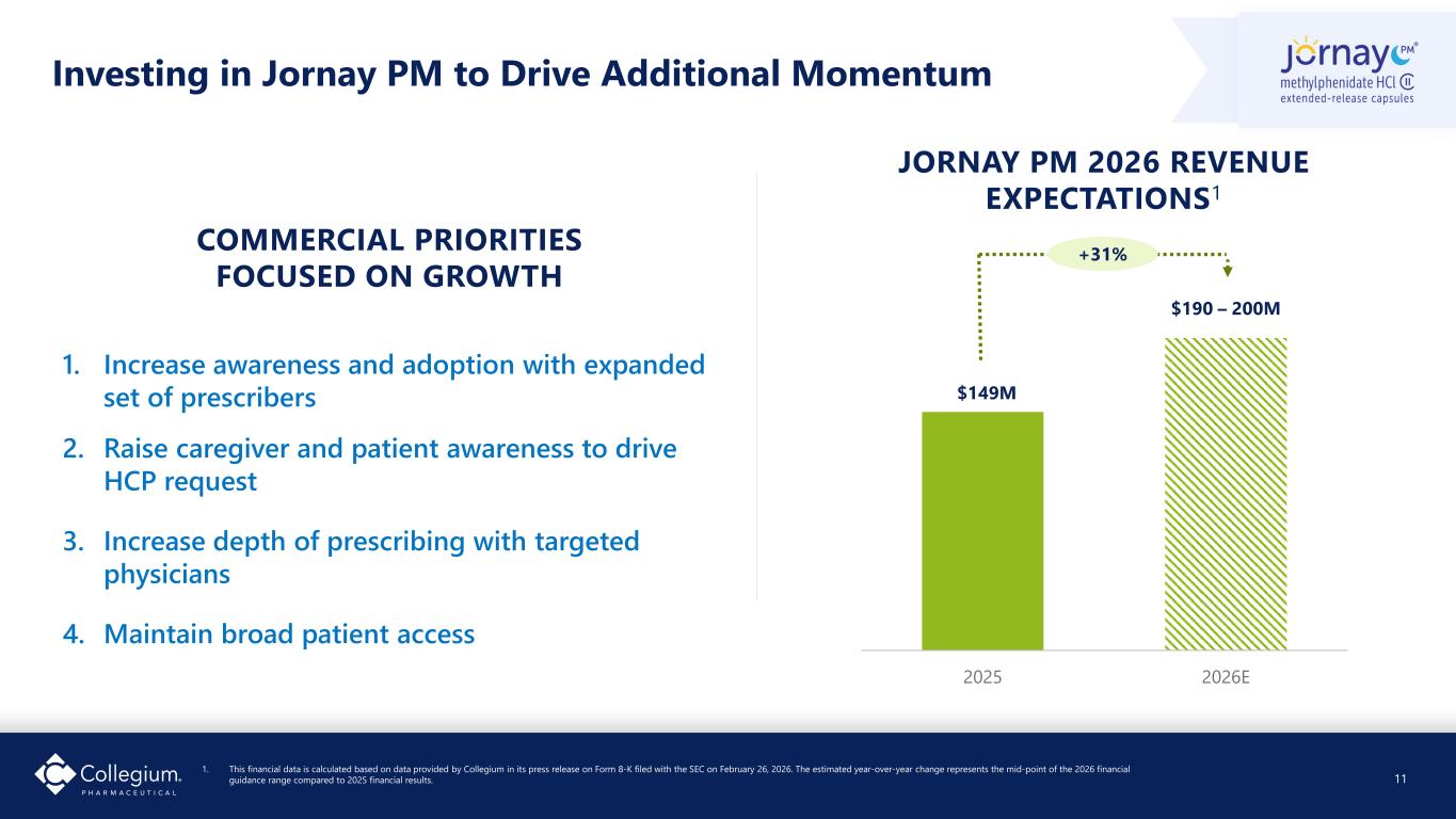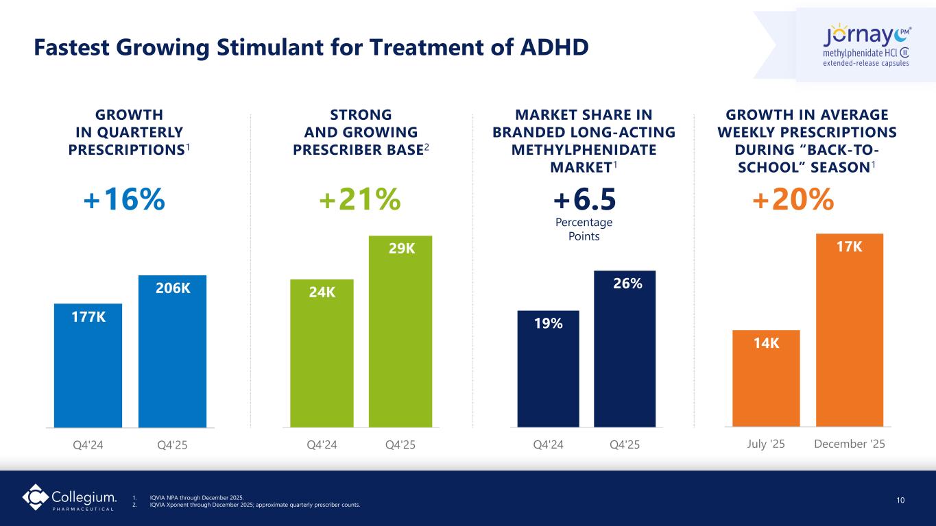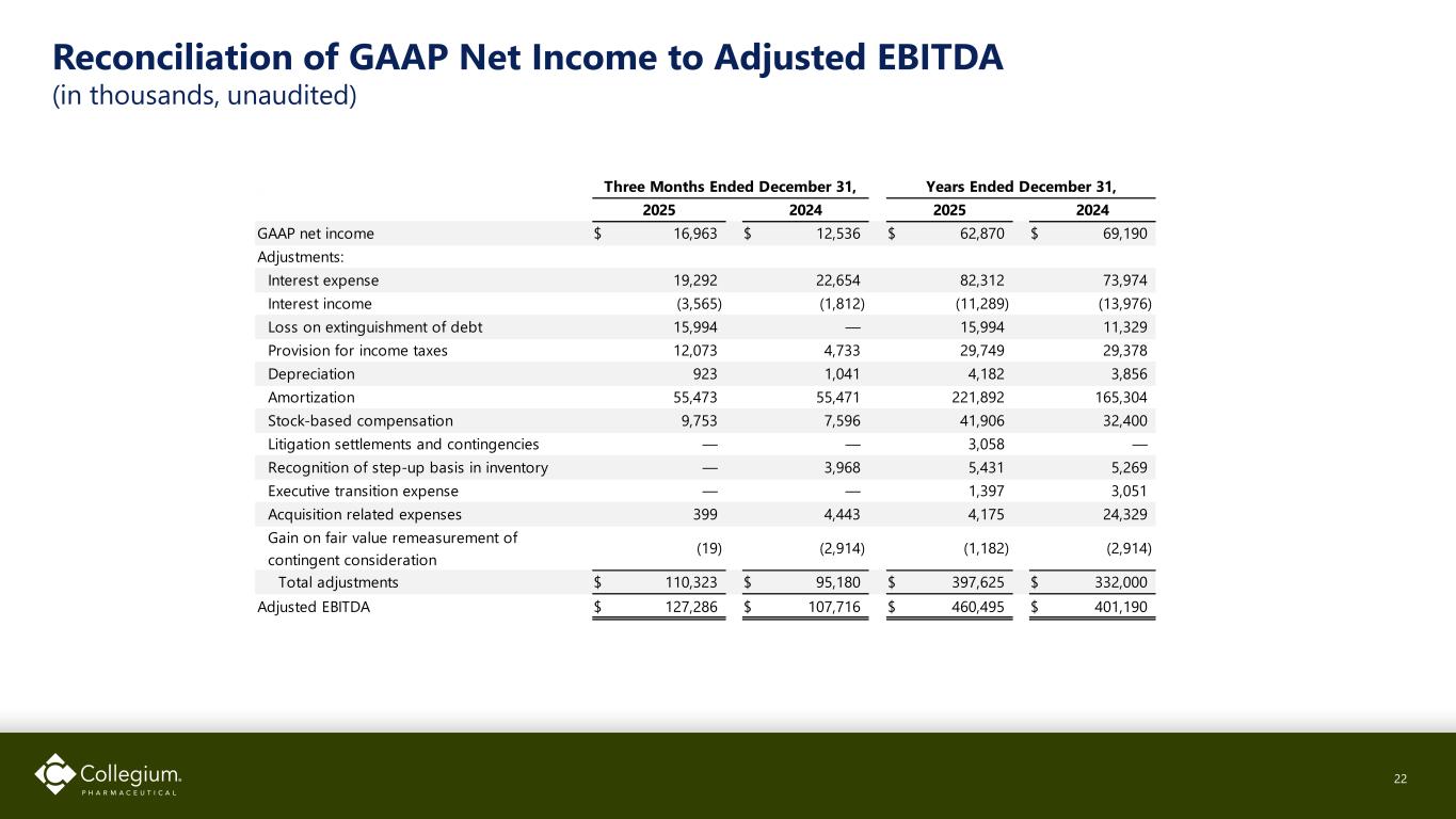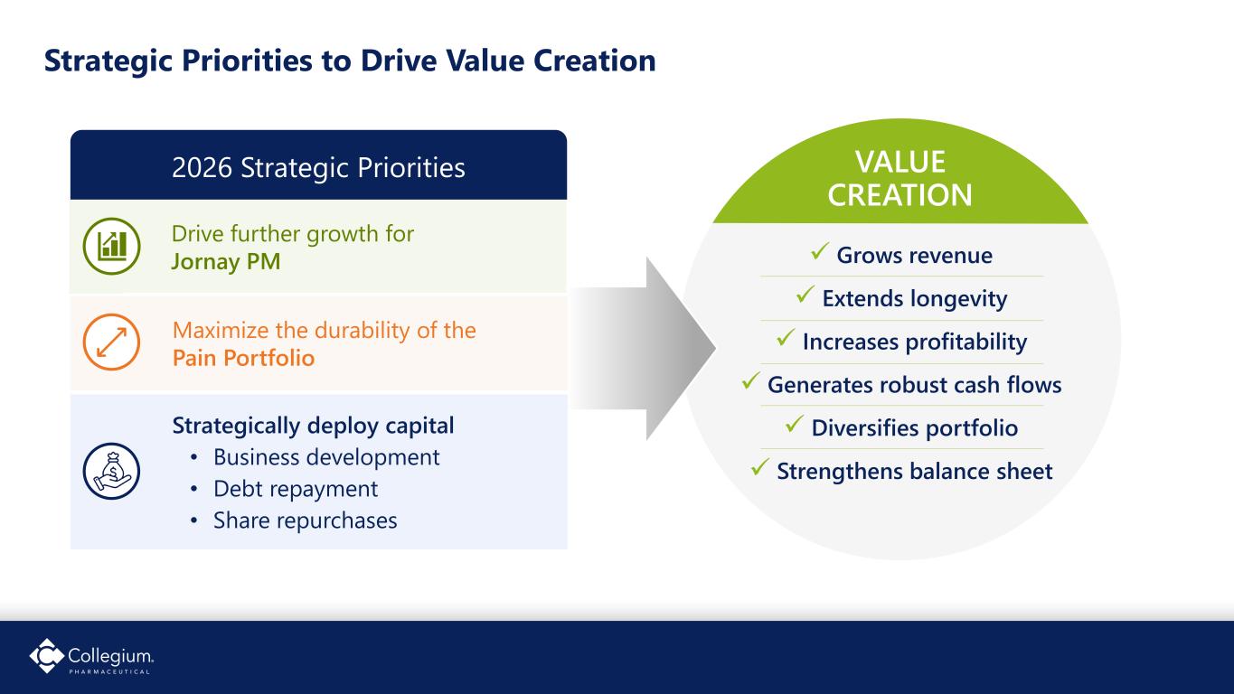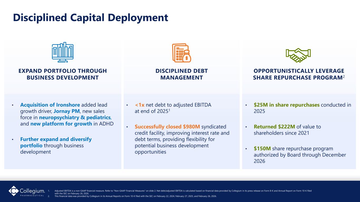 Forward-Looking Statements This presentation contains forward-looking statements within the meaning of The Private Securities Litigation Reform Act of 1995. We may, in some cases, use terms such as "predicts," "forecasts," "believes," "potential," "proposed," "continue," "estimates," "anticipates," "expects," "plans," "intends," "may," "could," "might," "should" or other words that convey uncertainty of future events or outcomes to identify these forward-looking statements. Examples of forward-looking statements contained in this presentation include, among others, statements related to our full-year 2026 financial guidance, including projected product revenues, adjusted operating expenses and adjusted EBITDA, current and future market opportunities for our products and our assumptions related thereto, expectations (financial or otherwise) and intentions, and other statements that are not historical facts. Such statements are subject to numerous important factors, risks and uncertainties that may cause actual events or results, performance, or achievements to differ materially from the company's current expectations, including risks relating to, among others: unknown liabilities; risks related to future opportunities and plans for our products, including uncertainty of the expected financial performance of such products; our ability to commercialize and grow sales of our products; our ability to manage our relationships with licensors; the success of competing products that are or become available; our ability to maintain regulatory approval of our products, and any related restrictions, limitations, and/or warnings in the label of our products; the size of the markets for our products, and our ability to service those markets; our ability to obtain reimbursement and third-party payor contracts for our products; the rate and degree of market acceptance of our products; the costs of commercialization activities, including marketing, sales and distribution; changing market conditions for our products; the outcome of any patent infringement or other litigation that may be brought by or against us; the outcome of any governmental investigation related to our business; our ability to secure adequate supplies of active pharmaceutical ingredient for each of our products and manufacture adequate supplies of commercially saleable inventory; our ability to obtain funding for our operations and business development; regulatory developments in the U.S.; our expectations regarding our ability to obtain and maintain sufficient intellectual property protection for our products; our ability to comply with stringent U.S. and foreign government regulation in the manufacture of pharmaceutical products, including U.S. Drug Enforcement Agency compliance; our customer concentration; and the accuracy of our estimates regarding expenses, revenues, capital requirements and need for additional financing. These and other risks are described under the heading "Risk Factors" in our Annual Reports on Form 10-K and Quarterly Reports on Form 10-Q and other filings with the SEC. Any forward-looking statements that we make in this presentation speak only as of the date of this presentation. We assume no obligation to update our forward-looking statements whether as a result of new information, future events or otherwise, after the date of this presentation. Non-GAAP Financial Measures To supplement our financial results presented on a GAAP basis, we have included information about certain non-GAAP financial measures. We believe the presentation of these non-GAAP financial measures, when viewed with our results under GAAP and the accompanying reconciliations, provide analysts, investors, lenders, and other third parties with insights into how we evaluate normal operational activities, including our ability to generate cash from operations, on a comparable year-over-year basis and manage our budgeting and forecasting. In addition, certain non-GAAP financial measures, primarily Adjusted EBITDA, are used to measure performance when determining components of annual compensation for substantially all non-sales force employees, including senior management. In this presentation, we discuss the following financial measures that are not calculated in accordance with GAAP, to supplement our consolidated financial statements presented on a GAAP basis. Adjusted EBITDA Adjusted EBITDA is a non-GAAP financial measure that represents GAAP net income or loss adjusted to exclude interest expense, interest income, the benefit from or provision for income taxes, depreciation, amortization, stock-based compensation, and other adjustments to reflect changes that occur in our business but do not represent ongoing operations. Adjusted EBITDA, as used by us, may be calculated differently from, and therefore may not be comparable to, similarly titled measures used by other companies. There are several limitations related to the use of adjusted EBITDA rather than net income or loss, which is the nearest GAAP equivalent, such as: • adjusted EBITDA excludes depreciation and amortization, and, although these are non-cash expenses, the assets being depreciated or amortized may have to be replaced in the future, the cash requirements for which are not reflected in adjusted EBITDA; • adjusted EBITDA does not reflect changes in, or cash requirements for, working capital needs; • adjusted EBITDA does not reflect the benefit from or provision for income taxes or the cash requirements to pay taxes; • adjusted EBITDA does not reflect historical cash expenditures or future requirements for capital expenditures or contractual commitments; • we exclude stock-based compensation expense from adjusted EBITDA although: (i) it has been, and will continue to be for the foreseeable future, a significant recurring expense for our business and an important part of our compensation strategy; and (ii) if we did not pay out a portion of our compensation in the fo
