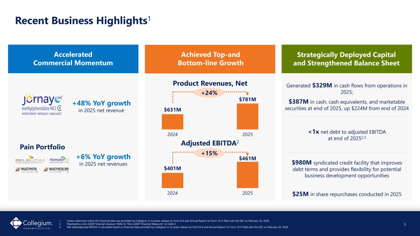 4 Building a Leading, Diversified Biopharmaceutical Company 1. This financial data was provided by Collegium in its Annual Report on Form 10-K filed with the SEC on February 26, 2026. 2. Represents a non-GAAP financial measure. Refer to “Non-GAAP Financial Measures” on slide 2. Healthier people. Stronger communities. 2025 RECAP $461M 2025 Adjusted EBITDA1,2 $781M 2025 Product Sales1 2 Current focus areas: ADHD & Pain BY THE NUMBERS  Drove significant growth for Jornay PM  Maximized the durability of the Pain Portfolio  Strategically deployed capital  Demonstrated our commitment to ‘Doing Good as We Do Well’
