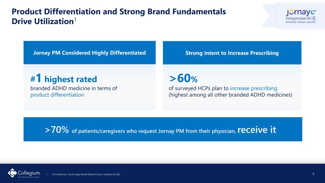 Product Differentiation and Strong Brand Fundamentals Drive Utilization1 91. ATU (Awareness, Trial, & Usage) Market Research Study, completed Q2 2025. Strong Intent to Increase PrescribingJornay PM Considered Highly Differentiated #1 highest rated branded ADHD medicine in terms of product differentiation >60% of surveyed HCPs plan to increase prescribing (highest among all other branded ADHD medicines) >70% of patients/caregivers who request Jornay PM from their physician, receive it