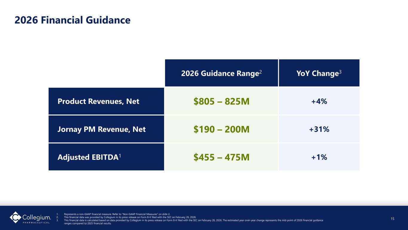 Q4 and FY2025 Financial Highlights1 14 1. This financial data was provided by Collegium in its press release on Form 8-K and Annual Report on Form 10-K filed with the SEC on February 26, 2026. 2. Represents a non-GAAP financial measure. Refer to “Non-GAAP Financial Measures” on slide 2. $631M $781M 2024 2025 Record Product Revenues, Net $182M $205M Q4'24 Q4'25 +13% +24% Adjusted Operating Expenses2 $151M $237M 2024 2025 $51M $58M Q4'24 Q4'25 +13% +58% Record Adjusted EBITDA2 $401M $461M 2024 2025 $108M $127M Q4'24 Q4'25 +18% +15% QUARTERLY FULL-YEAR
