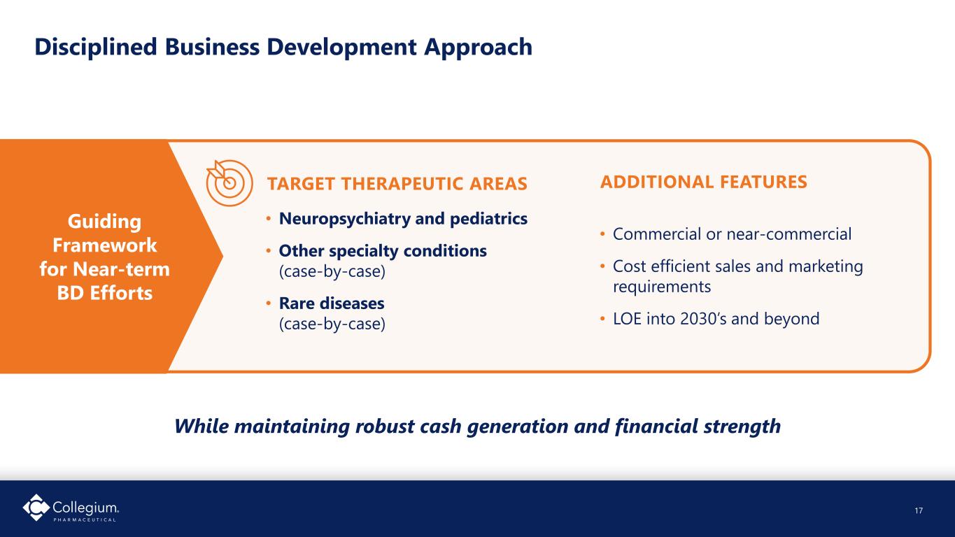 Disciplined Capital Deployment 16 1. Adjusted EBITDA is a non-GAAP financial measure. Refer to “Non-GAAP Financial Measures” on slide 2. Net debt/adjusted EBITDA is calculated based on financial data provided by Collegium in its press release on Form 8-K and Annual Report on Form 10-K filed with the SEC on February 26, 2026. 2. This financial data was provided by Collegium in its Annual Reports on Form 10-K filed with the SEC on February 22, 2024, February 27, 2025, and February 26, 2026. EXPAND PORTFOLIO THROUGH BUSINESS DEVELOPMENT • Acquisition of Ironshore added lead growth driver, Jornay PM, new sales force in neuropsychiatry & pediatrics, and new platform for growth in ADHD • Further expand and diversify portfolio through business development OPPORTUNISTICALLY LEVERAGE SHARE REPURCHASE PROGRAM2 • $25M in share repurchases conducted in 2025 • Returned $222M of value to shareholders since 2021 • $150M share repurchase program authorized by Board through December 2026 DISCIPLINED DEBT MANAGEMENT • <1x net debt to adjusted EBITDA at end of 20251 • Successfully closed $980M syndicated credit facility, improving interest rate and debt terms, providing flexibility for potential business development opportunities