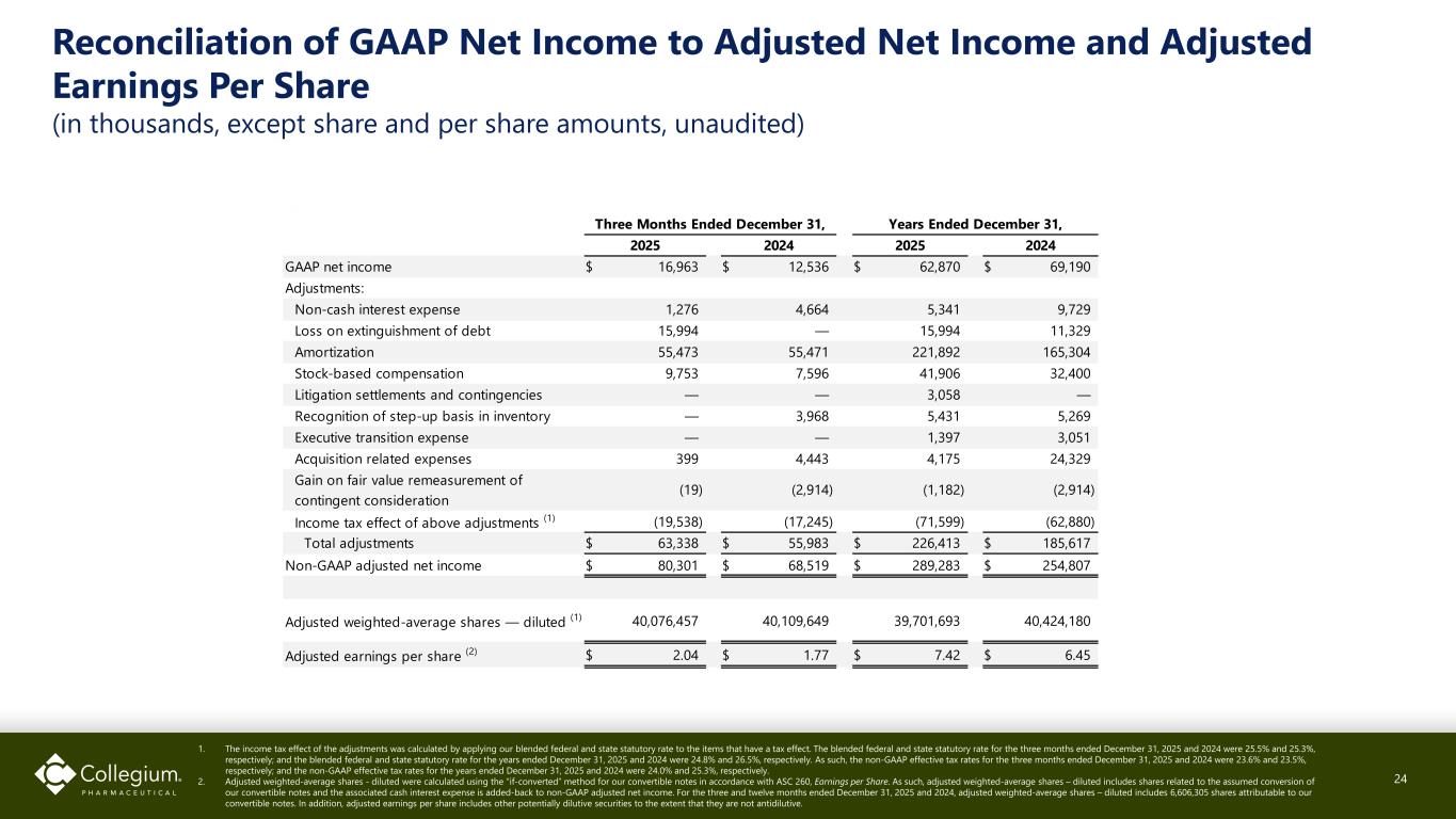 Reconciliation of GAAP Net Income to Adjusted Net Income and Adjusted Earnings Per Share (in thousands, except share and per share amounts, unaudited) 24 1. The income tax effect of the adjustments was calculated by applying our blended federal and state statutory rate to the items that have a tax effect. The blended federal and state statutory rate for the three months ended December 31, 2025 and 2024 were 25.5% and 25.3%, respectively; and the blended federal and state statutory rate for the years ended December 31, 2025 and 2024 were 24.8% and 26.5%, respectively. As such, the non-GAAP effective tax rates for the three months ended December 31, 2025 and 2024 were 23.6% and 23.5%, respectively; and the non-GAAP effective tax rates for the years ended December 31, 2025 and 2024 were 24.0% and 25.3%, respectively. 2. Adjusted weighted-average shares - diluted were calculated using the “if-converted” method for our convertible notes in accordance with ASC 260, Earnings per Share. As such, adjusted weighted-average shares – diluted includes shares related to the assumed conversion of our convertible notes and the associated cash interest expense is added-back to non-GAAP adjusted net income. For the three and twelve months ended December 31, 2025 and 2024, adjusted weighted-average shares – diluted includes 6,606,305 shares attributable to our convertible notes. In addition, adjusted earnings per share includes other potentially dilutive securities to the extent that they are not antidilutive. GAAP net income $ 16,963 $ 12,536 $ 62,870 $ 69,190 Adjustments: Non-cash interest expense 1,276 4,664 5,341 9,729 Loss on extinguishment of debt 15,994 — 15,994 11,329 Amortization 55,473 55,471 221,892 165,304 Stock-based compensation 9,753 7,596 41,906 32,400 Litigation settlements and contingencies — — 3,058 — Recognition of step-up basis in inventory — 3,968 5,431 5,269 Executive transition expense — — 1,397 3,051 Acquisition related expenses 399 4,443 4,175 24,329 Gain on fair value remeasurement of contingent consideration (19) (2,914) (1,182) (2,914) Income tax effect of above adjustments (1) (19,538) (17,245) (71,599) (62,880) Total adjustments $ 63,338 $ 55,983 $ 226,413 $ 185,617 Non-GAAP adjusted net income $ 80,301 $ 68,519 $ 289,283 $ 254,807 Adjusted weighted-average shares — diluted (1) 40,076,457 40,109,649 39,701,693 40,424,180 Adjusted earnings per share (2) $ 2.04 $ 1.77 $ 7.42 $ 6.45 Three Months Ended December 31, 2025 Years Ended December 31, 2025 20242024