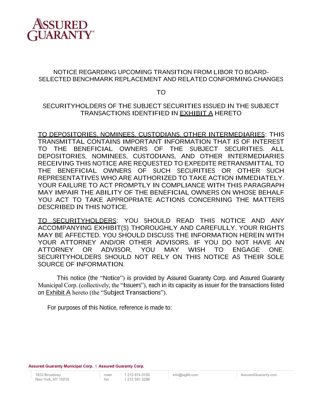 NOTICE REGARDING UPCOMING TRANSITION FROM LIBOR TO BOARD- SELECTED BENCHMARK REPLACEMENT AND RELATED CONFORMING CHANGES TO SECURITYHOLDERS OF THE SUBJECT SECURITIES ISSUED IN THE SUBJECT TRANSACTIONS IDENTIFIED IN EXHIBIT A HERETO TO DEPOSITORIES, NOMINEES, CUSTODIANS, OTHER INTERMEDIARIES: THIS TRANSMITTAL CONTAINS IMPORTANT INFORMATION THAT IS OF INTEREST TO THE BENEFICIAL OWNERS OF THE SUBJECT SECURITIES. ALL DEPOSITORIES, NOMINEES, CUSTODIANS, AND OTHER INTERMEDIARIES RECEIVING THIS NOTICE ARE REQUESTED TO EXPEDITE RETRANSMITTAL TO THE BENEFICIAL OWNERS OF SUCH SECURITIES OR OTHER SUCH REPRESENTATIVES WHO ARE AUTHORIZED TO TAKE ACTION IMMEDIATELY. YOUR FAILURE TO ACT PROMPTLY IN COMPLIANCE WITH THIS PARAGRAPH MAY IMPAIR THE ABILITY OF THE BENEFICIAL OWNERS ON WHOSE BEHALF YOU ACT TO TAKE APPROPRIATE ACTIONS CONCERNING THE MATTERS DESCRIBED IN THIS NOTICE. TO SECURITYHOLDERS: YOU SHOULD READ THIS NOTICE AND ANY ACCOMPANYING EXHIBIT(S) THOROUGHLY AND CAREFULLY. YOUR RIGHTS MAY BE AFFECTED. YOU SHOULD DISCUSS THE INFORMATION HEREIN WITH YOUR ATTORNEY AND/OR OTHER ADVISORS. IF YOU DO NOT HAVE AN ATTORNEY OR ADVISOR, YOU MAY WISH TO ENGAGE ONE. SECURITYHOLDERS SHOULD NOT RELY ON THIS NOTICE AS THEIR SOLE SOURCE OF INFORMATION. This notice (the “Notice”) is provided by Assured Guaranty Corp. and Assured Guaranty Municipal Corp. (collectively, the “Issuers”), each in its capacity as issuer for the transactions listed on Exhibit A hereto (the “Subject Transactions”). For purposes of this Notice, reference is made to: