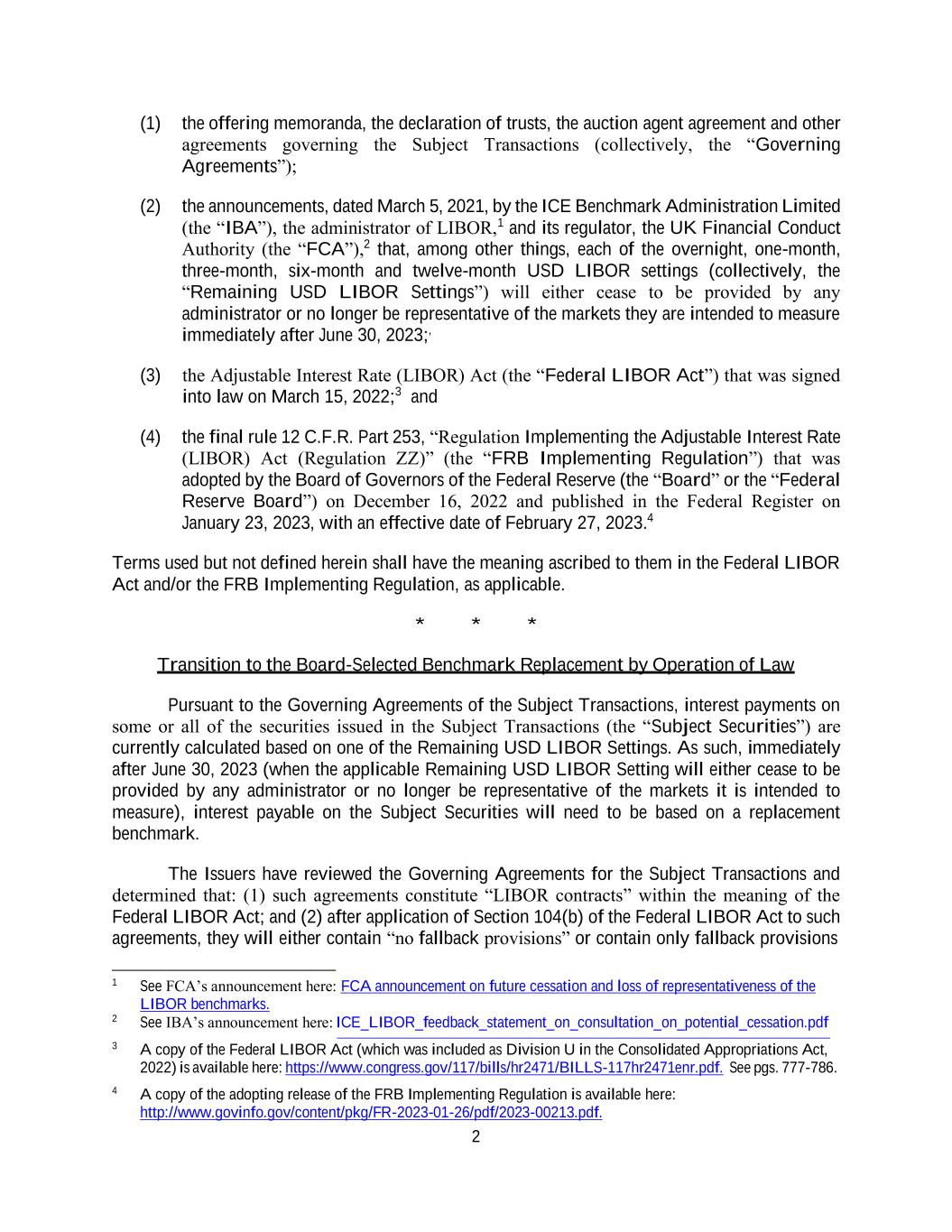2 (1) the offering memoranda, the declaration of trusts, the auction agent agreement and other agreements governing the Subject Transactions (collectively, the “Governing Agreements”); (2) the announcements, dated March 5, 2021, by the ICE Benchmark Administration Limited (the “IBA”), the administrator of LIBOR,1 and its regulator, the UK Financial Conduct Authority (the “FCA”),2 that, among other things, each of the overnight, one-month, three-month, six-month and twelve-month USD LIBOR settings (collectively, the “Remaining USD LIBOR Settings”) will either cease to be provided by any administrator or no longer be representative of the markets they are intended to measure immediately after June 30, 2023;, (3) the Adjustable Interest Rate (LIBOR) Act (the “Federal LIBOR Act”) that was signed into law on March 15, 2022;3 and (4) the final rule 12 C.F.R. Part 253, “Regulation Implementing the Adjustable Interest Rate (LIBOR) Act (Regulation ZZ)” (the “FRB Implementing Regulation”) that was adopted by the Board of Governors of the Federal Reserve (the “Board” or the “Federal Reserve Board”) on December 16, 2022 and published in the Federal Register on January 23, 2023, with an effective date of February 27, 2023.4 Terms used but not defined herein shall have the meaning ascribed to them in the Federal LIBOR Act and/or the FRB Implementing Regulation, as applicable. * * * Transition to the Board-Selected Benchmark Replacement by Operation of Law Pursuant to the Governing Agreements of the Subject Transactions, interest payments on some or all of the securities issued in the Subject Transactions (the “Subject Securities”) are currently calculated based on one of the Remaining USD LIBOR Settings. As such, immediately after June 30, 2023 (when the applicable Remaining USD LIBOR Setting will either cease to be provided by any administrator or no longer be representative of the markets it is intended to measure), interest payable on the Subject Securities will need to be based on a replacement benchmark. The Issuers have reviewed the Governing Agreements for the Subject Transactions and determined that: (1) such agreements constitute “LIBOR contracts” within the meaning of the Federal LIBOR Act; and (2) after application of Section 104(b) of the Federal LIBOR Act to such agreements, they will either contain “no fallback provisions” or contain only fallback provisions 1 See FCA’s announcement here: FCA announcement on future cessation and loss of representativeness of the LIBOR benchmarks. 2 See IBA’s announcement here: ICE_LIBOR_feedback_statement_on_consultation_on_potential_cessation.pdf 3 A copy of the Federal LIBOR Act (which was included as Division U in the Consolidated Appropriations Act, 2022) is available here: https://www.congress.gov/117/bills/hr2471/BILLS-117hr2471enr.pdf. See pgs. 777-786. 4 A copy of the adopting release of the FRB Implementing Regulation is available here: http://www.govinfo.gov/content/pkg/FR-2023-01-26/pdf/2023-00213.pdf.