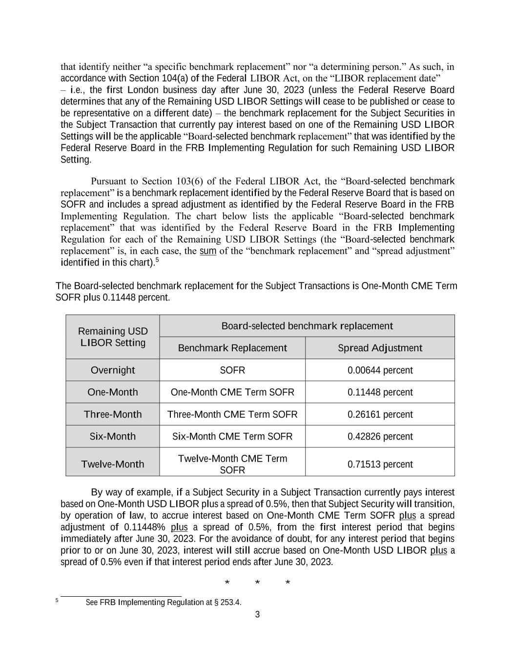 3 that identify neither “a specific benchmark replacement” nor “a determining person.” As such, in accordance with Section 104(a) of the Federal LIBOR Act, on the “LIBOR replacement date” – i.e., the first London business day after June 30, 2023 (unless the Federal Reserve Board determines that any of the Remaining USD LIBOR Settings will cease to be published or cease to be representative on a different date) – the benchmark replacement for the Subject Securities in the Subject Transaction that currently pay interest based on one of the Remaining USD LIBOR Settings will be the applicable “Board-selected benchmark replacement” that was identified by the Federal Reserve Board in the FRB Implementing Regulation for such Remaining USD LIBOR Setting. Pursuant to Section 103(6) of the Federal LIBOR Act, the “Board-selected benchmark replacement” is a benchmark replacement identified by the Federal Reserve Board that is based on SOFR and includes a spread adjustment as identified by the Federal Reserve Board in the FRB Implementing Regulation. The chart below lists the applicable “Board-selected benchmark replacement” that was identified by the Federal Reserve Board in the FRB Implementing Regulation for each of the Remaining USD LIBOR Settings (the “Board-selected benchmark replacement” is, in each case, the sum of the “benchmark replacement” and “spread adjustment” identified in this chart).5 The Board-selected benchmark replacement for the Subject Transactions is One-Month CME Term SOFR plus 0.11448 percent. Remaining USD LIBOR Setting Board-selected benchmark replacement Benchmark Replacement Spread Adjustment Overnight SOFR 0.00644 percent One-Month One-Month CME Term SOFR 0.11448 percent Three-Month Three-Month CME Term SOFR 0.26161 percent Six-Month Six-Month CME Term SOFR 0.42826 percent Twelve-Month Twelve-Month CME Term SOFR 0.71513 percent By way of example, if a Subject Security in a Subject Transaction currently pays interest based on One-Month USD LIBOR plus a spread of 0.5%, then that Subject Security will transition, by operation of law, to accrue interest based on One-Month CME Term SOFR plus a spread adjustment of 0.11448% plus a spread of 0.5%, from the first interest period that begins immediately after June 30, 2023. For the avoidance of doubt, for any interest period that begins prior to or on June 30, 2023, interest will still accrue based on One-Month USD LIBOR plus a spread of 0.5% even if that interest period ends after June 30, 2023. * * * 5 See FRB Implementing Regulation at § 253.4.
