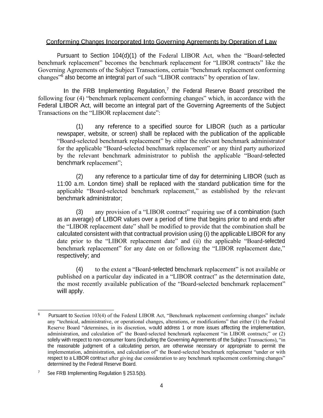 4 Conforming Changes Incorporated Into Governing Agreements by Operation of Law Pursuant to Section 104(d)(1) of the Federal LIBOR Act, when the “Board-selected benchmark replacement” becomes the benchmark replacement for “LIBOR contracts” like the Governing Agreements of the Subject Transactions, certain “benchmark replacement conforming changes”6 also become an integral part of such “LIBOR contracts” by operation of law. In the FRB Implementing Regulation,7 the Federal Reserve Board prescribed the following four (4) “benchmark replacement conforming changes” which, in accordance with the Federal LIBOR Act, will become an integral part of the Governing Agreements of the Subject Transactions on the “LIBOR replacement date”: (1) any reference to a specified source for LIBOR (such as a particular newspaper, website, or screen) shall be replaced with the publication of the applicable “Board-selected benchmark replacement” by either the relevant benchmark administrator for the applicable “Board-selected benchmark replacement” or any third party authorized by the relevant benchmark administrator to publish the applicable “Board-selected benchmark replacement”; (2) any reference to a particular time of day for determining LIBOR (such as 11:00 a.m. London time) shall be replaced with the standard publication time for the applicable “Board-selected benchmark replacement,” as established by the relevant benchmark administrator; (3) any provision of a “LIBOR contract” requiring use of a combination (such as an average) of LIBOR values over a period of time that begins prior to and ends after the “LIBOR replacement date” shall be modified to provide that the combination shall be calculated consistent with that contractual provision using (i) the applicable LIBOR for any date prior to the “LIBOR replacement date” and (ii) the applicable “Board-selected benchmark replacement” for any date on or following the “LIBOR replacement date,” respectively; and (4) to the extent a “Board-selected benchmark replacement” is not available or published on a particular day indicated in a “LIBOR contract” as the determination date, the most recently available publication of the “Board-selected benchmark replacement” will apply. 6 Pursuant to Section 103(4) of the Federal LIBOR Act, “Benchmark replacement conforming changes” include any “technical, administrative, or operational changes, alterations, or modifications” that either (1) the Federal Reserve Board “determines, in its discretion, would address 1 or more issues affecting the implementation, administration, and calculation of” the Board-selected benchmark replacement “in LIBOR contracts;” or (2) solely with respect to non-consumer loans (including the Governing Agreements of the Subject Transactions), “in the reasonable judgment of a calculating person, are otherwise necessary or appropriate to permit the implementation, administration, and calculation of” the Board-selected benchmark replacement “under or with respect to a LIBOR contract after giving due consideration to any benchmark replacement conforming changes” determined by the Federal Reserve Board. 7 See FRB Implementing Regulation § 253.5(b).