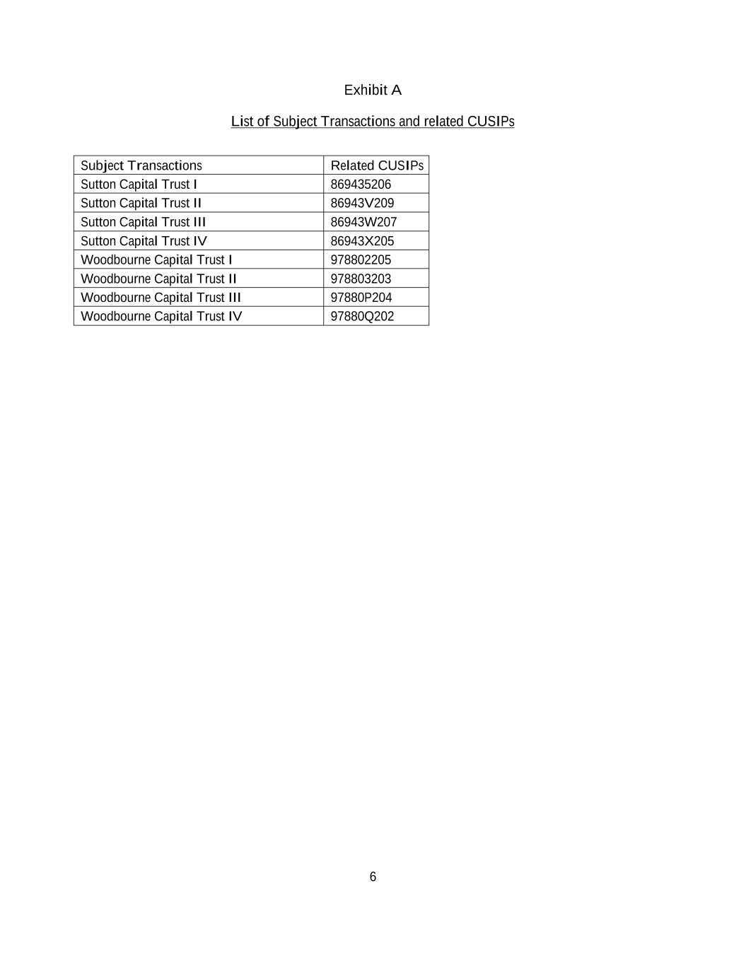 6 Exhibit A List of Subject Transactions and related CUSIPs Subject Transactions Related CUSIPs Sutton Capital Trust I 869435206 Sutton Capital Trust II 86943V209 Sutton Capital Trust III 86943W207 Sutton Capital Trust IV 86943X205 Woodbourne Capital Trust I 978802205 Woodbourne Capital Trust II 978803203 Woodbourne Capital Trust III 97880P204 Woodbourne Capital Trust IV 97880Q202