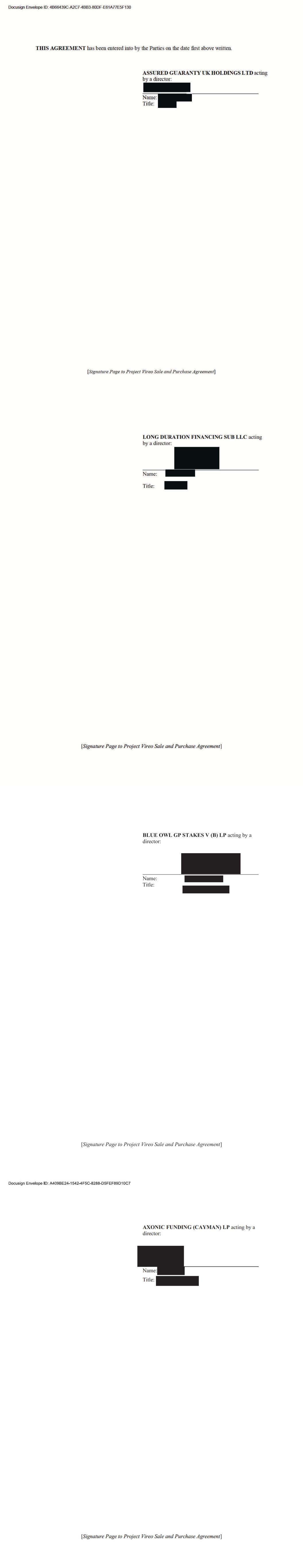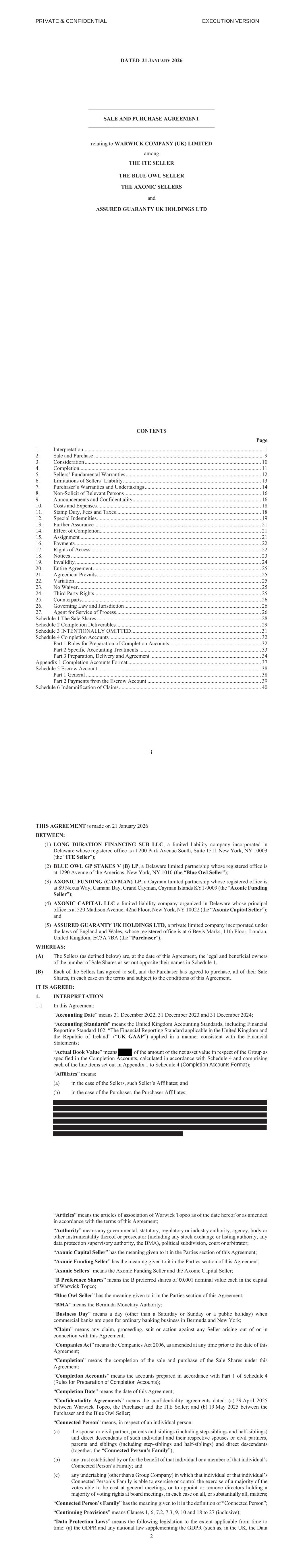 PRIVATE & CONFIDENTIAL EXECUTION VERSION DATED 21 JANUARY 2026 SALE AND PURCHASE AGREEMENT relating to WARWICK COMPANY (UK) LIMITED among THE ITE SELLER THE BLUE OWL SELLER THE AXONIC SELLERS and ASSURED GUARANTY UK HOLDINGS LTD i CONTENTS Page 1. Interpretation.................................................................................................................................... 1 2. Sale and Purchase ............................................................................................................................ 9 3. Consideration ................................................................................................................................. 10 4. Completion..................................................................................................................................... 11 5. Sellers’ Fundamental Warranties................................................................................................... 12 6. Limitations of Sellers’ Liability..................................................................................................... 13 7. Purchaser’s Warranties and Undertakings ..................................................................................... 14 8. Non-Solicit of Relevant Persons.................................................................................................... 16 9. Announcements and Confidentiality.............................................................................................. 16 10. Costs and Expenses........................................................................................................................ 18 11. Stamp Duty, Fees and Taxes.......................................................................................................... 18 12. Special Indemnities........................................................................................................................ 19 13. Further Assurance .......................................................................................................................... 21 14. Effect of Completion...................................................................................................................... 21 15. Assignment .................................................................................................................................... 21 16. Payments........................................................................................................................................ 22 17. Rights of Access ............................................................................................................................ 22 18. Notices ........................................................................................................................................... 23 19. Invalidity........................................................................................................................................ 24 20. Entire Agreement ........................................................................................................................... 25 21. Agreement Prevails........................................................................................................................ 25 22. Variation ........................................................................................................................................ 25 23. No Waiver...................................................................................................................................... 25 24. Third Party Rights.......................................................................................................................... 25 25. Counterparts................................................................................................................................... 26 26. Governing Law and Jurisdiction.................................................................................................... 26 27. Agent for Service of Process.......................................................................................................... 26 Schedule 1 The Sale Shares ........................................................................................................................ 28 Schedule 2 Completion Deliverables.......................................................................................................... 29 Schedule 3 INTENTIONALLY OMITTED............................................................................................... 31 Schedule 4 Completion Accounts ............................................................................................................... 32 Part 1 Rules for Preparation of Completion Accounts................................................................... 32 Part 2 Specific Accounting Treatments ......................................................................................... 33 Part 3 Preparation, Delivery and Agreement ................................................................................. 34 Appendix 1 Completion Accounts Format ................................................................................................. 37 Schedule 5 Escrow Account ....................................................................................................................... 38 Part 1 General ................................................................................................................................ 38 Part 2 Payments from the Escrow Account ................................................................................... 39 Schedule 6 Indemnification of Claims........................................................................................................ 40 THIS AGREEMENT is made on 21 January 2026 BETWEEN: (1) LONG DURATION FINANCING SUB LLC, a limited liability company incorporated in Delaware w