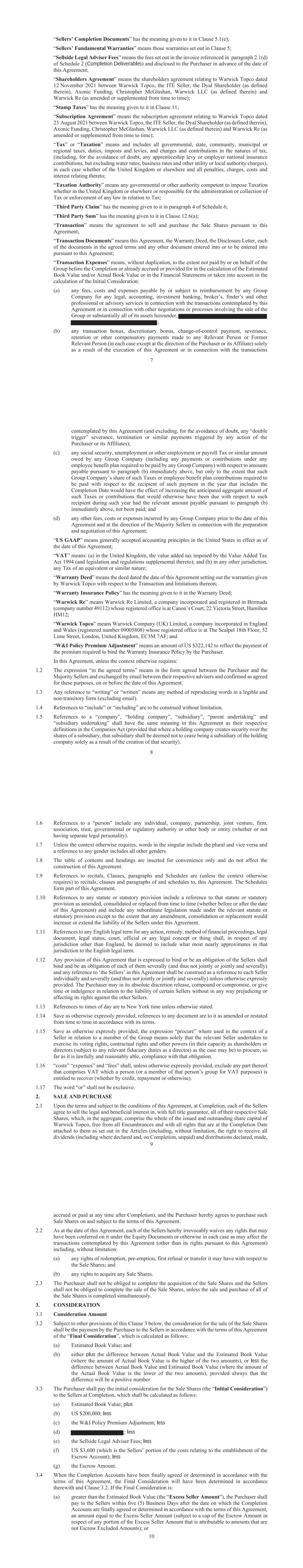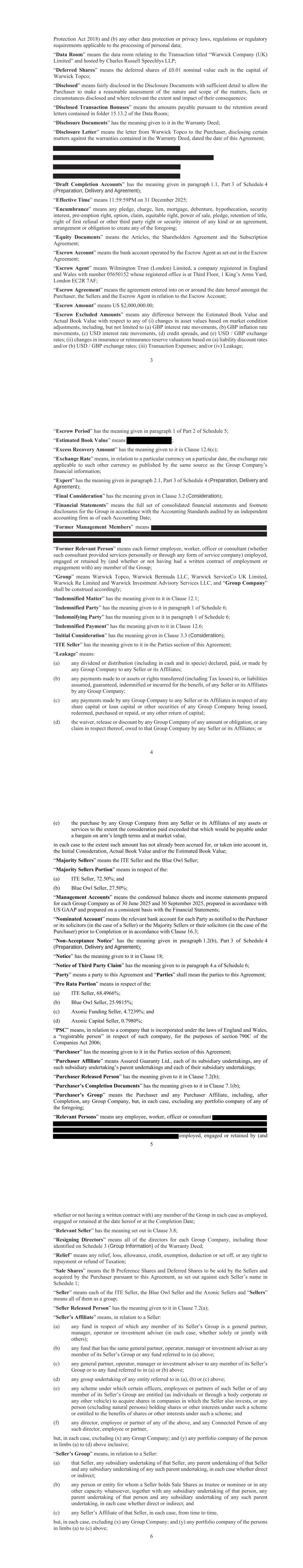 3 Protection Act 2018) and (b) any other data protection or privacy laws, regulations or regulatory requirements applicable to the processing of personal data; “Data Room” means the data room relating to the Transaction titled “Warwick Company (UK) Limited” and hosted by Charles Russell Speechlys LLP; “Deferred Shares” means the deferred shares of £0.01 nominal value each in the capital of Warwick Topco; “Disclosed” means fairly disclosed in the Disclosure Documents with sufficient detail to allow the Purchaser to make a reasonable assessment of the nature and scope of the matters, facts or circumstances disclosed and where relevant the extent and impact of their consequences; “Disclosed Transaction Bonuses” means the amounts payable pursuant to the retention award letters contained in folder 15.13.2 of the Data Room; “Disclosure Documents” has the meaning given to it in the Warranty Deed; “Disclosure Letter” means the letter from Warwick Topco to the Purchaser, disclosing certain matters against the warranties contained in the Warranty Deed, dated the date of this Agreement; “Draft Completion Accounts” has the meaning given in paragraph 1.1, Part 3 of Schedule 4 (Preparation, Delivery and Agreement); “Effective Time” means 11:59:59PM on 31 December 2025; “Encumbrance” means any pledge, charge, lien, mortgage, debenture, hypothecation, security interest, pre-emption right, option, claim, equitable right, power of sale, pledge, retention of title, right of first refusal or other third party right or security interest of any kind or an agreement, arrangement or obligation to create any of the foregoing; “Equity Documents” means the Articles, the Shareholders Agreement and the Subscription Agreement; “Escrow Account” means the bank account operated by the Escrow Agent as set out in the Escrow Agreement; “Escrow Agent” means Wilmington Trust (London) Limited, a company registered in England and Wales with number 05650152 whose registered office is at Third Floor, 1 King’s Arms Yard, London EC2R 7AF; “Escrow Agreement” means the agreement entered into on or around the date hereof amongst the Purchaser, the Sellers and the Escrow Agent in relation to the Escrow Account; “Escrow Amount” means US $2,000,000.00; “Escrow Excluded Amounts” means any difference between the Estimated Book Value and Actual Book Value with respect to any of (i) changes in asset values based on market condition adjustments, including, but not limited to (a) GBP interest rate movements, (b) GBP inflation rate movements, (c) USD interest rate movements, (d) credit spreads, and (e) USD / GBP exchange rates; (ii) changes in insurance or reinsurance reserve valuations based on (a) liability discount rates and/or (b) USD / GBP exchange rates; (iii) Transaction Expenses; and/or (iv) Leakage; 4 “Escrow Period” has the meaning given in paragraph 1 of Part 2 of Schedule 5; “Estimated Book Value” means ; “Excess Recovery Amount” has the meaning given to it in Clause 12.6(c); “Exchange Rate” means, in relation to a particular currency on a particular date, the exchange rate applicable to such other currency as published by the same source as the Group Company’s financial information; “Expert” has the meaning given in paragraph 2.1, Part 3 of Schedule 4 (Preparation, Delivery and Agreement); “Final Consideration” has the meaning given in Clause 3.2 (Consideration); “Financial Statements” means the full set of consolidated financial statements and footnote disclosures for the Group in accordance with the Accounting Standards audited by an independent accounting firm as of each Accounting Date; “Former Management Members” means “Former Relevant Person” means each former employee, worker, officer or consultant (whether such consultant provided services personally or through any form of service company) employed, engaged or retained by (and whether or not having had a written contract of employment or engagement with) any member of the Group; “Group” means Warwick Topco, Warwick Bermuda LLC, Warwick ServiceCo UK Limited, Warwick Re Limited and Warwick Investment Advisory Services LLC, and “Group Company” shall be construed accordingly; “Indemnified Matter” has the meaning given to it in Clause 12.1; “Indemnified Party” has the meaning given to it in paragraph 1 of Schedule 6; “Indemnifying Party” has the meaning given to it in paragraph 1 of Schedule 6; “Indemnified Payment” has the meaning given to it in Clause 12.6; “Initial Consideration” has the meaning given in Clause 3.3 (Consideration); “ITE Seller” has the meaning given to it in the Parties section of this Agreement; “Leakage” means: (a) any dividend or distribution (including in cash and in specie) declared, paid, or made by any Group Company to any Seller or its Affiliates; (b) any payments made to or assets or rights transferred (including Tax losses) to, or liabilities assumed, guaranteed, indemnified or incurred for the benefit, of any Seller or its Affiliates by any Group Company; (c) any payments made by any Group Company to any Seller or its Affiliates in respect of any share capital or loan capital or other securities of any Group Company being issued, redeemed, purchased or repaid, or any other return of capital; (d) the waiver, release or discount by any Group Company of any amount or obligation, or any claim in respect thereof, owed to that Group Company by any Seller or its Affiliates; or 5 (e) the purchase by any Group Company from any Seller or its Affiliates of any assets or services to the extent the consideration paid exceeded that which would be payable under a bargain on arm’s length terms and at market value, in each case to the extent such amount has not already been accrued for, or taken into account in, the Initial Consideration, Actual Book Value and/or the Estimated Book Value; “Majority Sellers” means the IT