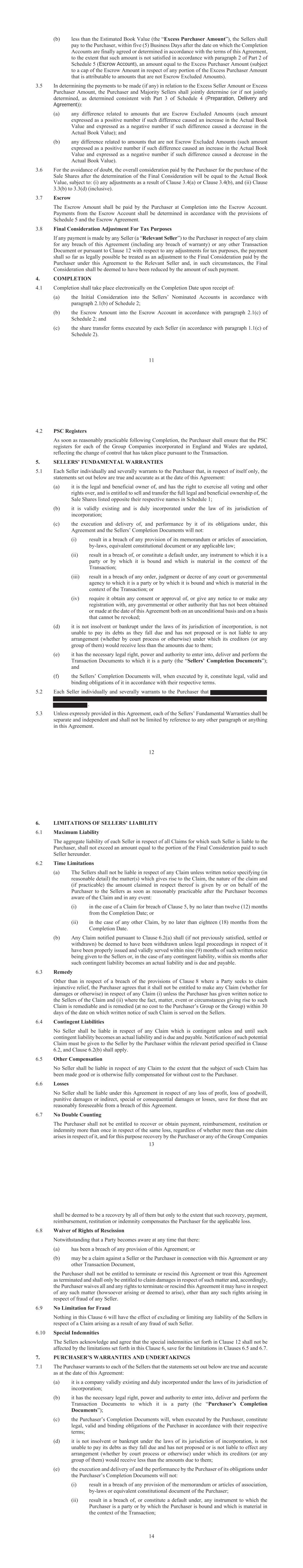 11 (b) less than the Estimated Book Value (the “Excess Purchaser Amount”), the Sellers shall pay to the Purchaser, within five (5) Business Days after the date on which the Completion Accounts are finally agreed or determined in accordance with the terms of this Agreement, to the extent that such amount is not satisfied in accordance with paragraph 2 of Part 2 of Schedule 5 (Escrow Account), an amount equal to the Excess Purchaser Amount (subject to a cap of the Escrow Amount in respect of any portion of the Excess Purchaser Amount that is attributable to amounts that are not Escrow Excluded Amounts). 3.5 In determining the payments to be made (if any) in relation to the Excess Seller Amount or Excess Purchaser Amount, the Purchaser and Majority Sellers shall jointly determine (or if not jointly determined, as determined consistent with Part 3 of Schedule 4 (Preparation, Delivery and Agreement)): (a) any difference related to amounts that are Escrow Excluded Amounts (such amount expressed as a positive number if such difference caused an increase in the Actual Book Value and expressed as a negative number if such difference caused a decrease in the Actual Book Value); and (b) any difference related to amounts that are not Escrow Excluded Amounts (such amount expressed as a positive number if such difference caused an increase in the Actual Book Value and expressed as a negative number if such difference caused a decrease in the Actual Book Value). 3.6 For the avoidance of doubt, the overall consideration paid by the Purchaser for the purchase of the Sale Shares after the determination of the Final Consideration will be equal to the Actual Book Value, subject to: (i) any adjustments as a result of Clause 3.4(a) or Clause 3.4(b), and (ii) Clause 3.3(b) to 3.3(d) (inclusive). 3.7 Escrow The Escrow Amount shall be paid by the Purchaser at Completion into the Escrow Account. Payments from the Escrow Account shall be determined in accordance with the provisions of Schedule 5 and the Escrow Agreement. 3.8 Final Consideration Adjustment For Tax Purposes If any payment is made by any Seller (a “Relevant Seller”) to the Purchaser in respect of any claim for any breach of this Agreement (including any breach of warranty) or any other Transaction Document or pursuant to Clause 12 with respect to any adjustments for tax purposes, the payment shall so far as legally possible be treated as an adjustment to the Final Consideration paid by the Purchaser under this Agreement to the Relevant Seller and, in such circumstances, the Final Consideration shall be deemed to have been reduced by the amount of such payment. 4. COMPLETION 4.1 Completion shall take place electronically on the Completion Date upon receipt of: (a) the Initial Consideration into the Sellers’ Nominated Accounts in accordance with paragraph 2.1(b) of Schedule 2; (b) the Escrow Amount into the Escrow Account in accordance with paragraph 2.1(c) of Schedule 2; and (c) the share transfer forms executed by each Seller (in accordance with paragraph 1.1(c) of Schedule 2). 12 4.2 PSC Registers As soon as reasonably practicable following Completion, the Purchaser shall ensure that the PSC registers for each of the Group Companies incorporated in England and Wales are updated, reflecting the change of control that has taken place pursuant to the Transaction. 5. SELLERS’ FUNDAMENTAL WARRANTIES 5.1 Each Seller individually and severally warrants to the Purchaser that, in respect of itself only, the statements set out below are true and accurate as at the date of this Agreement: (a) it is the legal and beneficial owner of, and has the right to exercise all voting and other rights over, and is entitled to sell and transfer the full legal and beneficial ownership of, the Sale Shares listed opposite their respective names in Schedule 1; (b) it is validly existing and is duly incorporated under the law of its jurisdiction of incorporation; (c) the execution and delivery of, and performance by it of its obligations under, this Agreement and the Sellers’ Completion Documents will not: (i) result in a breach of any provision of its memorandum or articles of association, by-laws, equivalent constitutional document or any applicable law; (ii) result in a breach of, or constitute a default under, any instrument to which it is a party or by which it is bound and which is material in the context of the Transaction; (iii) result in a breach of any order, judgment or decree of any court or governmental agency to which it is a party or by which it is bound and which is material in the context of the Transaction; or (iv) require it obtain any consent or approval of, or give any notice to or make any registration with, any governmental or other authority that has not been obtained or made at the date of this Agreement both on an unconditional basis and on a basis that cannot be revoked; (d) it is not insolvent or bankrupt under the laws of its jurisdiction of incorporation, is not unable to pay its debts as they fall due and has not proposed or is not liable to any arrangement (whether by court process or otherwise) under which its creditors (or any group of them) would receive less than the amounts due to them; (e) it has the necessary legal right, power and authority to enter into, deliver and perform the Transaction Documents to which it is a party (the “Sellers’ Completion Documents”); and (f) the Sellers’ Completion Documents will, when executed by it, constitute legal, valid and binding obligations of it in accordance with their respective terms. 5.2 Each Seller individually and severally warrants to the Purchaser that . 5.3 Unless expressly provided in this Agreement, each of the Sellers’ Fundamental Warranties shall be separate and independent and shall not be limited by reference to any other paragraph or anything in this Agreement. 13 6. LIMITATIONS OF SELLERS’ LIABILITY 6.1 Maximum Liability The aggregate liability of each Seller 