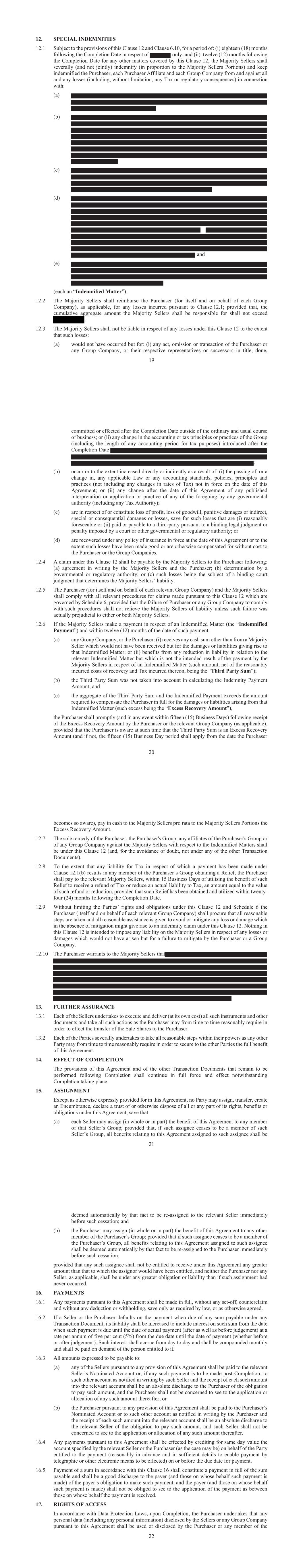19 12. SPECIAL INDEMNITIES 12.1 Subject to the provisions of this Clause 12 and Clause 6.10, for a period of: (i) eighteen (18) months following the Completion Date in respect of only; and (ii) twelve (12) months following the Completion Date for any other matters covered by this Clause 12, the Majority Sellers shall severally (and not jointly) indemnify (in proportion to the Majority Sellers Portions) and keep indemnified the Purchaser, each Purchaser Affiliate and each Group Company from and against all and any losses (including, without limitation, any Tax or regulatory consequences) in connection with: (a) (b) (c) (d) and (e) (each an “Indemnified Matter”). 12.2 The Majority Sellers shall reimburse the Purchaser (for itself and on behalf of each Group Company), as applicable, for any losses incurred pursuant to Clause 12.1; provided that, the cumulative aggregate amount the Majority Sellers shall be responsible for shall not exceed . 12.3 The Majority Sellers shall not be liable in respect of any losses under this Clause 12 to the extent that such losses: (a) would not have occurred but for: (i) any act, omission or transaction of the Purchaser or any Group Company, or their respective representatives or successors in title, done, 20 committed or effected after the Completion Date outside of the ordinary and usual course of business; or (ii) any change in the accounting or tax principles or practices of the Group (including the length of any accounting period for tax purposes) introduced after the Completion Date ; (b) occur or to the extent increased directly or indirectly as a result of: (i) the passing of, or a change in, any applicable Law or any accounting standards, policies, principles and practices (not including any changes in rates of Tax) not in force on the date of this Agreement; or (ii) any change after the date of this Agreement of any published interpretation or application or practice of any of the foregoing by any governmental authority (including any Tax Authority); (c) are in respect of or constitute loss of profit, loss of goodwill, punitive damages or indirect, special or consequential damages or losses, save for such losses that are (i) reasonably foreseeable or (ii) paid or payable to a third-party pursuant to a binding legal judgment or penalty imposed by a court or other governmental or regulatory authority; or (d) are recovered under any policy of insurance in force at the date of this Agreement or to the extent such losses have been made good or are otherwise compensated for without cost to the Purchaser or the Group Companies. 12.4 A claim under this Clause 12 shall be payable by the Majority Sellers to the Purchaser following: (a) agreement in writing by the Majority Sellers and the Purchaser; (b) determination by a governmental or regulatory authority; or (c) such losses being the subject of a binding court judgment that determines the Majority Sellers’ liability. 12.5 The Purchaser (for itself and on behalf of each relevant Group Company) and the Majority Sellers shall comply with all relevant procedures for claims made pursuant to this Clause 12 which are governed by Schedule 6, provided that the failure of Purchaser or any Group Company to comply with such procedures shall not relieve the Majority Sellers of liability unless such failure was actually prejudicial to either or both Majority Sellers. 12.6 If the Majority Sellers make a payment in respect of an Indemnified Matter (the “Indemnified Payment”) and within twelve (12) months of the date of such payment: (a) any Group Company, or the Purchaser: (i) receives any cash sum other than from a Majority Seller which would not have been received but for the damages or liabilities giving rise to that Indemnified Matter; or (ii) benefits from any reduction in liability in relation to the relevant Indemnified Matter but which is not the intended result of the payment by the Majority Sellers in respect of an Indemnified Matter (such amount, net of the reasonably incurred costs of recovery and Tax incurred thereon, being the “Third Party Sum”); (b) the Third Party Sum was not taken into account in calculating the Indemnity Payment Amount; and (c) the aggregate of the Third Party Sum and the Indemnified Payment exceeds the amount required to compensate the Purchaser in full for the damages or liabilities arising from that Indemnified Matter (such excess being the “Excess Recovery Amount”), the Purchaser shall promptly (and in any event within fifteen (15) Business Days) following receipt of the Excess Recovery Amount by the Purchaser or the relevant Group Company (as applicable), provided that the Purchaser is aware at such time that the Third Party Sum is an Excess Recovery Amount (and if not, the fifteen (15) Business Day period shall apply from the date the Purchaser 21 becomes so aware), pay in cash to the Majority Sellers pro rata to the Majority Sellers Portions the Excess Recovery Amount. 12.7 The sole remedy of the Purchaser, the Purchaser's Group, any affiliates of the Purchaser's Group or of any Group Company against the Majority Sellers with respect to the Indemnified Matters shall be under this Clause 12 (and, for the avoidance of doubt, not under any of the other Transaction Documents). 12.8 To the extent that any liability for Tax in respect of which a payment has been made under Clause 12.1(b) results in any member of the Purchaser’s Group obtaining a Relief, the Purchaser shall pay to the relevant Majority Sellers, within 15 Business Days of utilising the benefit of such Relief to receive a refund of Tax or reduce an actual liability to Tax, an amount equal to the value of such refund or reduction, provided that such Relief has been obtained and utilized within twenty- four (24) months following the Completion Date. 12.9 Without limiting the Parties’ rights and obligations under this Clause 12 and Schedule 6 the Purchaser (itself and on behalf of each relevant Group Com