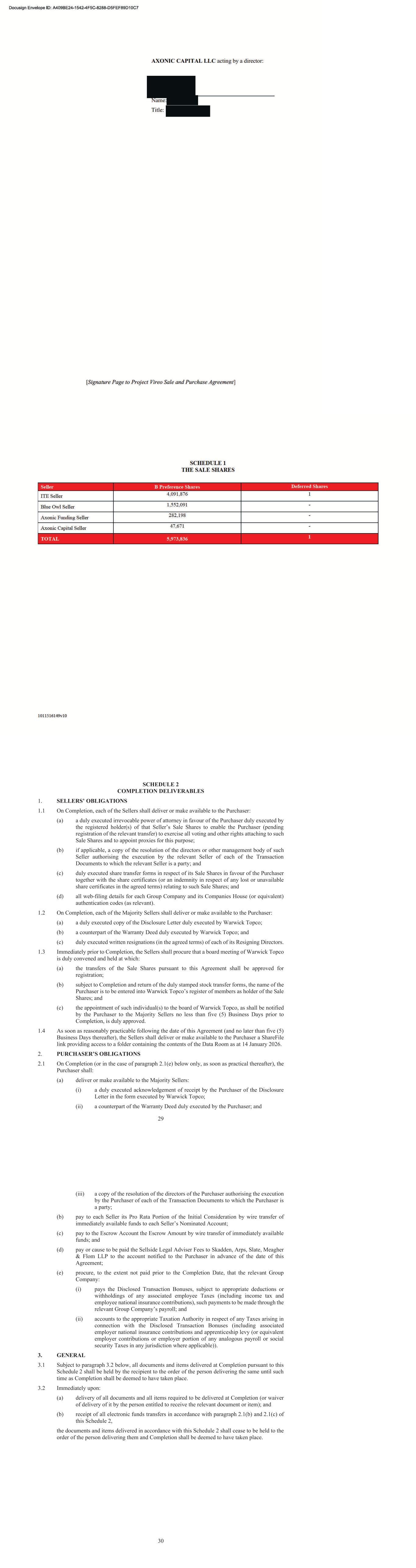 29 SCHEDULE 2 COMPLETION DELIVERABLES 1. SELLERS’ OBLIGATIONS 1.1 On Completion, each of the Sellers shall deliver or make available to the Purchaser: (a) a duly executed irrevocable power of attorney in favour of the Purchaser duly executed by the registered holder(s) of that Seller’s Sale Shares to enable the Purchaser (pending registration of the relevant transfer) to exercise all voting and other rights attaching to such Sale Shares and to appoint proxies for this purpose; (b) if applicable, a copy of the resolution of the directors or other management body of such Seller authorising the execution by the relevant Seller of each of the Transaction Documents to which the relevant Seller is a party; and (c) duly executed share transfer forms in respect of its Sale Shares in favour of the Purchaser together with the share certificates (or an indemnity in respect of any lost or unavailable share certificates in the agreed terms) relating to such Sale Shares; and (d) all web-filing details for each Group Company and its Companies House (or equivalent) authentication codes (as relevant). 1.2 On Completion, each of the Majority Sellers shall deliver or make available to the Purchaser: (a) a duly executed copy of the Disclosure Letter duly executed by Warwick Topco; (b) a counterpart of the Warranty Deed duly executed by Warwick Topco; and (c) duly executed written resignations (in the agreed terms) of each of its Resigning Directors. 1.3 Immediately prior to Completion, the Sellers shall procure that a board meeting of Warwick Topco is duly convened and held at which: (a) the transfers of the Sale Shares pursuant to this Agreement shall be approved for registration; (b) subject to Completion and return of the duly stamped stock transfer forms, the name of the Purchaser is to be entered into Warwick Topco’s register of members as holder of the Sale Shares; and (c) the appointment of such individual(s) to the board of Warwick Topco, as shall be notified by the Purchaser to the Majority Sellers no less than five (5) Business Days prior to Completion, is duly approved. 1.4 As soon as reasonably practicable following the date of this Agreement (and no later than five (5) Business Days thereafter), the Sellers shall deliver or make available to the Purchaser a ShareFile link providing access to a folder containing the contents of the Data Room as at 14 January 2026. 2. PURCHASER’S OBLIGATIONS 2.1 On Completion (or in the case of paragraph 2.1(e) below only, as soon as practical thereafter), the Purchaser shall: (a) deliver or make available to the Majority Sellers: (i) a duly executed acknowledgement of receipt by the Purchaser of the Disclosure Letter in the form executed by Warwick Topco; (ii) a counterpart of the Warranty Deed duly executed by the Purchaser; and 30 (iii) a copy of the resolution of the directors of the Purchaser authorising the execution by the Purchaser of each of the Transaction Documents to which the Purchaser is a party; (b) pay to each Seller its Pro Rata Portion of the Initial Consideration by wire transfer of immediately available funds to each Seller’s Nominated Account; (c) pay to the Escrow Account the Escrow Amount by wire transfer of immediately available funds; and (d) pay or cause to be paid the Sellside Legal Adviser Fees to Skadden, Arps, Slate, Meagher & Flom LLP to the account notified to the Purchaser in advance of the date of this Agreement; (e) procure, to the extent not paid prior to the Completion Date, that the relevant Group Company: (i) pays the Disclosed Transaction Bonuses, subject to appropriate deductions or withholdings of any associated employee Taxes (including income tax and employee national insurance contributions), such payments to be made through the relevant Group Company’s payroll; and (ii) accounts to the appropriate Taxation Authority in respect of any Taxes arising in connection with the Disclosed Transaction Bonuses (including associated employer national insurance contributions and apprenticeship levy (or equivalent employer contributions or employer portion of any analogous payroll or social security Taxes in any jurisdiction where applicable)). 3. GENERAL 3.1 Subject to paragraph 3.2 below, all documents and items delivered at Completion pursuant to this Schedule 2 shall be held by the recipient to the order of the person delivering the same until such time as Completion shall be deemed to have taken place. 3.2 Immediately upon: (a) delivery of all documents and all items required to be delivered at Completion (or waiver of delivery of it by the person entitled to receive the relevant document or item); and (b) receipt of all electronic funds transfers in accordance with paragraph 2.1(b) and 2.1(c) of this Schedule 2, the documents and items delivered in accordance with this Schedule 2 shall cease to be held to the order of the person delivering them and Completion shall be deemed to have taken place.
