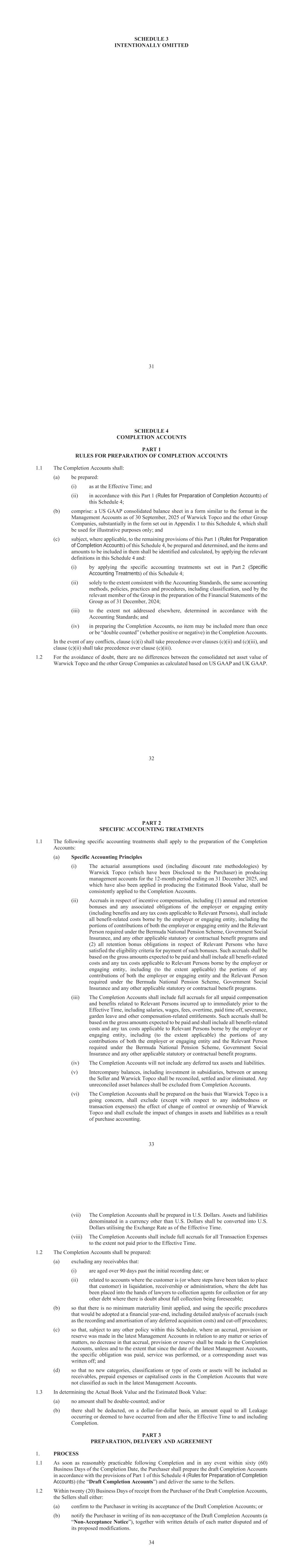 31 SCHEDULE 3 INTENTIONALLY OMITTED 32 SCHEDULE 4 COMPLETION ACCOUNTS PART 1 RULES FOR PREPARATION OF COMPLETION ACCOUNTS 1.1 The Completion Accounts shall: (a) be prepared: (i) as at the Effective Time; and (ii) in accordance with this Part 1 (Rules for Preparation of Completion Accounts) of this Schedule 4; (b) comprise: a US GAAP consolidated balance sheet in a form similar to the format in the Management Accounts as of 30 September, 2025 of Warwick Topco and the other Group Companies, substantially in the form set out in Appendix 1 to this Schedule 4, which shall be used for illustrative purposes only; and (c) subject, where applicable, to the remaining provisions of this Part 1 (Rules for Preparation of Completion Accounts) of this Schedule 4, be prepared and determined, and the items and amounts to be included in them shall be identified and calculated, by applying the relevant definitions in this Schedule 4 and: (i) by applying the specific accounting treatments set out in Part 2 (Specific Accounting Treatments) of this Schedule 4; (ii) solely to the extent consistent with the Accounting Standards, the same accounting methods, policies, practices and procedures, including classification, used by the relevant member of the Group in the preparation of the Financial Statements of the Group as of 31 December, 2024; (iii) to the extent not addressed elsewhere, determined in accordance with the Accounting Standards; and (iv) in preparing the Completion Accounts, no item may be included more than once or be “double counted” (whether positive or negative) in the Completion Accounts. In the event of any conflicts, clause (c)(i) shall take precedence over clauses (c)(ii) and (c)(iii), and clause (c)(ii) shall take precedence over clause (c)(iii). 1.2 For the avoidance of doubt, there are no differences between the consolidated net asset value of Warwick Topco and the other Group Companies as calculated based on US GAAP and UK GAAP. 33 PART 2 SPECIFIC ACCOUNTING TREATMENTS 1.1 The following specific accounting treatments shall apply to the preparation of the Completion Accounts: (a) Specific Accounting Principles (i) The actuarial assumptions used (including discount rate methodologies) by Warwick Topco (which have been Disclosed to the Purchaser) in producing management accounts for the 12-month period ending on 31 December 2025, and which have also been applied in producing the Estimated Book Value, shall be consistently applied to the Completion Accounts. (ii) Accruals in respect of incentive compensation, including (1) annual and retention bonuses and any associated obligations of the employer or engaging entity (including benefits and any tax costs applicable to Relevant Persons), shall include all benefit-related costs borne by the employer or engaging entity, including the portions of contributions of both the employer or engaging entity and the Relevant Person required under the Bermuda National Pension Scheme, Government Social Insurance, and any other applicable statutory or contractual benefit programs and (2) all retention bonus obligations in respect of Relevant Persons who have satisfied the eligibility criteria for payment of such bonuses. Such accruals shall be based on the gross amounts expected to be paid and shall include all benefit-related costs and any tax costs applicable to Relevant Persons borne by the employer or engaging entity, including (to the extent applicable) the portions of any contributions of both the employer or engaging entity and the Relevant Person required under the Bermuda National Pension Scheme, Government Social Insurance and any other applicable statutory or contractual benefit programs. (iii) The Completion Accounts shall include full accruals for all unpaid compensation and benefits related to Relevant Persons incurred up to immediately prior to the Effective Time, including salaries, wages, fees, overtime, paid time off, severance, garden leave and other compensation-related entitlements. Such accruals shall be based on the gross amounts expected to be paid and shall include all benefit-related costs and any tax costs applicable to Relevant Persons borne by the employer or engaging entity, including (to the extent applicable) the portions of any contributions of both the employer or engaging entity and the Relevant Person required under the Bermuda National Pension Scheme, Government Social Insurance and any other applicable statutory or contractual benefit programs. (iv) The Completion Accounts will not include any deferred tax assets and liabilities. (v) Intercompany balances, including investment in subsidiaries, between or among the Seller and Warwick Topco shall be reconciled, settled and/or eliminated. Any unreconciled asset balances shall be excluded from Completion Accounts. (vi) The Completion Accounts shall be prepared on the basis that Warwick Topco is a going concern, shall exclude (except with respect to any indebtedness or transaction expenses) the effect of change of control or ownership of Warwick Topco and shall exclude the impact of changes in assets and liabilities as a result of purchase accounting. 34 (vii) The Completion Accounts shall be prepared in U.S. Dollars. Assets and liabilities denominated in a currency other than U.S. Dollars shall be converted into U.S. Dollars utilising the Exchange Rate as of the Effective Time. (viii) The Completion Accounts shall include full accruals for all Transaction Expenses to the extent not paid prior to the Effective Time. 1.2 The Completion Accounts shall be prepared: (a) excluding any receivables that: (i) are aged over 90 days past the initial recording date; or (ii) related to accounts where the customer is (or where steps have been taken to place that customer) in liquidation, receivership or administration, where the debt has been placed into the hands of lawyers to collection agents for collection or for any other debt where there is doubt about full collection being fore