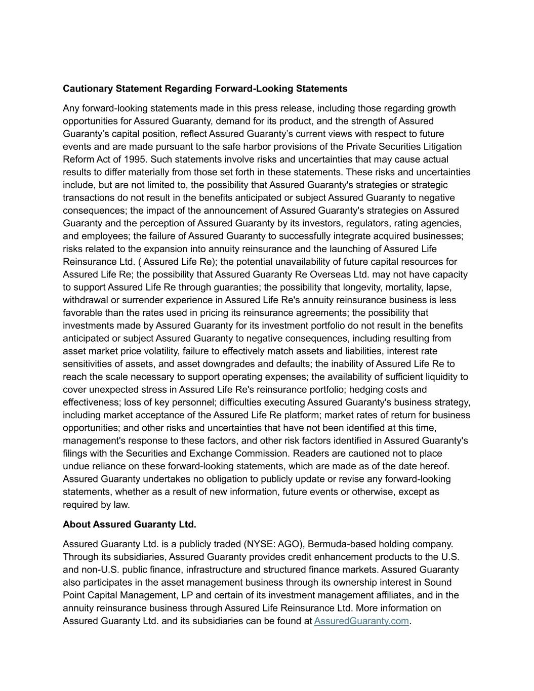 Cautionary Statement Regarding Forward-Looking Statements Any forward-looking statements made in this press release, including those regarding growth opportunities for Assured Guaranty, demand for its product, and the strength of Assured Guaranty’s capital position, reflect Assured Guaranty’s current views with respect to future events and are made pursuant to the safe harbor provisions of the Private Securities Litigation Reform Act of 1995. Such statements involve risks and uncertainties that may cause actual results to differ materially from those set forth in these statements. These risks and uncertainties include, but are not limited to, the possibility that Assured Guaranty's strategies or strategic transactions do not result in the benefits anticipated or subject Assured Guaranty to negative consequences; the impact of the announcement of Assured Guaranty's strategies on Assured Guaranty and the perception of Assured Guaranty by its investors, regulators, rating agencies, and employees; the failure of Assured Guaranty to successfully integrate acquired businesses; risks related to the expansion into annuity reinsurance and the launching of Assured Life Reinsurance Ltd. ( Assured Life Re); the potential unavailability of future capital resources for Assured Life Re; the possibility that Assured Guaranty Re Overseas Ltd. may not have capacity to support Assured Life Re through guaranties; the possibility that longevity, mortality, lapse, withdrawal or surrender experience in Assured Life Re's annuity reinsurance business is less favorable than the rates used in pricing its reinsurance agreements; the possibility that investments made by Assured Guaranty for its investment portfolio do not result in the benefits anticipated or subject Assured Guaranty to negative consequences, including resulting from asset market price volatility, failure to effectively match assets and liabilities, interest rate sensitivities of assets, and asset downgrades and defaults; the inability of Assured Life Re to reach the scale necessary to support operating expenses; the availability of sufficient liquidity to cover unexpected stress in Assured Life Re's reinsurance portfolio; hedging costs and effectiveness; loss of key personnel; difficulties executing Assured Guaranty's business strategy, including market acceptance of the Assured Life Re platform; market rates of return for business opportunities; and other risks and uncertainties that have not been identified at this time, management's response to these factors, and other risk factors identified in Assured Guaranty's filings with the Securities and Exchange Commission. Readers are cautioned not to place undue reliance on these forward-looking statements, which are made as of the date hereof. Assured Guaranty undertakes no obligation to publicly update or revise any forward-looking statements, whether as a result of new information, future events or otherwise, except as required by law. About Assured Guaranty Ltd. Assured Guaranty Ltd. is a publicly traded (NYSE: AGO), Bermuda-based holding company. Through its subsidiaries, Assured Guaranty provides credit enhancement products to the U.S. and non-U.S. public finance, infrastructure and structured finance markets. Assured Guaranty also participates in the asset management business through its ownership interest in Sound Point Capital Management, LP and certain of its investment management affiliates, and in the annuity reinsurance business through Assured Life Reinsurance Ltd. More information on Assured Guaranty Ltd. and its subsidiaries can be found at AssuredGuaranty.com.