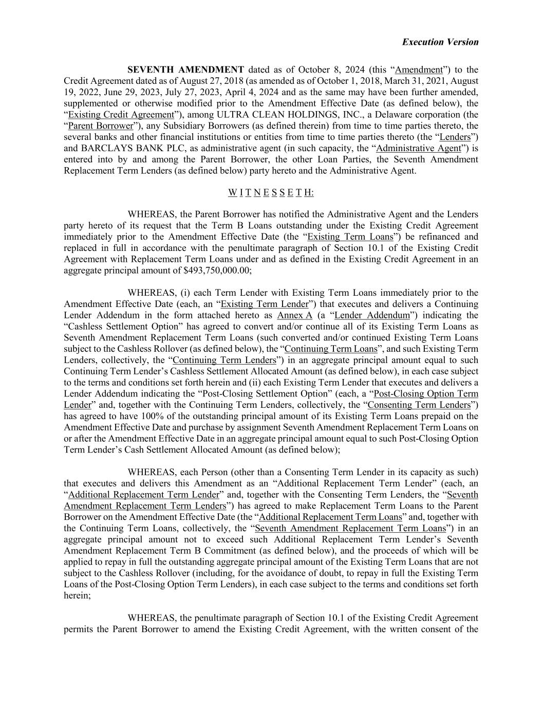 Execution Version SEVENTH AMENDMENT dated as of October 8, 2024 (this “Amendment”) to the Credit Agreement dated as of August 27, 2018 (as amended as of October 1, 2018, March 31, 2021, August 19, 2022, June 29, 2023, July 27, 2023, April 4, 2024 and as the same may have been further amended, supplemented or otherwise modified prior to the Amendment Effective Date (as defined below), the “Existing Credit Agreement”), among ULTRA CLEAN HOLDINGS, INC., a Delaware corporation (the “Parent Borrower”), any Subsidiary Borrowers (as defined therein) from time to time parties thereto, the several banks and other financial institutions or entities from time to time parties thereto (the “Lenders”) and BARCLAYS BANK PLC, as administrative agent (in such capacity, the “Administrative Agent”) is entered into by and among the Parent Borrower, the other Loan Parties, the Seventh Amendment Replacement Term Lenders (as defined below) party hereto and the Administrative Agent. W I T N E S S E T H: WHEREAS, the Parent Borrower has notified the Administrative Agent and the Lenders party hereto of its request that the Term B Loans outstanding under the Existing Credit Agreement immediately prior to the Amendment Effective Date (the “Existing Term Loans”) be refinanced and replaced in full in accordance with the penultimate paragraph of Section 10.1 of the Existing Credit Agreement with Replacement Term Loans under and as defined in the Existing Credit Agreement in an aggregate principal amount of $493,750,000.00; WHEREAS, (i) each Term Lender with Existing Term Loans immediately prior to the Amendment Effective Date (each, an “Existing Term Lender”) that executes and delivers a Continuing Lender Addendum in the form attached hereto as Annex A (a “Lender Addendum”) indicating the “Cashless Settlement Option” has agreed to convert and/or continue all of its Existing Term Loans as Seventh Amendment Replacement Term Loans (such converted and/or continued Existing Term Loans subject to the Cashless Rollover (as defined below), the “Continuing Term Loans”, and such Existing Term Lenders, collectively, the “Continuing Term Lenders”) in an aggregate principal amount equal to such Continuing Term Lender’s Cashless Settlement Allocated Amount (as defined below), in each case subject to the terms and conditions set forth herein and (ii) each Existing Term Lender that executes and delivers a Lender Addendum indicating the “Post-Closing Settlement Option” (each, a “Post-Closing Option Term Lender” and, together with the Continuing Term Lenders, collectively, the “Consenting Term Lenders”) has agreed to have 100% of the outstanding principal amount of its Existing Term Loans prepaid on the Amendment Effective Date and purchase by assignment Seventh Amendment Replacement Term Loans on or after the Amendment Effective Date in an aggregate principal amount equal to such Post-Closing Option Term Lender’s Cash Settlement Allocated Amount (as defined below); WHEREAS, each Person (other than a Consenting Term Lender in its capacity as such) that executes and delivers this Amendment as an “Additional Replacement Term Lender” (each, an “Additional Replacement Term Lender” and, together with the Consenting Term Lenders, the “Seventh Amendment Replacement Term Lenders”) has agreed to make Replacement Term Loans to the Parent Borrower on the Amendment Effective Date (the “Additional Replacement Term Loans” and, together with the Continuing Term Loans, collectively, the “Seventh Amendment Replacement Term Loans”) in an aggregate principal amount not to exceed such Additional Replacement Term Lender’s Seventh Amendment Replacement Term B Commitment (as defined below), and the proceeds of which will be applied to repay in full the outstanding aggregate principal amount of the Existing Term Loans that are not subject to the Cashless Rollover (including, for the avoidance of doubt, to repay in full the Existing Term Loans of the Post-Closing Option Term Lenders), in each case subject to the terms and conditions set forth herein; WHEREAS, the penultimate paragraph of Section 10.1 of the Existing Credit Agreement permits the Parent Borrower to amend the Existing Credit Agreement, with the written consent of the