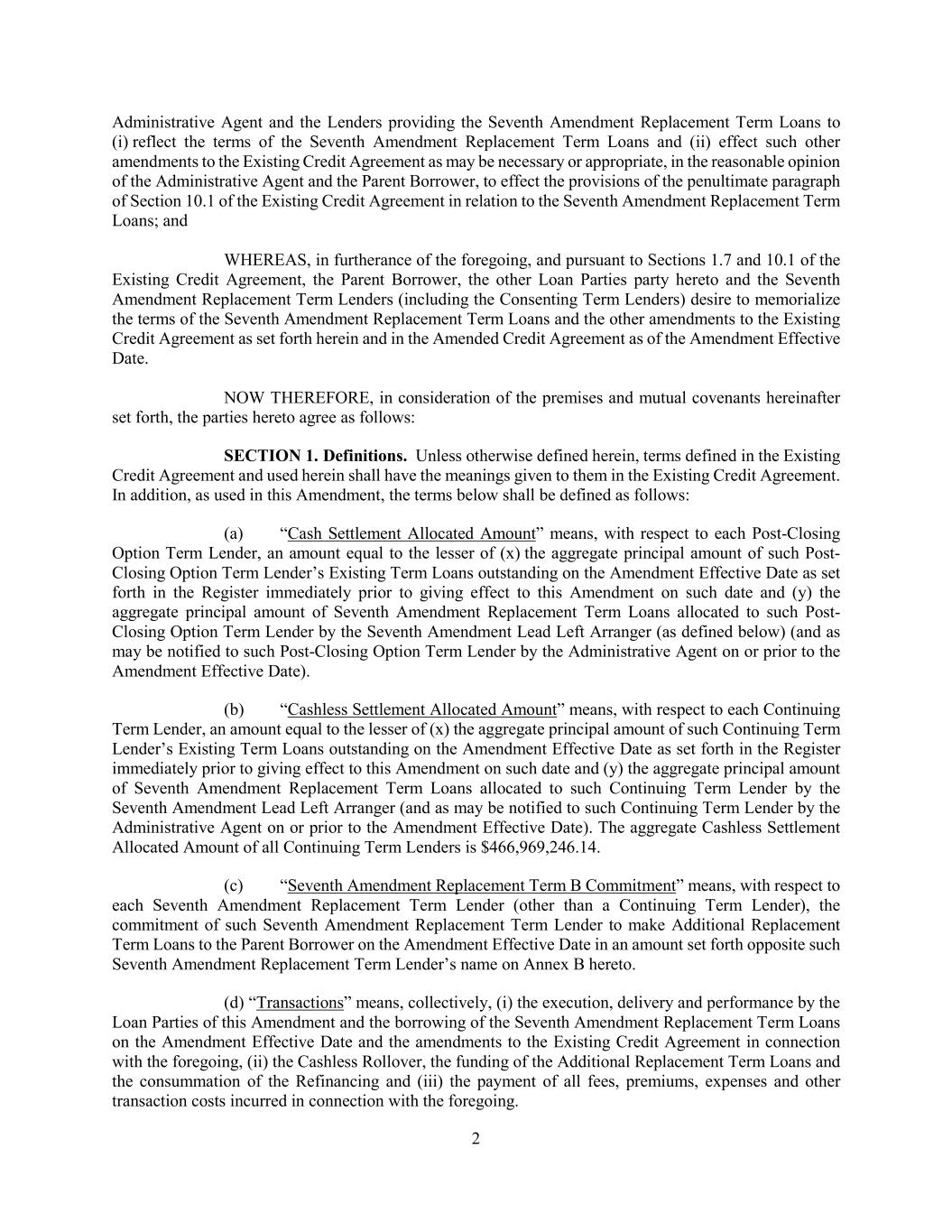 2 Administrative Agent and the Lenders providing the Seventh Amendment Replacement Term Loans to (i) reflect the terms of the Seventh Amendment Replacement Term Loans and (ii) effect such other amendments to the Existing Credit Agreement as may be necessary or appropriate, in the reasonable opinion of the Administrative Agent and the Parent Borrower, to effect the provisions of the penultimate paragraph of Section 10.1 of the Existing Credit Agreement in relation to the Seventh Amendment Replacement Term Loans; and WHEREAS, in furtherance of the foregoing, and pursuant to Sections 1.7 and 10.1 of the Existing Credit Agreement, the Parent Borrower, the other Loan Parties party hereto and the Seventh Amendment Replacement Term Lenders (including the Consenting Term Lenders) desire to memorialize the terms of the Seventh Amendment Replacement Term Loans and the other amendments to the Existing Credit Agreement as set forth herein and in the Amended Credit Agreement as of the Amendment Effective Date. NOW THEREFORE, in consideration of the premises and mutual covenants hereinafter set forth, the parties hereto agree as follows: SECTION 1. Definitions. Unless otherwise defined herein, terms defined in the Existing Credit Agreement and used herein shall have the meanings given to them in the Existing Credit Agreement. In addition, as used in this Amendment, the terms below shall be defined as follows: (a) “Cash Settlement Allocated Amount” means, with respect to each Post-Closing Option Term Lender, an amount equal to the lesser of (x) the aggregate principal amount of such Post- Closing Option Term Lender’s Existing Term Loans outstanding on the Amendment Effective Date as set forth in the Register immediately prior to giving effect to this Amendment on such date and (y) the aggregate principal amount of Seventh Amendment Replacement Term Loans allocated to such Post- Closing Option Term Lender by the Seventh Amendment Lead Left Arranger (as defined below) (and as may be notified to such Post-Closing Option Term Lender by the Administrative Agent on or prior to the Amendment Effective Date). (b) “Cashless Settlement Allocated Amount” means, with respect to each Continuing Term Lender, an amount equal to the lesser of (x) the aggregate principal amount of such Continuing Term Lender’s Existing Term Loans outstanding on the Amendment Effective Date as set forth in the Register immediately prior to giving effect to this Amendment on such date and (y) the aggregate principal amount of Seventh Amendment Replacement Term Loans allocated to such Continuing Term Lender by the Seventh Amendment Lead Left Arranger (and as may be notified to such Continuing Term Lender by the Administrative Agent on or prior to the Amendment Effective Date). The aggregate Cashless Settlement Allocated Amount of all Continuing Term Lenders is $466,969,246.14. (c) “Seventh Amendment Replacement Term B Commitment” means, with respect to each Seventh Amendment Replacement Term Lender (other than a Continuing Term Lender), the commitment of such Seventh Amendment Replacement Term Lender to make Additional Replacement Term Loans to the Parent Borrower on the Amendment Effective Date in an amount set forth opposite such Seventh Amendment Replacement Term Lender’s name on Annex B hereto. (d) “Transactions” means, collectively, (i) the execution, delivery and performance by the Loan Parties of this Amendment and the borrowing of the Seventh Amendment Replacement Term Loans on the Amendment Effective Date and the amendments to the Existing Credit Agreement in connection with the foregoing, (ii) the Cashless Rollover, the funding of the Additional Replacement Term Loans and the consummation of the Refinancing and (iii) the payment of all fees, premiums, expenses and other transaction costs incurred in connection with the foregoing.