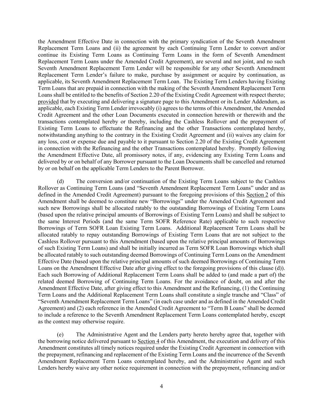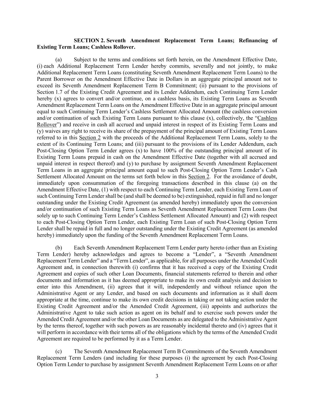3 SECTION 2. Seventh Amendment Replacement Term Loans; Refinancing of Existing Term Loans; Cashless Rollover. (a) Subject to the terms and conditions set forth herein, on the Amendment Effective Date, (i) each Additional Replacement Term Lender hereby commits, severally and not jointly, to make Additional Replacement Term Loans (constituting Seventh Amendment Replacement Term Loans) to the Parent Borrower on the Amendment Effective Date in Dollars in an aggregate principal amount not to exceed its Seventh Amendment Replacement Term B Commitment; (ii) pursuant to the provisions of Section 1.7 of the Existing Credit Agreement and its Lender Addendum, each Continuing Term Lender hereby (x) agrees to convert and/or continue, on a cashless basis, its Existing Term Loans as Seventh Amendment Replacement Term Loans on the Amendment Effective Date in an aggregate principal amount equal to such Continuing Term Lender’s Cashless Settlement Allocated Amount (the cashless conversion and/or continuation of such Existing Term Loans pursuant to this clause (x), collectively, the “Cashless Rollover”) and receive in cash all accrued and unpaid interest in respect of its Existing Term Loans and (y) waives any right to receive its share of the prepayment of the principal amount of Existing Term Loans referred to in this Section 2 with the proceeds of the Additional Replacement Term Loans, solely to the extent of its Continuing Term Loans; and (iii) pursuant to the provisions of its Lender Addendum, each Post-Closing Option Term Lender agrees (x) to have 100% of the outstanding principal amount of its Existing Term Loans prepaid in cash on the Amendment Effective Date (together with all accrued and unpaid interest in respect thereof) and (y) to purchase by assignment Seventh Amendment Replacement Term Loans in an aggregate principal amount equal to such Post-Closing Option Term Lender’s Cash Settlement Allocated Amount on the terms set forth below in this Section 2. For the avoidance of doubt, immediately upon consummation of the foregoing transactions described in this clause (a) on the Amendment Effective Date, (1) with respect to each Continuing Term Lender, each Existing Term Loan of such Continuing Term Lender shall be (and shall be deemed to be) extinguished, repaid in full and no longer outstanding under the Existing Credit Agreement (as amended hereby) immediately upon the conversion and/or continuation of such Existing Term Loans as Seventh Amendment Replacement Term Loans (but solely up to such Continuing Term Lender’s Cashless Settlement Allocated Amount) and (2) with respect to each Post-Closing Option Term Lender, each Existing Term Loan of such Post-Closing Option Term Lender shall be repaid in full and no longer outstanding under the Existing Credit Agreement (as amended hereby) immediately upon the funding of the Seventh Amendment Replacement Term Loans. (b) Each Seventh Amendment Replacement Term Lender party hereto (other than an Existing Term Lender) hereby acknowledges and agrees to become a “Lender”, a “Seventh Amendment Replacement Term Lender” and a “Term Lender”, as applicable, for all purposes under the Amended Credit Agreement and, in connection therewith (i) confirms that it has received a copy of the Existing Credit Agreement and copies of such other Loan Documents, financial statements referred to therein and other documents and information as it has deemed appropriate to make its own credit analysis and decision to enter into this Amendment, (ii) agrees that it will, independently and without reliance upon the Administrative Agent or any Lender, and based on such documents and information as it shall deem appropriate at the time, continue to make its own credit decisions in taking or not taking action under the Existing Credit Agreement and/or the Amended Credit Agreement, (iii) appoints and authorizes the Administrative Agent to take such action as agent on its behalf and to exercise such powers under the Amended Credit Agreement and/or the other Loan Documents as are delegated to the Administrative Agent by the terms thereof, together with such powers as are reasonably incidental thereto and (iv) agrees that it will perform in accordance with their terms all of the obligations which by the terms of the Amended Credit Agreement are required to be performed by it as a Term Lender. (c) The Seventh Amendment Replacement Term B Commitments of the Seventh Amendment Replacement Term Lenders (and including for these purposes (i) the agreement by each Post-Closing Option Term Lender to purchase by assignment Seventh Amendment Replacement Term Loans on or after