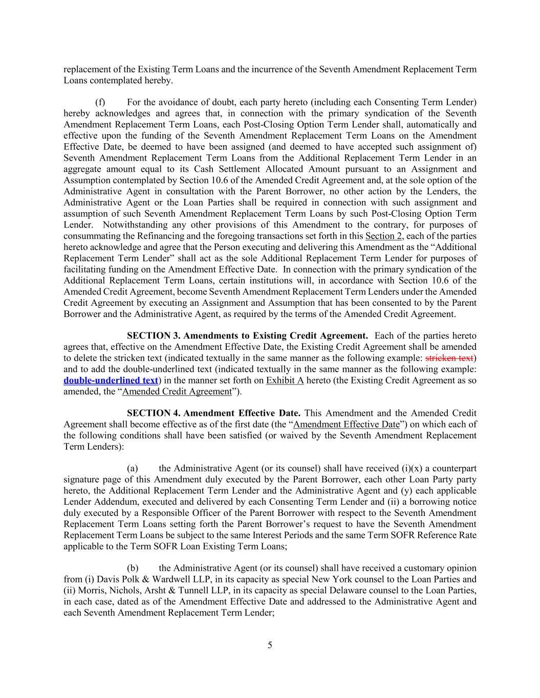 5 replacement of the Existing Term Loans and the incurrence of the Seventh Amendment Replacement Term Loans contemplated hereby. (f) For the avoidance of doubt, each party hereto (including each Consenting Term Lender) hereby acknowledges and agrees that, in connection with the primary syndication of the Seventh Amendment Replacement Term Loans, each Post-Closing Option Term Lender shall, automatically and effective upon the funding of the Seventh Amendment Replacement Term Loans on the Amendment Effective Date, be deemed to have been assigned (and deemed to have accepted such assignment of) Seventh Amendment Replacement Term Loans from the Additional Replacement Term Lender in an aggregate amount equal to its Cash Settlement Allocated Amount pursuant to an Assignment and Assumption contemplated by Section 10.6 of the Amended Credit Agreement and, at the sole option of the Administrative Agent in consultation with the Parent Borrower, no other action by the Lenders, the Administrative Agent or the Loan Parties shall be required in connection with such assignment and assumption of such Seventh Amendment Replacement Term Loans by such Post-Closing Option Term Lender. Notwithstanding any other provisions of this Amendment to the contrary, for purposes of consummating the Refinancing and the foregoing transactions set forth in this Section 2, each of the parties hereto acknowledge and agree that the Person executing and delivering this Amendment as the “Additional Replacement Term Lender” shall act as the sole Additional Replacement Term Lender for purposes of facilitating funding on the Amendment Effective Date. In connection with the primary syndication of the Additional Replacement Term Loans, certain institutions will, in accordance with Section 10.6 of the Amended Credit Agreement, become Seventh Amendment Replacement Term Lenders under the Amended Credit Agreement by executing an Assignment and Assumption that has been consented to by the Parent Borrower and the Administrative Agent, as required by the terms of the Amended Credit Agreement. SECTION 3. Amendments to Existing Credit Agreement. Each of the parties hereto agrees that, effective on the Amendment Effective Date, the Existing Credit Agreement shall be amended to delete the stricken text (indicated textually in the same manner as the following example: stricken text) and to add the double-underlined text (indicated textually in the same manner as the following example: double-underlined text) in the manner set forth on Exhibit A hereto (the Existing Credit Agreement as so amended, the “Amended Credit Agreement”). SECTION 4. Amendment Effective Date. This Amendment and the Amended Credit Agreement shall become effective as of the first date (the “Amendment Effective Date”) on which each of the following conditions shall have been satisfied (or waived by the Seventh Amendment Replacement Term Lenders): (a) the Administrative Agent (or its counsel) shall have received (i)(x) a counterpart signature page of this Amendment duly executed by the Parent Borrower, each other Loan Party party hereto, the Additional Replacement Term Lender and the Administrative Agent and (y) each applicable Lender Addendum, executed and delivered by each Consenting Term Lender and (ii) a borrowing notice duly executed by a Responsible Officer of the Parent Borrower with respect to the Seventh Amendment Replacement Term Loans setting forth the Parent Borrower’s request to have the Seventh Amendment Replacement Term Loans be subject to the same Interest Periods and the same Term SOFR Reference Rate applicable to the Term SOFR Loan Existing Term Loans; (b) the Administrative Agent (or its counsel) shall have received a customary opinion from (i) Davis Polk & Wardwell LLP, in its capacity as special New York counsel to the Loan Parties and (ii) Morris, Nichols, Arsht & Tunnell LLP, in its capacity as special Delaware counsel to the Loan Parties, in each case, dated as of the Amendment Effective Date and addressed to the Administrative Agent and each Seventh Amendment Replacement Term Lender;