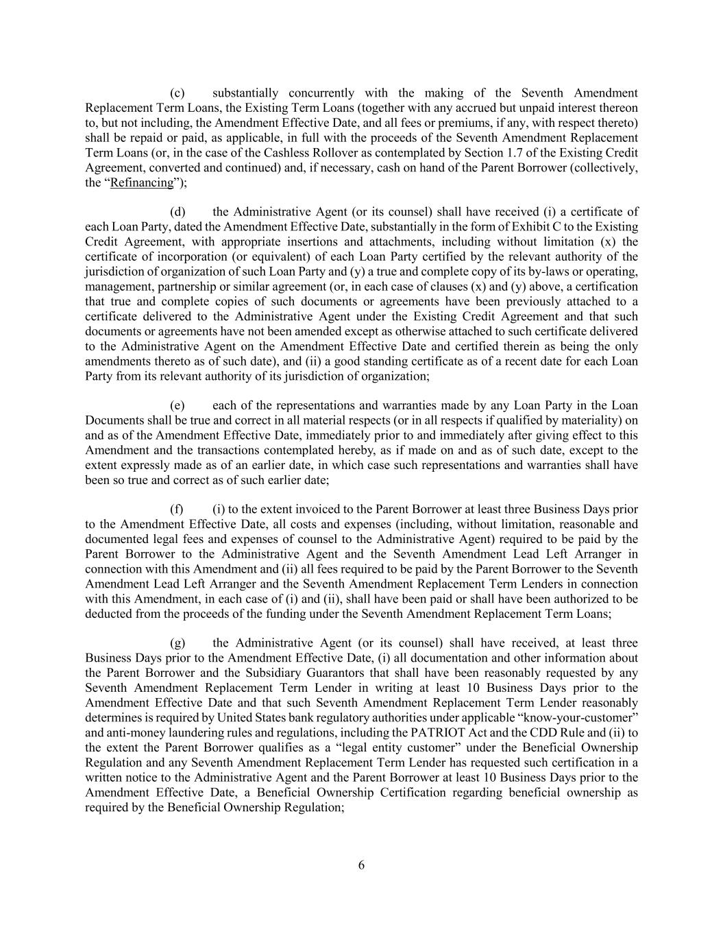 6 (c) substantially concurrently with the making of the Seventh Amendment Replacement Term Loans, the Existing Term Loans (together with any accrued but unpaid interest thereon to, but not including, the Amendment Effective Date, and all fees or premiums, if any, with respect thereto) shall be repaid or paid, as applicable, in full with the proceeds of the Seventh Amendment Replacement Term Loans (or, in the case of the Cashless Rollover as contemplated by Section 1.7 of the Existing Credit Agreement, converted and continued) and, if necessary, cash on hand of the Parent Borrower (collectively, the “Refinancing”); (d) the Administrative Agent (or its counsel) shall have received (i) a certificate of each Loan Party, dated the Amendment Effective Date, substantially in the form of Exhibit C to the Existing Credit Agreement, with appropriate insertions and attachments, including without limitation (x) the certificate of incorporation (or equivalent) of each Loan Party certified by the relevant authority of the jurisdiction of organization of such Loan Party and (y) a true and complete copy of its by-laws or operating, management, partnership or similar agreement (or, in each case of clauses (x) and (y) above, a certification that true and complete copies of such documents or agreements have been previously attached to a certificate delivered to the Administrative Agent under the Existing Credit Agreement and that such documents or agreements have not been amended except as otherwise attached to such certificate delivered to the Administrative Agent on the Amendment Effective Date and certified therein as being the only amendments thereto as of such date), and (ii) a good standing certificate as of a recent date for each Loan Party from its relevant authority of its jurisdiction of organization; (e) each of the representations and warranties made by any Loan Party in the Loan Documents shall be true and correct in all material respects (or in all respects if qualified by materiality) on and as of the Amendment Effective Date, immediately prior to and immediately after giving effect to this Amendment and the transactions contemplated hereby, as if made on and as of such date, except to the extent expressly made as of an earlier date, in which case such representations and warranties shall have been so true and correct as of such earlier date; (f) (i) to the extent invoiced to the Parent Borrower at least three Business Days prior to the Amendment Effective Date, all costs and expenses (including, without limitation, reasonable and documented legal fees and expenses of counsel to the Administrative Agent) required to be paid by the Parent Borrower to the Administrative Agent and the Seventh Amendment Lead Left Arranger in connection with this Amendment and (ii) all fees required to be paid by the Parent Borrower to the Seventh Amendment Lead Left Arranger and the Seventh Amendment Replacement Term Lenders in connection with this Amendment, in each case of (i) and (ii), shall have been paid or shall have been authorized to be deducted from the proceeds of the funding under the Seventh Amendment Replacement Term Loans; (g) the Administrative Agent (or its counsel) shall have received, at least three Business Days prior to the Amendment Effective Date, (i) all documentation and other information about the Parent Borrower and the Subsidiary Guarantors that shall have been reasonably requested by any Seventh Amendment Replacement Term Lender in writing at least 10 Business Days prior to the Amendment Effective Date and that such Seventh Amendment Replacement Term Lender reasonably determines is required by United States bank regulatory authorities under applicable “know-your-customer” and anti-money laundering rules and regulations, including the PATRIOT Act and the CDD Rule and (ii) to the extent the Parent Borrower qualifies as a “legal entity customer” under the Beneficial Ownership Regulation and any Seventh Amendment Replacement Term Lender has requested such certification in a written notice to the Administrative Agent and the Parent Borrower at least 10 Business Days prior to the Amendment Effective Date, a Beneficial Ownership Certification regarding beneficial ownership as required by the Beneficial Ownership Regulation;