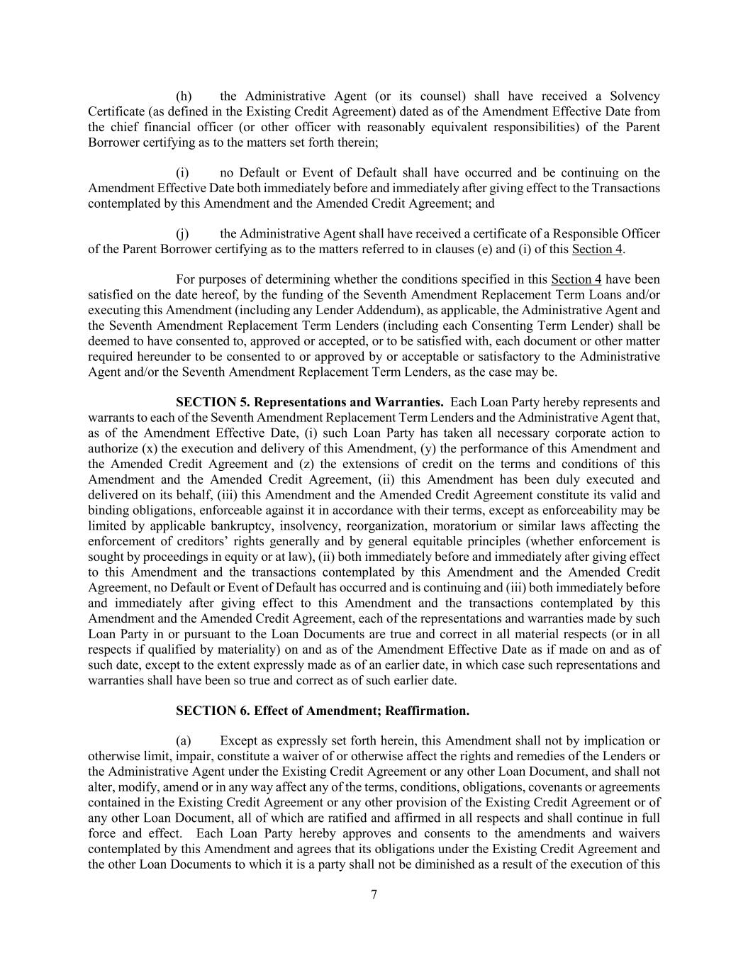 7 (h) the Administrative Agent (or its counsel) shall have received a Solvency Certificate (as defined in the Existing Credit Agreement) dated as of the Amendment Effective Date from the chief financial officer (or other officer with reasonably equivalent responsibilities) of the Parent Borrower certifying as to the matters set forth therein; (i) no Default or Event of Default shall have occurred and be continuing on the Amendment Effective Date both immediately before and immediately after giving effect to the Transactions contemplated by this Amendment and the Amended Credit Agreement; and (j) the Administrative Agent shall have received a certificate of a Responsible Officer of the Parent Borrower certifying as to the matters referred to in clauses (e) and (i) of this Section 4. For purposes of determining whether the conditions specified in this Section 4 have been satisfied on the date hereof, by the funding of the Seventh Amendment Replacement Term Loans and/or executing this Amendment (including any Lender Addendum), as applicable, the Administrative Agent and the Seventh Amendment Replacement Term Lenders (including each Consenting Term Lender) shall be deemed to have consented to, approved or accepted, or to be satisfied with, each document or other matter required hereunder to be consented to or approved by or acceptable or satisfactory to the Administrative Agent and/or the Seventh Amendment Replacement Term Lenders, as the case may be. SECTION 5. Representations and Warranties. Each Loan Party hereby represents and warrants to each of the Seventh Amendment Replacement Term Lenders and the Administrative Agent that, as of the Amendment Effective Date, (i) such Loan Party has taken all necessary corporate action to authorize (x) the execution and delivery of this Amendment, (y) the performance of this Amendment and the Amended Credit Agreement and (z) the extensions of credit on the terms and conditions of this Amendment and the Amended Credit Agreement, (ii) this Amendment has been duly executed and delivered on its behalf, (iii) this Amendment and the Amended Credit Agreement constitute its valid and binding obligations, enforceable against it in accordance with their terms, except as enforceability may be limited by applicable bankruptcy, insolvency, reorganization, moratorium or similar laws affecting the enforcement of creditors’ rights generally and by general equitable principles (whether enforcement is sought by proceedings in equity or at law), (ii) both immediately before and immediately after giving effect to this Amendment and the transactions contemplated by this Amendment and the Amended Credit Agreement, no Default or Event of Default has occurred and is continuing and (iii) both immediately before and immediately after giving effect to this Amendment and the transactions contemplated by this Amendment and the Amended Credit Agreement, each of the representations and warranties made by such Loan Party in or pursuant to the Loan Documents are true and correct in all material respects (or in all respects if qualified by materiality) on and as of the Amendment Effective Date as if made on and as of such date, except to the extent expressly made as of an earlier date, in which case such representations and warranties shall have been so true and correct as of such earlier date. SECTION 6. Effect of Amendment; Reaffirmation. (a) Except as expressly set forth herein, this Amendment shall not by implication or otherwise limit, impair, constitute a waiver of or otherwise affect the rights and remedies of the Lenders or the Administrative Agent under the Existing Credit Agreement or any other Loan Document, and shall not alter, modify, amend or in any way affect any of the terms, conditions, obligations, covenants or agreements contained in the Existing Credit Agreement or any other provision of the Existing Credit Agreement or of any other Loan Document, all of which are ratified and affirmed in all respects and shall continue in full force and effect. Each Loan Party hereby approves and consents to the amendments and waivers contemplated by this Amendment and agrees that its obligations under the Existing Credit Agreement and the other Loan Documents to which it is a party shall not be diminished as a result of the execution of this