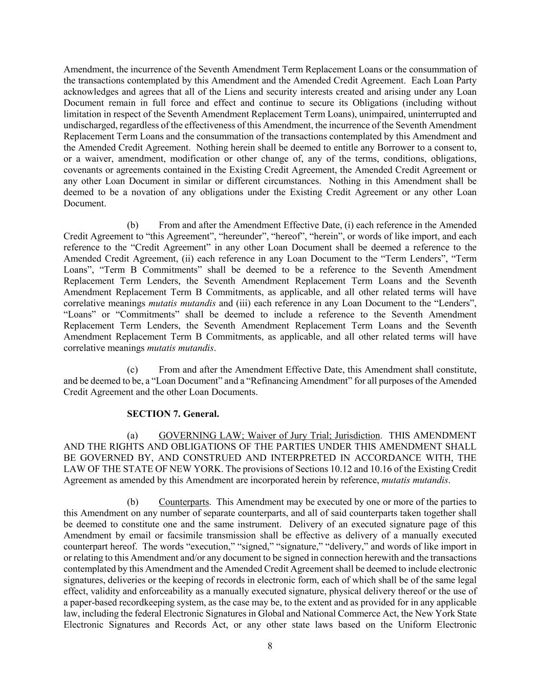 8 Amendment, the incurrence of the Seventh Amendment Term Replacement Loans or the consummation of the transactions contemplated by this Amendment and the Amended Credit Agreement. Each Loan Party acknowledges and agrees that all of the Liens and security interests created and arising under any Loan Document remain in full force and effect and continue to secure its Obligations (including without limitation in respect of the Seventh Amendment Replacement Term Loans), unimpaired, uninterrupted and undischarged, regardless of the effectiveness of this Amendment, the incurrence of the Seventh Amendment Replacement Term Loans and the consummation of the transactions contemplated by this Amendment and the Amended Credit Agreement. Nothing herein shall be deemed to entitle any Borrower to a consent to, or a waiver, amendment, modification or other change of, any of the terms, conditions, obligations, covenants or agreements contained in the Existing Credit Agreement, the Amended Credit Agreement or any other Loan Document in similar or different circumstances. Nothing in this Amendment shall be deemed to be a novation of any obligations under the Existing Credit Agreement or any other Loan Document. (b) From and after the Amendment Effective Date, (i) each reference in the Amended Credit Agreement to “this Agreement”, “hereunder”, “hereof”, “herein”, or words of like import, and each reference to the “Credit Agreement” in any other Loan Document shall be deemed a reference to the Amended Credit Agreement, (ii) each reference in any Loan Document to the “Term Lenders”, “Term Loans”, “Term B Commitments” shall be deemed to be a reference to the Seventh Amendment Replacement Term Lenders, the Seventh Amendment Replacement Term Loans and the Seventh Amendment Replacement Term B Commitments, as applicable, and all other related terms will have correlative meanings mutatis mutandis and (iii) each reference in any Loan Document to the “Lenders”, “Loans” or “Commitments” shall be deemed to include a reference to the Seventh Amendment Replacement Term Lenders, the Seventh Amendment Replacement Term Loans and the Seventh Amendment Replacement Term B Commitments, as applicable, and all other related terms will have correlative meanings mutatis mutandis. (c) From and after the Amendment Effective Date, this Amendment shall constitute, and be deemed to be, a “Loan Document” and a “Refinancing Amendment” for all purposes of the Amended Credit Agreement and the other Loan Documents. SECTION 7. General. (a) GOVERNING LAW; Waiver of Jury Trial; Jurisdiction. THIS AMENDMENT AND THE RIGHTS AND OBLIGATIONS OF THE PARTIES UNDER THIS AMENDMENT SHALL BE GOVERNED BY, AND CONSTRUED AND INTERPRETED IN ACCORDANCE WITH, THE LAW OF THE STATE OF NEW YORK. The provisions of Sections 10.12 and 10.16 of the Existing Credit Agreement as amended by this Amendment are incorporated herein by reference, mutatis mutandis. (b) Counterparts. This Amendment may be executed by one or more of the parties to this Amendment on any number of separate counterparts, and all of said counterparts taken together shall be deemed to constitute one and the same instrument. Delivery of an executed signature page of this Amendment by email or facsimile transmission shall be effective as delivery of a manually executed counterpart hereof. The words “execution,” “signed,” “signature,” “delivery,” and words of like import in or relating to this Amendment and/or any document to be signed in connection herewith and the transactions contemplated by this Amendment and the Amended Credit Agreement shall be deemed to include electronic signatures, deliveries or the keeping of records in electronic form, each of which shall be of the same legal effect, validity and enforceability as a manually executed signature, physical delivery thereof or the use of a paper-based recordkeeping system, as the case may be, to the extent and as provided for in any applicable law, including the federal Electronic Signatures in Global and National Commerce Act, the New York State Electronic Signatures and Records Act, or any other state laws based on the Uniform Electronic