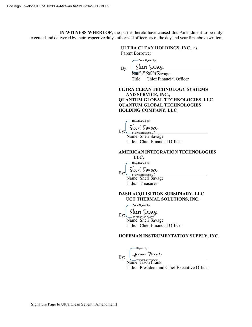 [Signature Page to Ultra Clean Seventh Amendment] IN WITNESS WHEREOF, the parties hereto have caused this Amendment to be duly executed and delivered by their respective duly authorized officers as of the day and year first above written. ULTRA CLEAN HOLDINGS, INC., as Parent Borrower By: Name: Sheri Savage Title: Chief Financial Officer ULTRA CLEAN TECHNOLOGY SYSTEMS AND SERVICE, INC., QUANTUM GLOBAL TECHNOLOGIES, LLC QUANTUM GLOBAL TECHNOLOGIES HOLDING COMPANY, LLC By: Name: Sheri Savage Title: Chief Financial Officer AMERICAN INTEGRATION TECHNOLOGIES LLC, By: Name: Sheri Savage Title: Treasurer DASH ACQUISITION SUBSIDIARY, LLC UCT THERMAL SOLUTIONS, INC. By: Name: Sheri Savage Title: Chief Financial Officer HOFFMAN INSTRUMENTATION SUPPLY, INC. By: Name: Jason Frank Title: President and Chief Executive Officer Docusign Envelope ID: 7ADD2BE4-4A85-46BA-92C5-262986E83BE9