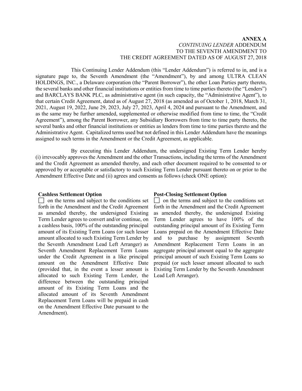 ANNEX A CONTINUING LENDER ADDENDUM TO THE SEVENTH AMENDMENT TO THE CREDIT AGREEMENT DATED AS OF AUGUST 27, 2018 This Continuing Lender Addendum (this “Lender Addendum”) is referred to in, and is a signature page to, the Seventh Amendment (the “Amendment”), by and among ULTRA CLEAN HOLDINGS, INC., a Delaware corporation (the “Parent Borrower”), the other Loan Parties party thereto, the several banks and other financial institutions or entities from time to time parties thereto (the “Lenders”) and BARCLAYS BANK PLC, as administrative agent (in such capacity, the “Administrative Agent”), to that certain Credit Agreement, dated as of August 27, 2018 (as amended as of October 1, 2018, March 31, 2021, August 19, 2022, June 29, 2023, July 27, 2023, April 4, 2024 and pursuant to the Amendment, and as the same may be further amended, supplemented or otherwise modified from time to time, the “Credit Agreement”), among the Parent Borrower, any Subsidiary Borrowers from time to time party thereto, the several banks and other financial institutions or entities as lenders from time to time parties thereto and the Administrative Agent. Capitalized terms used but not defined in this Lender Addendum have the meanings assigned to such terms in the Amendment or the Credit Agreement, as applicable. By executing this Lender Addendum, the undersigned Existing Term Lender hereby (i) irrevocably approves the Amendment and the other Transactions, including the terms of the Amendment and the Credit Agreement as amended thereby, and each other document required to be consented to or approved by or acceptable or satisfactory to such Existing Term Lender pursuant thereto on or prior to the Amendment Effective Date and (ii) agrees and consents as follows (check ONE option): Cashless Settlement Option on the terms and subject to the conditions set forth in the Amendment and the Credit Agreement as amended thereby, the undersigned Existing Term Lender agrees to convert and/or continue, on a cashless basis, 100% of the outstanding principal amount of its Existing Term Loans (or such lesser amount allocated to such Existing Term Lender by the Seventh Amendment Lead Left Arranger) as Seventh Amendment Replacement Term Loans under the Credit Agreement in a like principal amount on the Amendment Effective Date (provided that, in the event a lesser amount is allocated to such Existing Term Lender, the difference between the outstanding principal amount of its Existing Term Loans and the allocated amount of its Seventh Amendment Replacement Term Loans will be prepaid in cash on the Amendment Effective Date pursuant to the Amendment). Post-Closing Settlement Option on the terms and subject to the conditions set forth in the Amendment and the Credit Agreement as amended thereby, the undersigned Existing Term Lender agrees to have 100% of the outstanding principal amount of its Existing Term Loans prepaid on the Amendment Effective Date and to purchase by assignment Seventh Amendment Replacement Term Loans in an aggregate principal amount equal to the aggregate principal amount of such Existing Term Loans so prepaid (or such lesser amount allocated to such Existing Term Lender by the Seventh Amendment Lead Left Arranger).