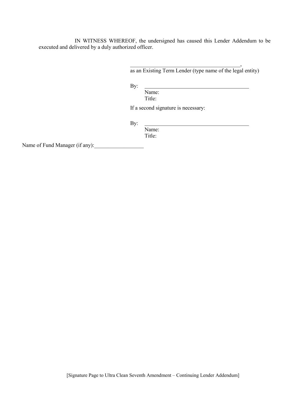 [Signature Page to Ultra Clean Seventh Amendment – Continuing Lender Addendum] IN WITNESS WHEREOF, the undersigned has caused this Lender Addendum to be executed and delivered by a duly authorized officer. ________________________________________, as an Existing Term Lender (type name of the legal entity) By: Name: Title: If a second signature is necessary: By: Name: Title: Name of Fund Manager (if any):__________________
