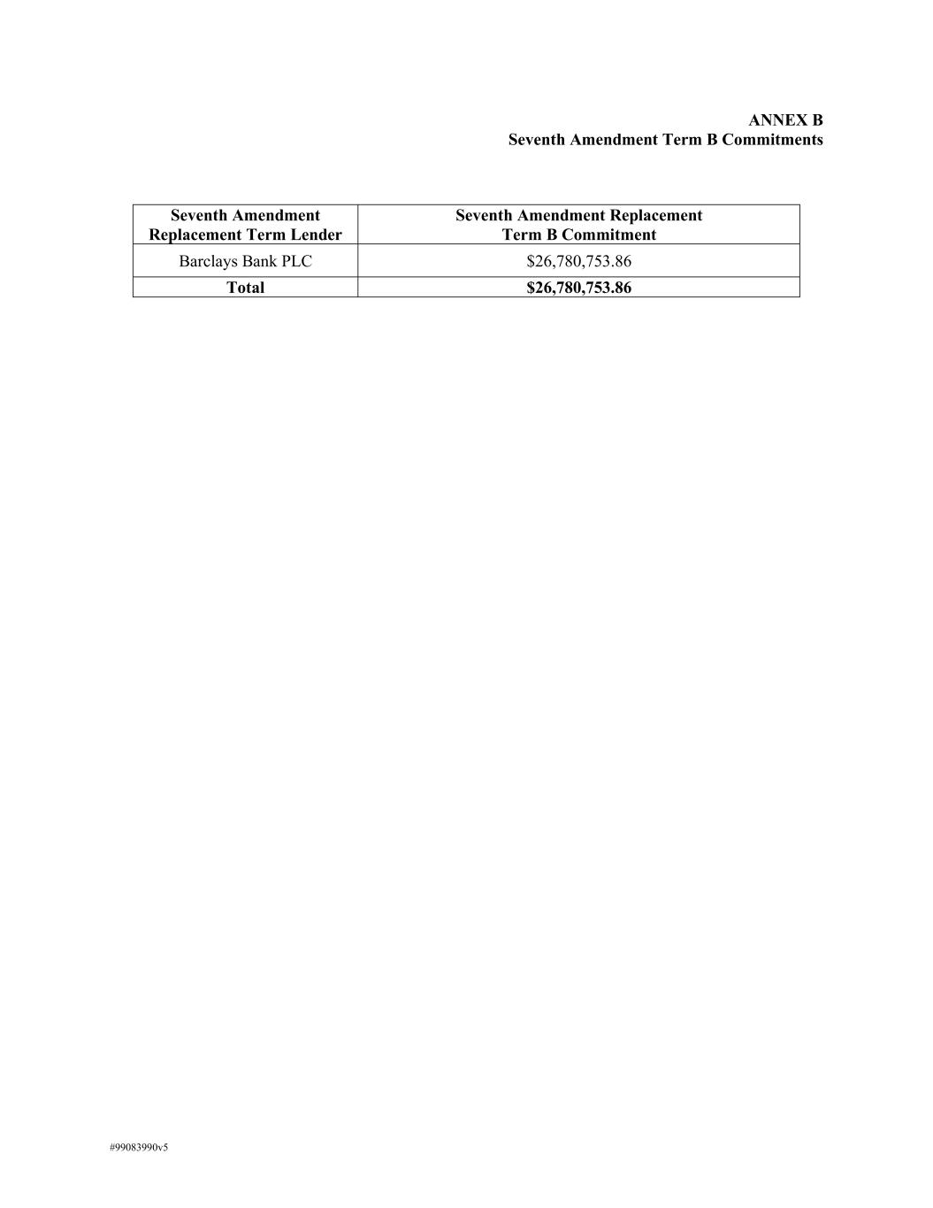 #99083990v5 ANNEX B Seventh Amendment Term B Commitments Seventh Amendment Replacement Term Lender Seventh Amendment Replacement Term B Commitment Barclays Bank PLC $26,780,753.86 Total $26,780,753.86
