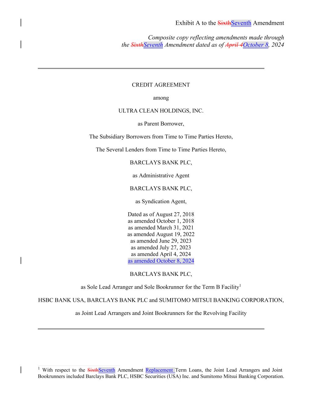Exhibit A to the SixthSeventh Amendment Composite copy reflecting amendments made through the SixthSeventh Amendment dated as of April 4October 8, 2024 ______________________________________________________________________________ CREDIT AGREEMENT among ULTRA CLEAN HOLDINGS, INC. as Parent Borrower, The Subsidiary Borrowers from Time to Time Parties Hereto, The Several Lenders from Time to Time Parties Hereto, BARCLAYS BANK PLC, as Administrative Agent BARCLAYS BANK PLC, as Syndication Agent, Dated as of August 27, 2018 as amended October 1, 2018 as amended March 31, 2021 as amended August 19, 2022 as amended June 29, 2023 as amended July 27, 2023 as amended April 4, 2024 as amended October 8, 2024 BARCLAYS BANK PLC, as Sole Lead Arranger and Sole Bookrunner for the Term B Facility1 HSBC BANK USA, BARCLAYS BANK PLC and SUMITOMO MITSUI BANKING CORPORATION, as Joint Lead Arrangers and Joint Bookrunners for the Revolving Facility ______________________________________________________________________________ 1 With respect to the SixthSeventh Amendment Replacement Term Loans, the Joint Lead Arrangers and Joint Bookrunners included Barclays Bank PLC, HSBC Securities (USA) Inc. and Sumitomo Mitsui Banking Corporation.