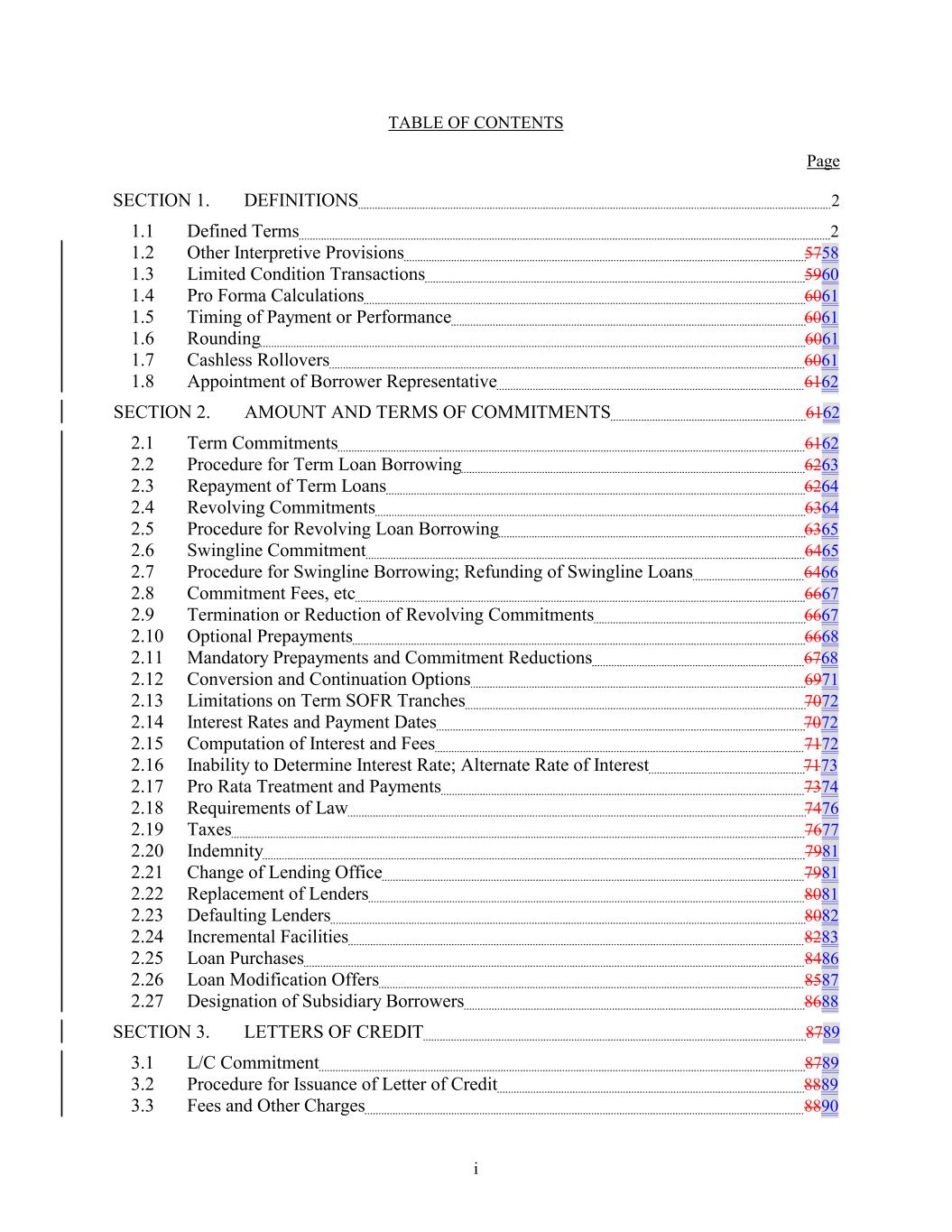 TABLE OF CONTENTS Page SECTION 1. DEFINITIONS 2 1.1 Defined Terms 2 1.2 Other Interpretive Provisions 5758 1.3 Limited Condition Transactions 5960 1.4 Pro Forma Calculations 6061 1.5 Timing of Payment or Performance 6061 1.6 Rounding 6061 1.7 Cashless Rollovers 6061 1.8 Appointment of Borrower Representative 6162 SECTION 2. AMOUNT AND TERMS OF COMMITMENTS 6162 2.1 Term Commitments 6162 2.2 Procedure for Term Loan Borrowing 6263 2.3 Repayment of Term Loans 6264 2.4 Revolving Commitments 6364 2.5 Procedure for Revolving Loan Borrowing 6365 2.6 Swingline Commitment 6465 2.7 Procedure for Swingline Borrowing; Refunding of Swingline Loans 6466 2.8 Commitment Fees, etc 6667 2.9 Termination or Reduction of Revolving Commitments 6667 2.10 Optional Prepayments 6668 2.11 Mandatory Prepayments and Commitment Reductions 6768 2.12 Conversion and Continuation Options 6971 2.13 Limitations on Term SOFR Tranches 7072 2.14 Interest Rates and Payment Dates 7072 2.15 Computation of Interest and Fees 7172 2.16 Inability to Determine Interest Rate; Alternate Rate of Interest 7173 2.17 Pro Rata Treatment and Payments 7374 2.18 Requirements of Law 7476 2.19 Taxes 7677 2.20 Indemnity 7981 2.21 Change of Lending Office 7981 2.22 Replacement of Lenders 8081 2.23 Defaulting Lenders 8082 2.24 Incremental Facilities 8283 2.25 Loan Purchases 8486 2.26 Loan Modification Offers 8587 2.27 Designation of Subsidiary Borrowers 8688 SECTION 3. LETTERS OF CREDIT 8789 3.1 L/C Commitment 8789 3.2 Procedure for Issuance of Letter of Credit 8889 3.3 Fees and Other Charges 8890 i