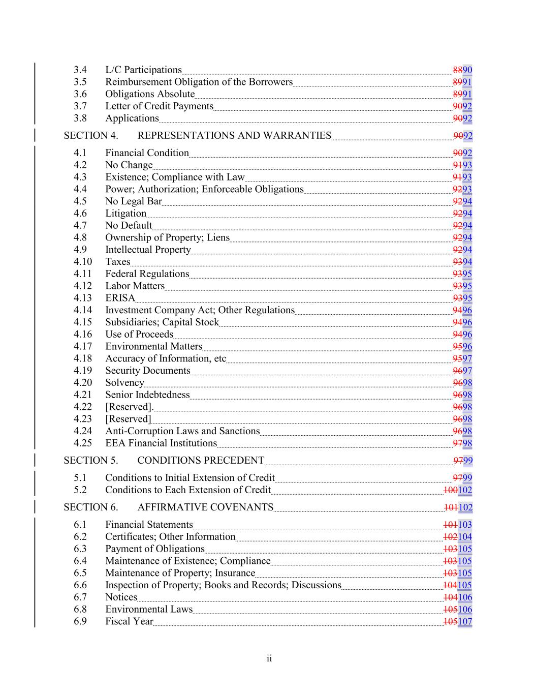 3.4 L/C Participations 8890 3.5 Reimbursement Obligation of the Borrowers 8991 3.6 Obligations Absolute 8991 3.7 Letter of Credit Payments 9092 3.8 Applications 9092 SECTION 4. REPRESENTATIONS AND WARRANTIES 9092 4.1 Financial Condition 9092 4.2 No Change 9193 4.3 Existence; Compliance with Law 9193 4.4 Power; Authorization; Enforceable Obligations 9293 4.5 No Legal Bar 9294 4.6 Litigation 9294 4.7 No Default 9294 4.8 Ownership of Property; Liens 9294 4.9 Intellectual Property 9294 4.10 Taxes 9394 4.11 Federal Regulations 9395 4.12 Labor Matters 9395 4.13 ERISA 9395 4.14 Investment Company Act; Other Regulations 9496 4.15 Subsidiaries; Capital Stock 9496 4.16 Use of Proceeds 9496 4.17 Environmental Matters 9596 4.18 Accuracy of Information, etc 9597 4.19 Security Documents 9697 4.20 Solvency 9698 4.21 Senior Indebtedness 9698 4.22 [Reserved]. 9698 4.23 [Reserved] 9698 4.24 Anti-Corruption Laws and Sanctions 9698 4.25 EEA Financial Institutions 9798 SECTION 5. CONDITIONS PRECEDENT 9799 5.1 Conditions to Initial Extension of Credit 9799 5.2 Conditions to Each Extension of Credit 100102 SECTION 6. AFFIRMATIVE COVENANTS 101102 6.1 Financial Statements 101103 6.2 Certificates; Other Information 102104 6.3 Payment of Obligations 103105 6.4 Maintenance of Existence; Compliance 103105 6.5 Maintenance of Property; Insurance 103105 6.6 Inspection of Property; Books and Records; Discussions 104105 6.7 Notices 104106 6.8 Environmental Laws 105106 6.9 Fiscal Year 105107 ii