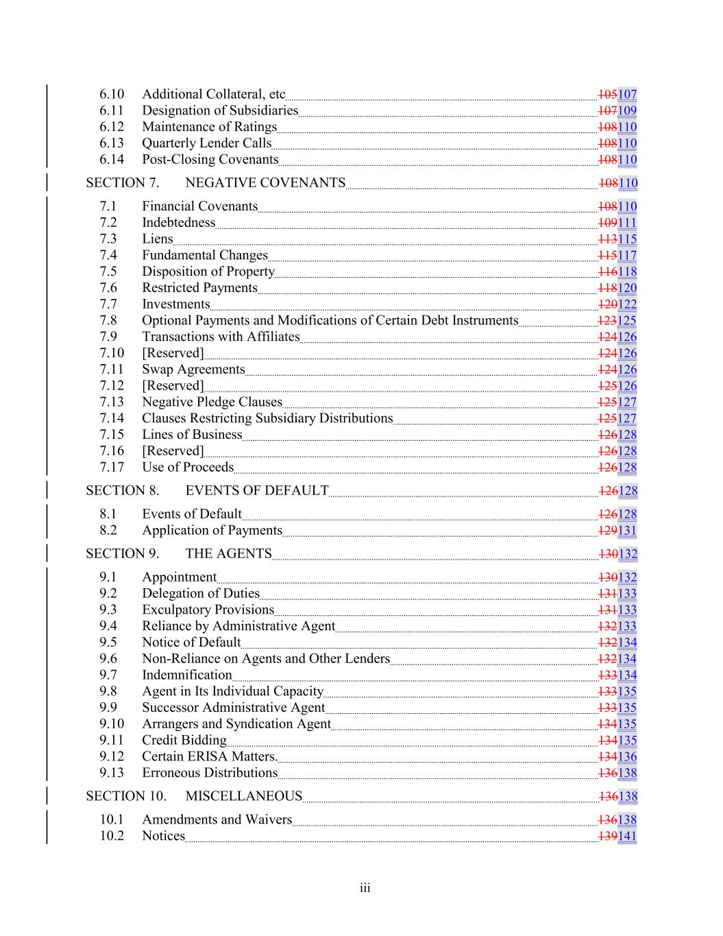 6.10 Additional Collateral, etc 105107 6.11 Designation of Subsidiaries 107109 6.12 Maintenance of Ratings 108110 6.13 Quarterly Lender Calls 108110 6.14 Post-Closing Covenants 108110 SECTION 7. NEGATIVE COVENANTS 108110 7.1 Financial Covenants 108110 7.2 Indebtedness 109111 7.3 Liens 113115 7.4 Fundamental Changes 115117 7.5 Disposition of Property 116118 7.6 Restricted Payments 118120 7.7 Investments 120122 7.8 Optional Payments and Modifications of Certain Debt Instruments 123125 7.9 Transactions with Affiliates 124126 7.10 [Reserved] 124126 7.11 Swap Agreements 124126 7.12 [Reserved] 125126 7.13 Negative Pledge Clauses 125127 7.14 Clauses Restricting Subsidiary Distributions 125127 7.15 Lines of Business 126128 7.16 [Reserved] 126128 7.17 Use of Proceeds 126128 SECTION 8. EVENTS OF DEFAULT 126128 8.1 Events of Default 126128 8.2 Application of Payments 129131 SECTION 9. THE AGENTS 130132 9.1 Appointment 130132 9.2 Delegation of Duties 131133 9.3 Exculpatory Provisions 131133 9.4 Reliance by Administrative Agent 132133 9.5 Notice of Default 132134 9.6 Non-Reliance on Agents and Other Lenders 132134 9.7 Indemnification 133134 9.8 Agent in Its Individual Capacity 133135 9.9 Successor Administrative Agent 133135 9.10 Arrangers and Syndication Agent 134135 9.11 Credit Bidding 134135 9.12 Certain ERISA Matters. 134136 9.13 Erroneous Distributions 136138 SECTION 10. MISCELLANEOUS 136138 10.1 Amendments and Waivers 136138 10.2 Notices 139141 iii