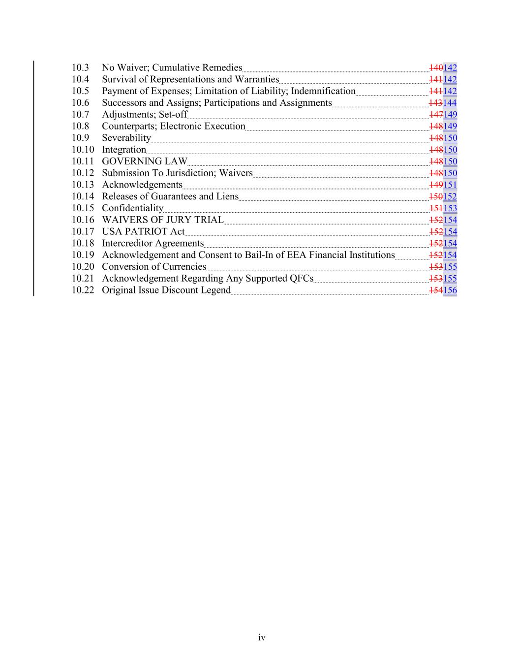 10.3 No Waiver; Cumulative Remedies 140142 10.4 Survival of Representations and Warranties 141142 10.5 Payment of Expenses; Limitation of Liability; Indemnification 141142 10.6 Successors and Assigns; Participations and Assignments 143144 10.7 Adjustments; Set-off 147149 10.8 Counterparts; Electronic Execution 148149 10.9 Severability 148150 10.10 Integration 148150 10.11 GOVERNING LAW 148150 10.12 Submission To Jurisdiction; Waivers 148150 10.13 Acknowledgements 149151 10.14 Releases of Guarantees and Liens 150152 10.15 Confidentiality 151153 10.16 WAIVERS OF JURY TRIAL 152154 10.17 USA PATRIOT Act 152154 10.18 Intercreditor Agreements 152154 10.19 Acknowledgement and Consent to Bail-In of EEA Financial Institutions 152154 10.20 Conversion of Currencies 153155 10.21 Acknowledgement Regarding Any Supported QFCs 153155 10.22 Original Issue Discount Legend 154156 iv